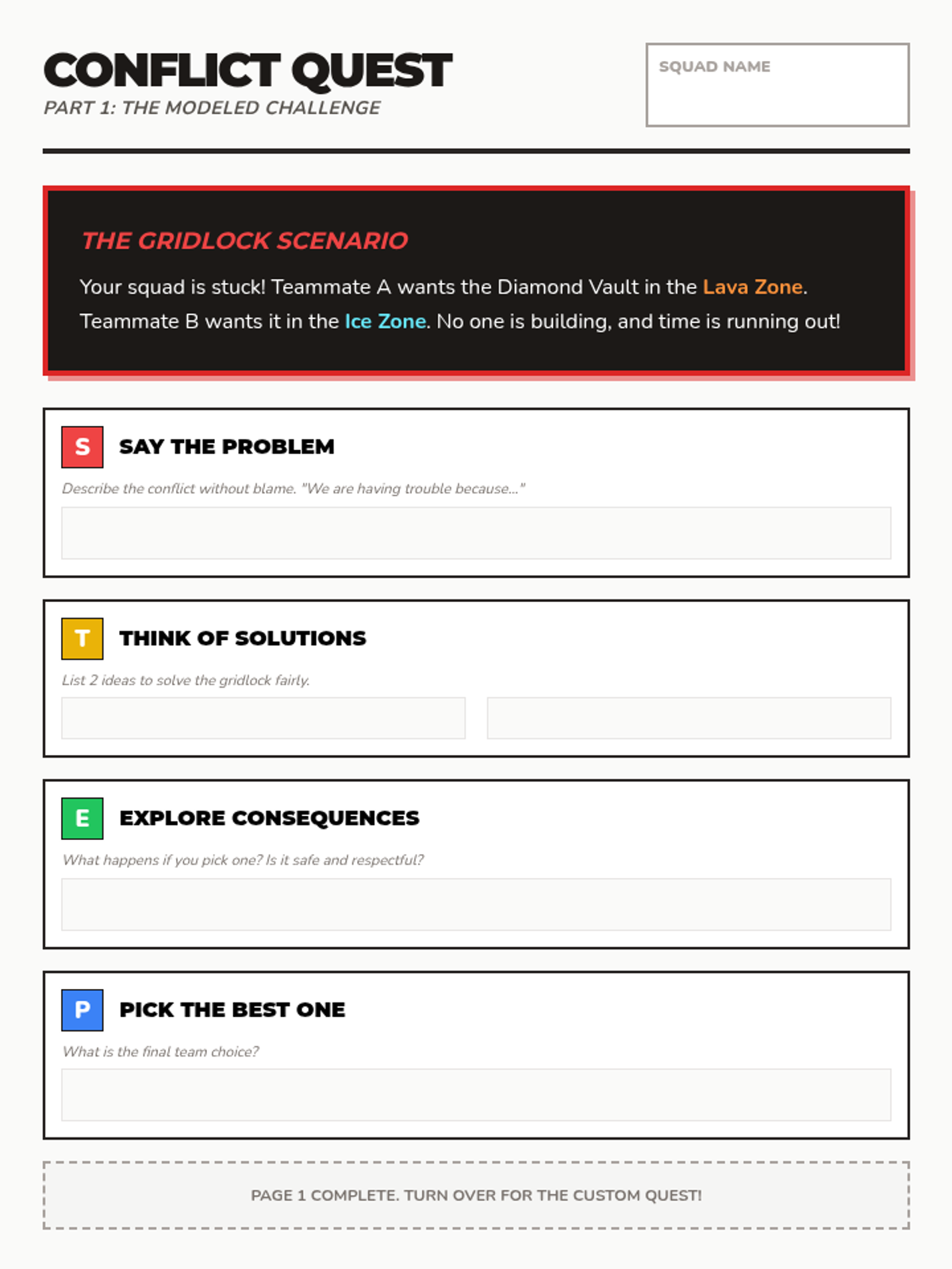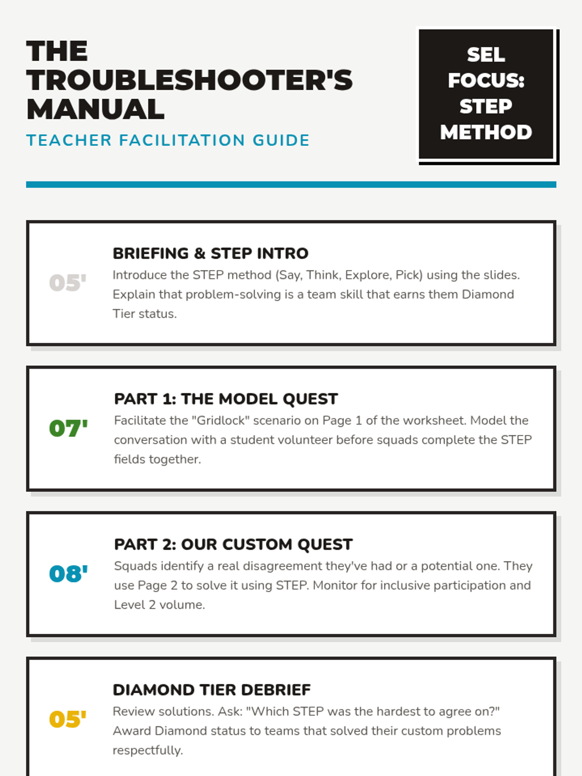 A Minecraft-themed SEL lesson teaching the STEP problem-solving method (Say, Think, Explore, Pick) alongside group work norms. Students apply STEP to resolve common collaborative conflicts while maintaining team inclusion and focus.