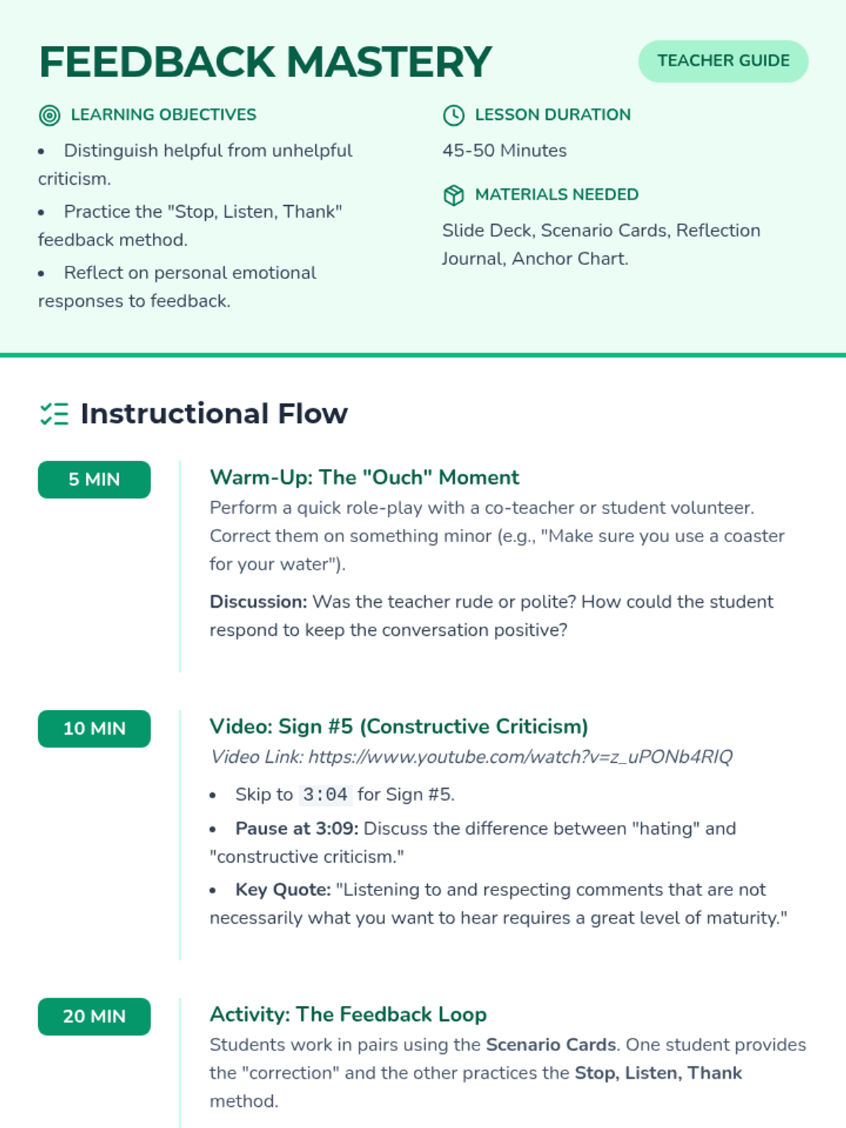 A life skills lesson for High School Special Education students focused on identifying constructive criticism and practicing the 'Stop, Listen, Thank' method for receiving feedback. Includes video-based discussion, role-play scenarios, and reflective journaling.