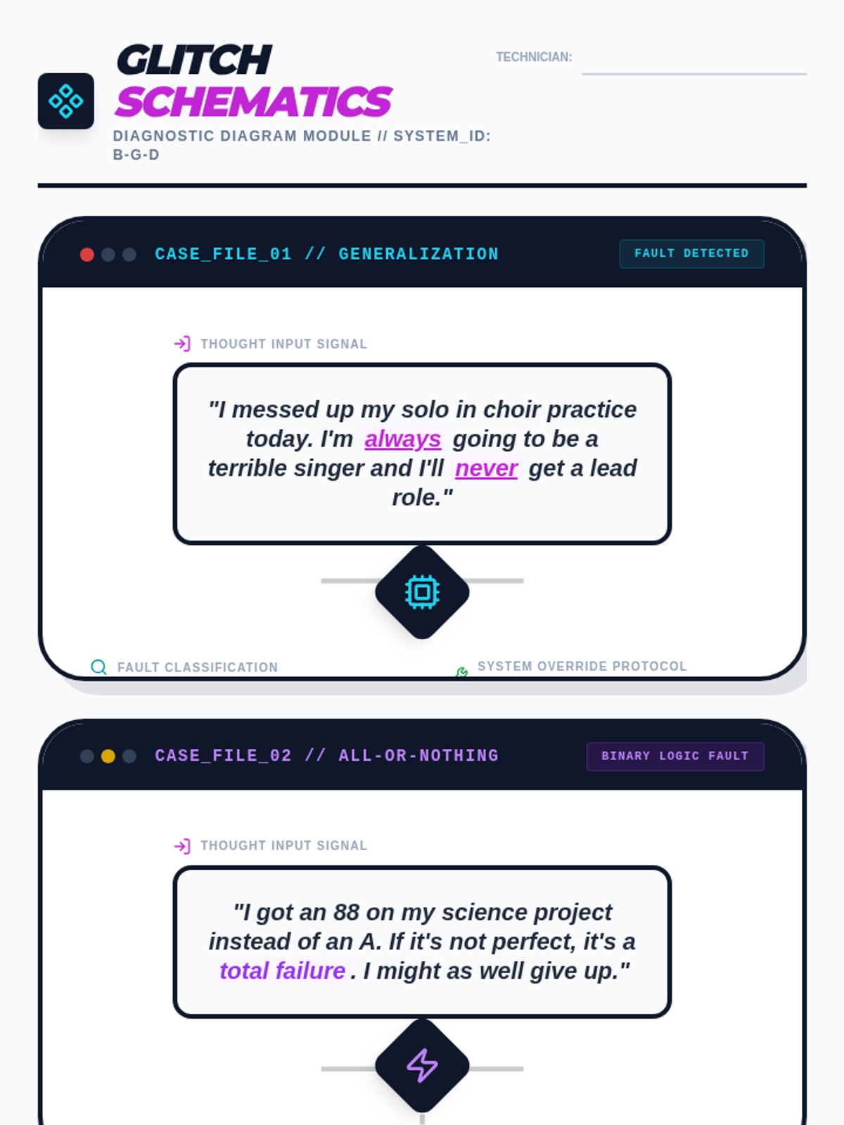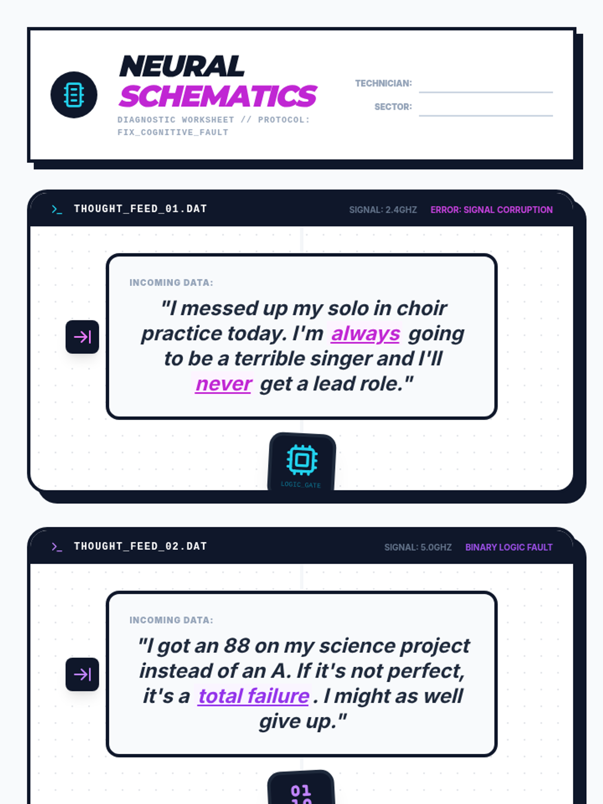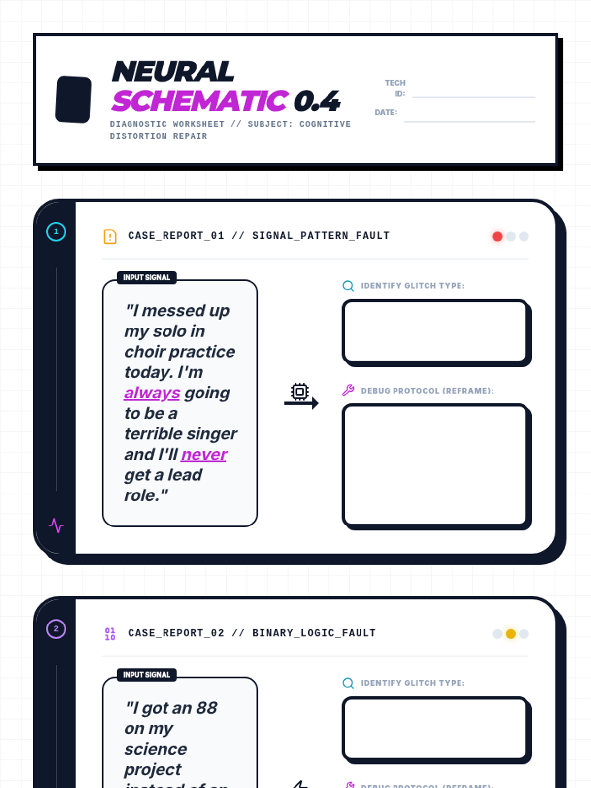 A 30-minute interactive lesson for middle schoolers to identify and challenge common cognitive distortions using a tech-inspired 'Brain Glitch' theme.