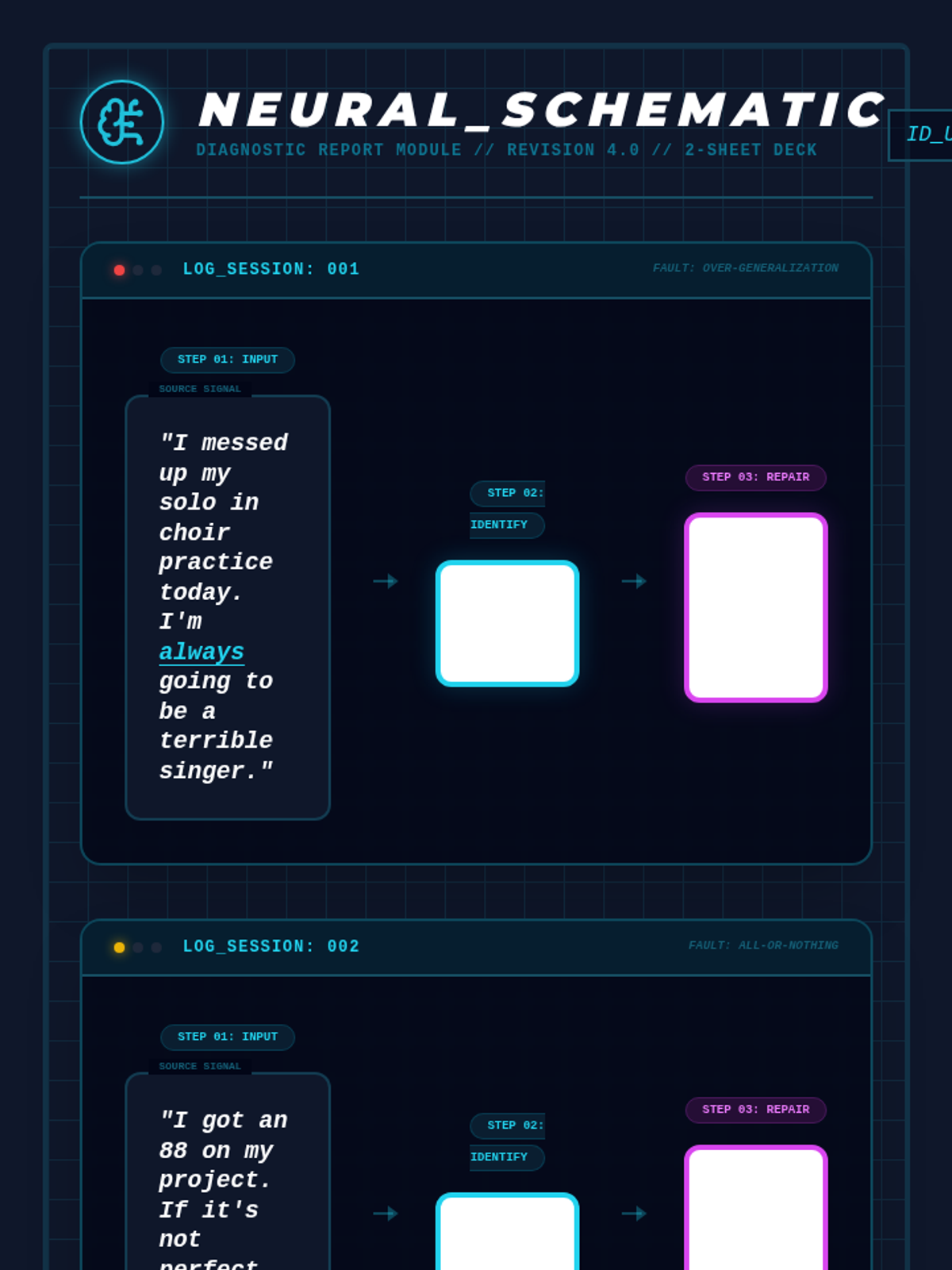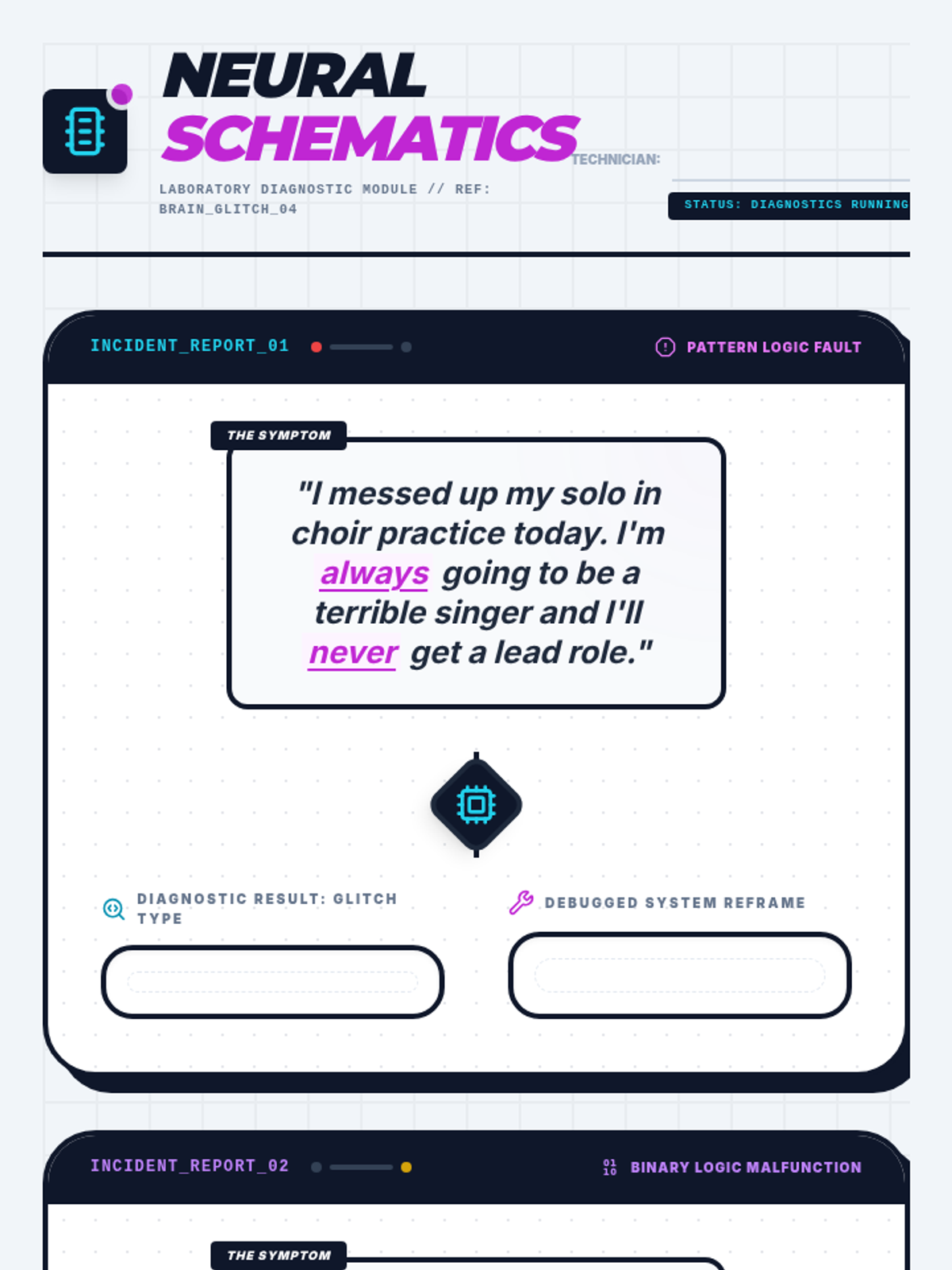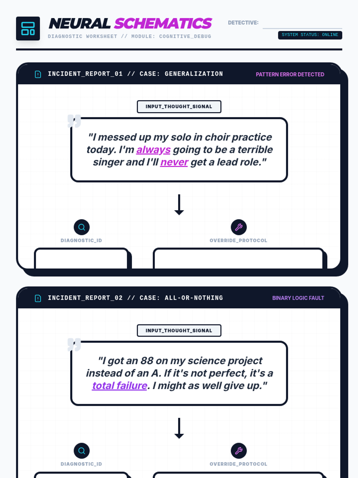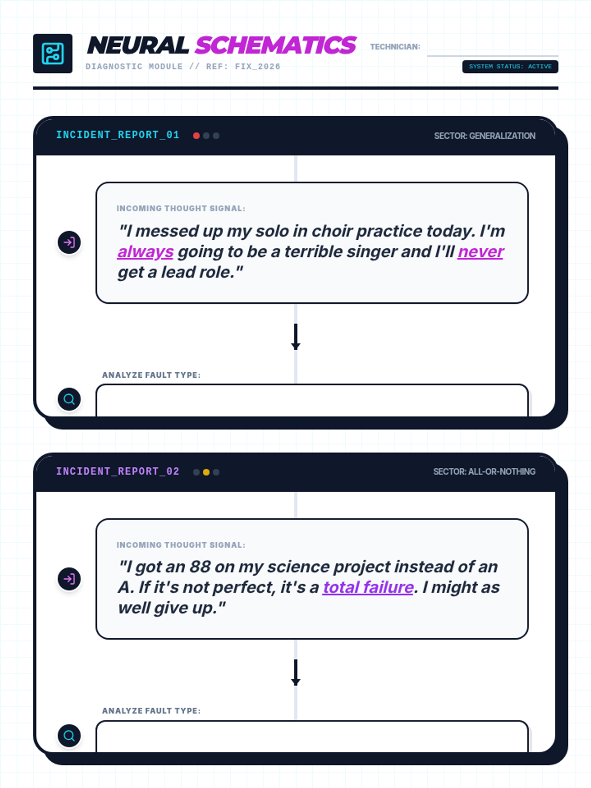A 30-minute interactive lesson for middle schoolers to identify and challenge common cognitive distortions using a tech-inspired 'Brain Glitch' theme.