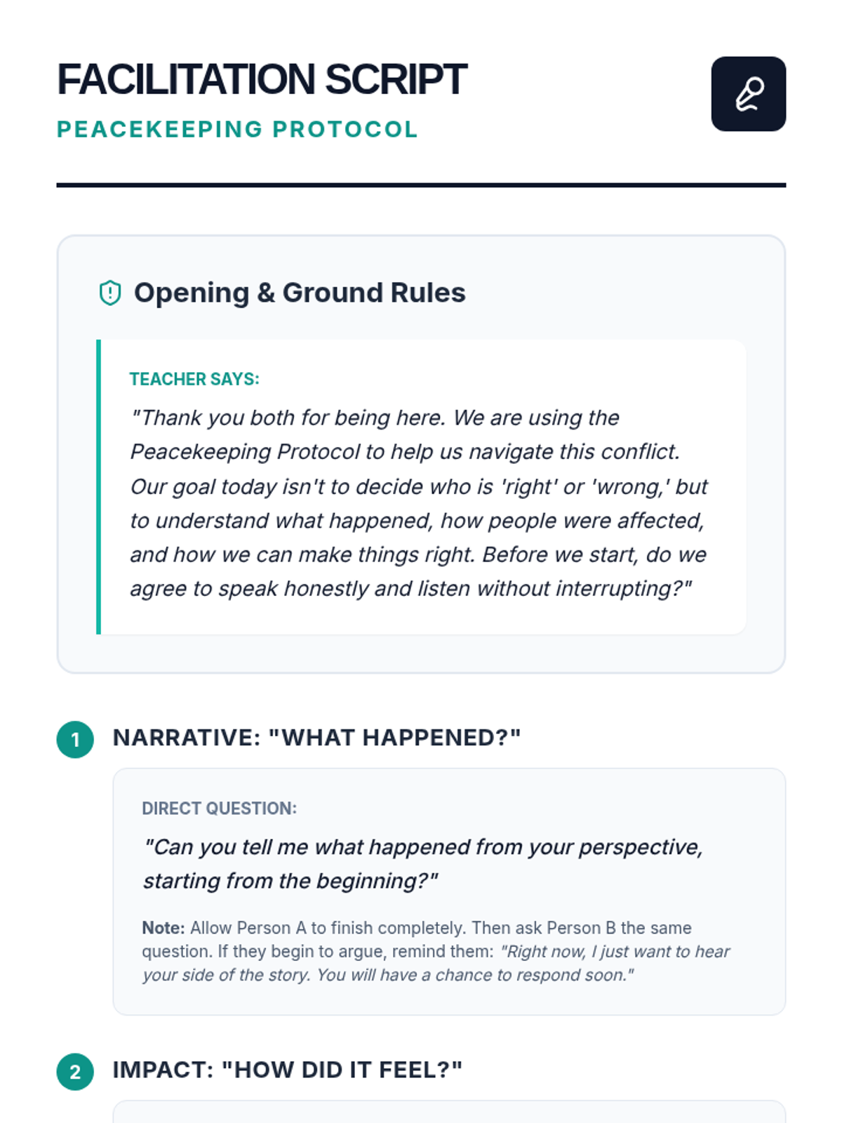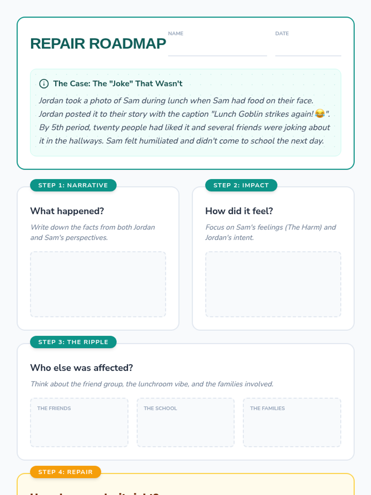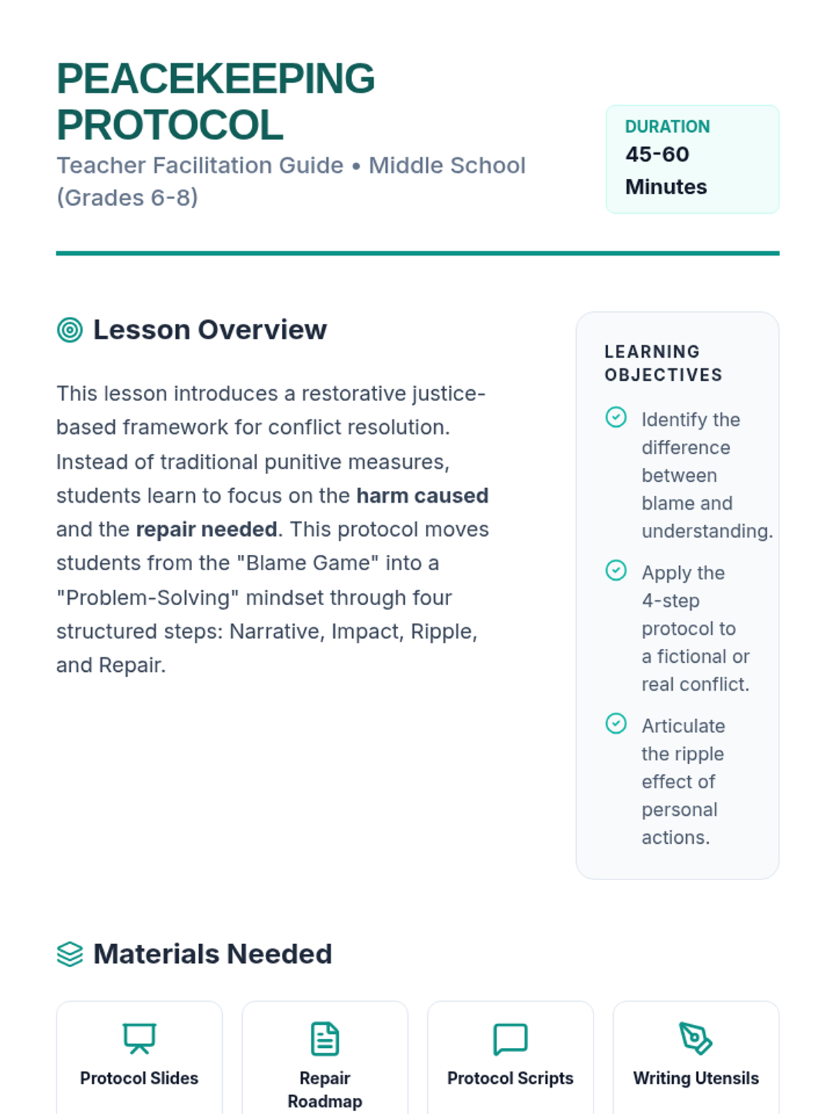 A restorative justice framework for middle schoolers to navigate conflict through structured dialogue, moving from blame to mutual understanding and repair.
