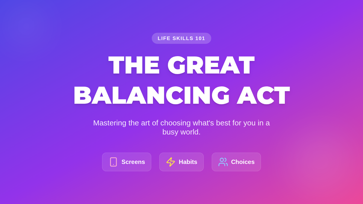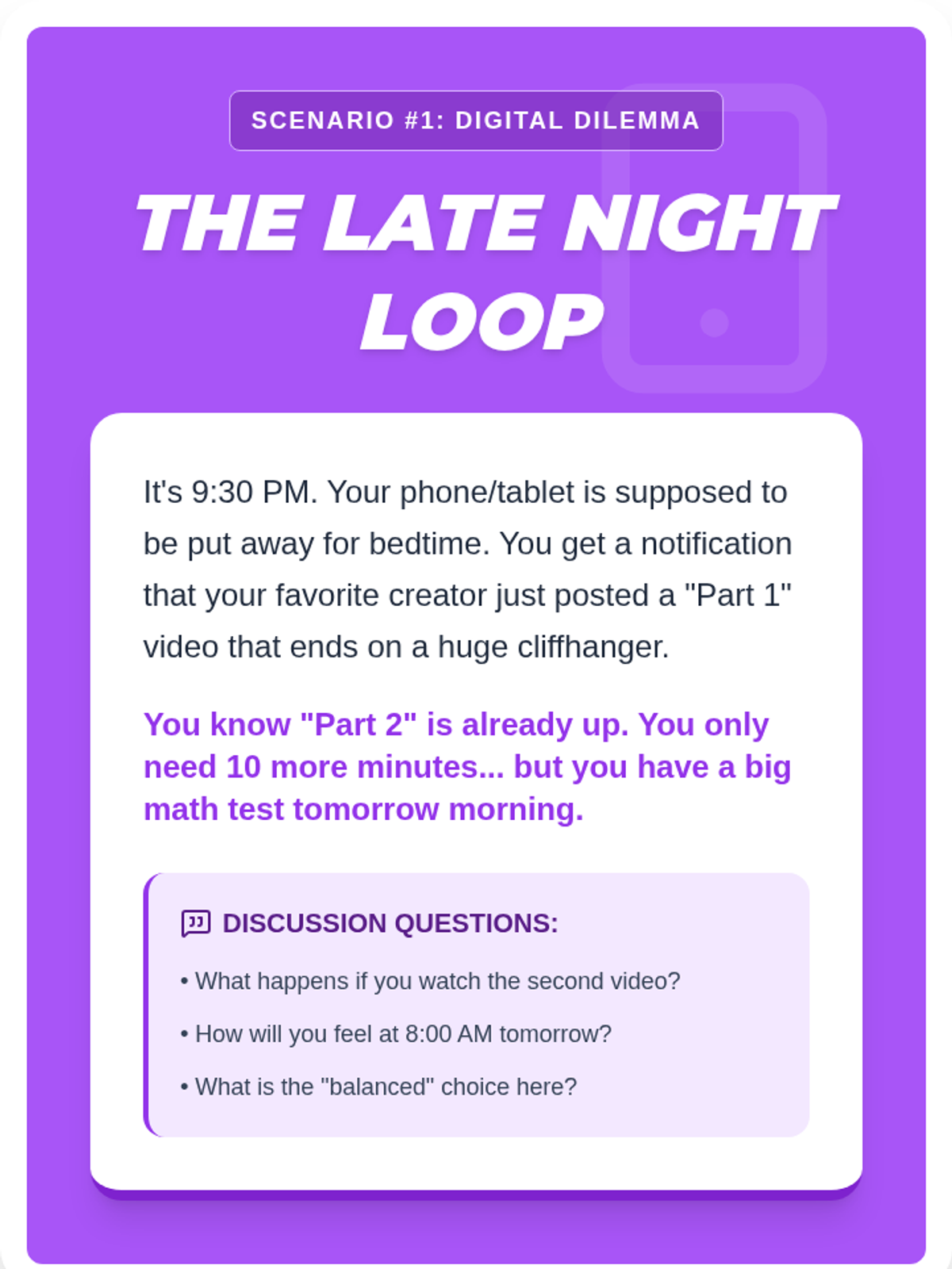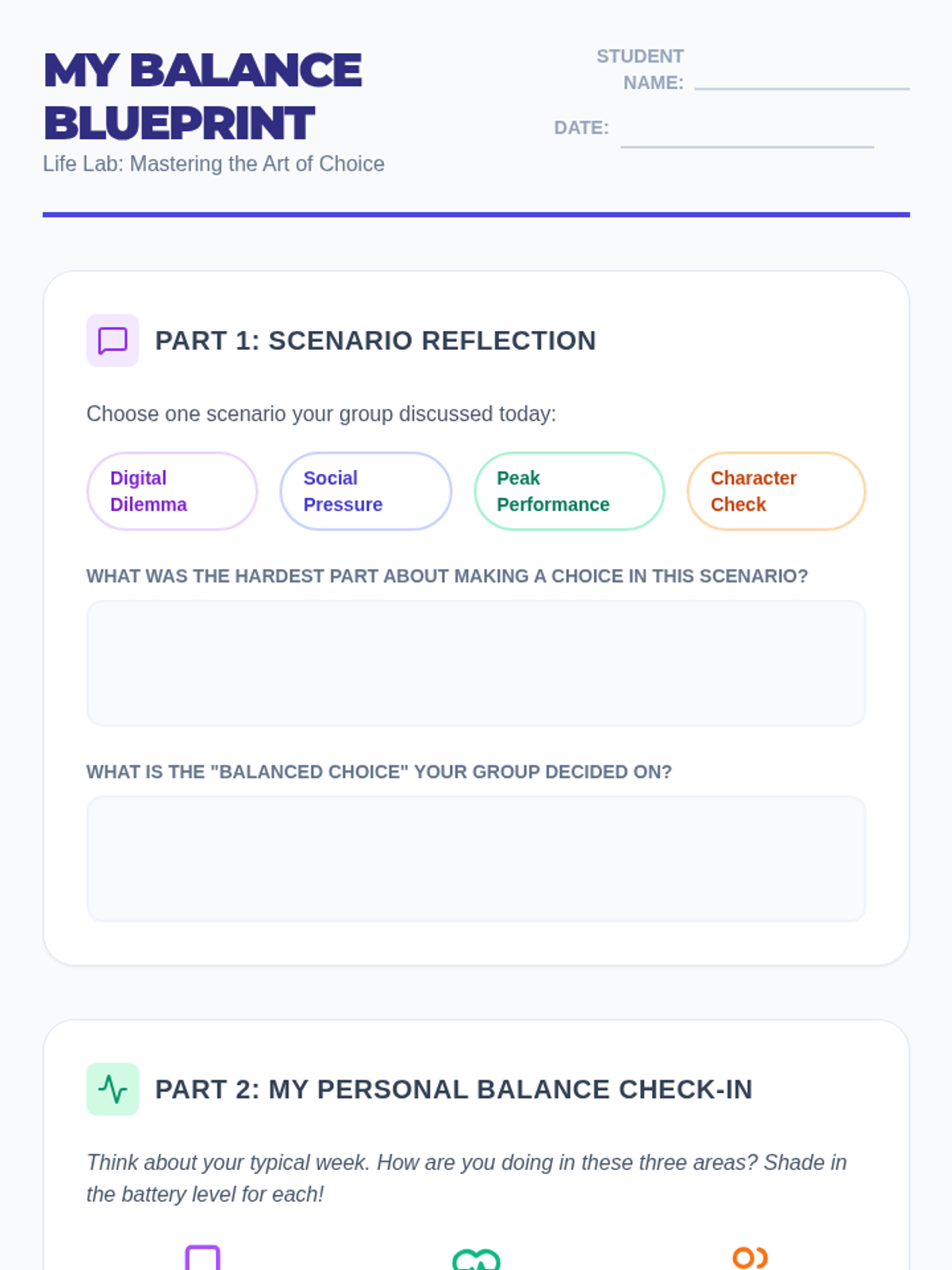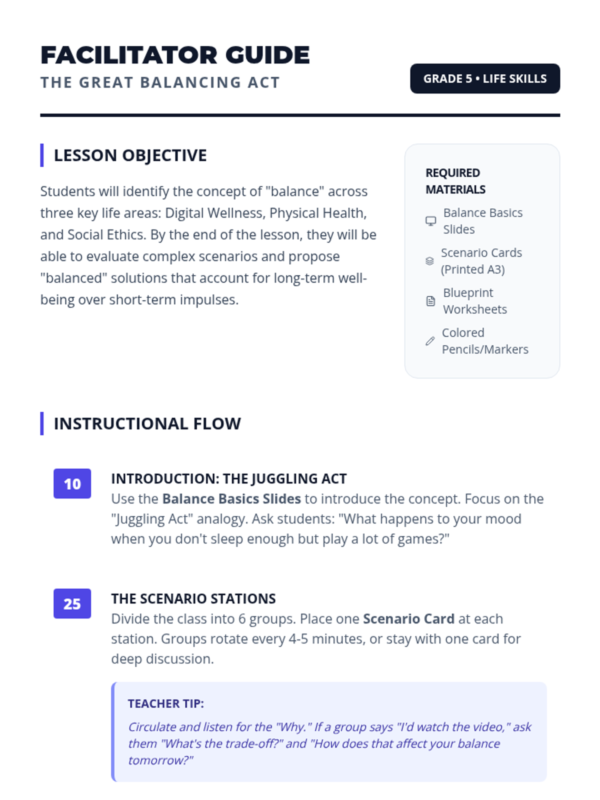 A lesson for 5th graders to explore the concept of life balance across screen time, physical health, and social choices through scenario-based discussion and reflection.