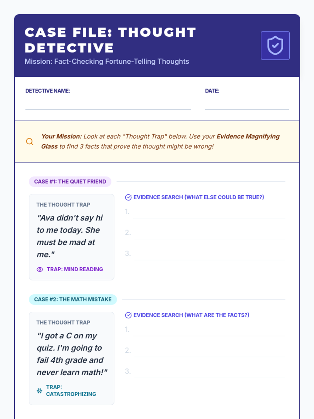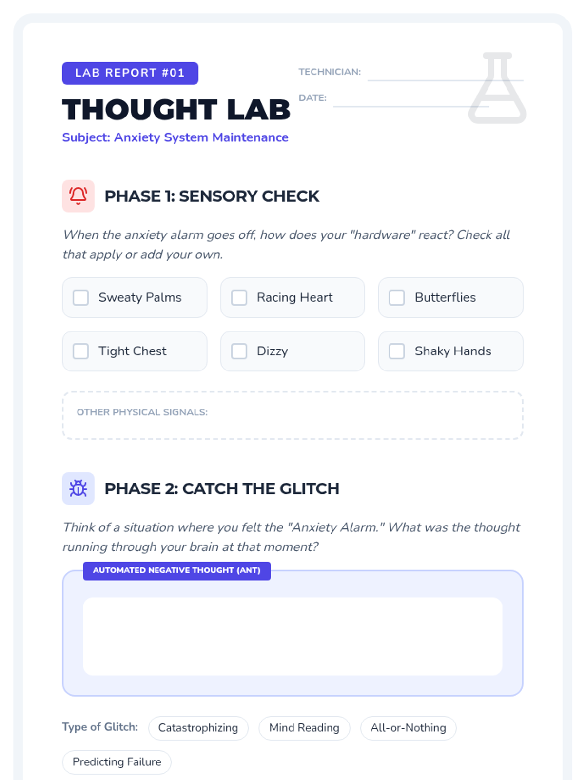 Recognizing Thinking PatternsIdentification of common cognitive distortions such as catastrophizing, overgeneralization, and emotional reasoning. Strengthens metacognitive awareness to disrupt negative internal monologues and promote balanced perspectives.
