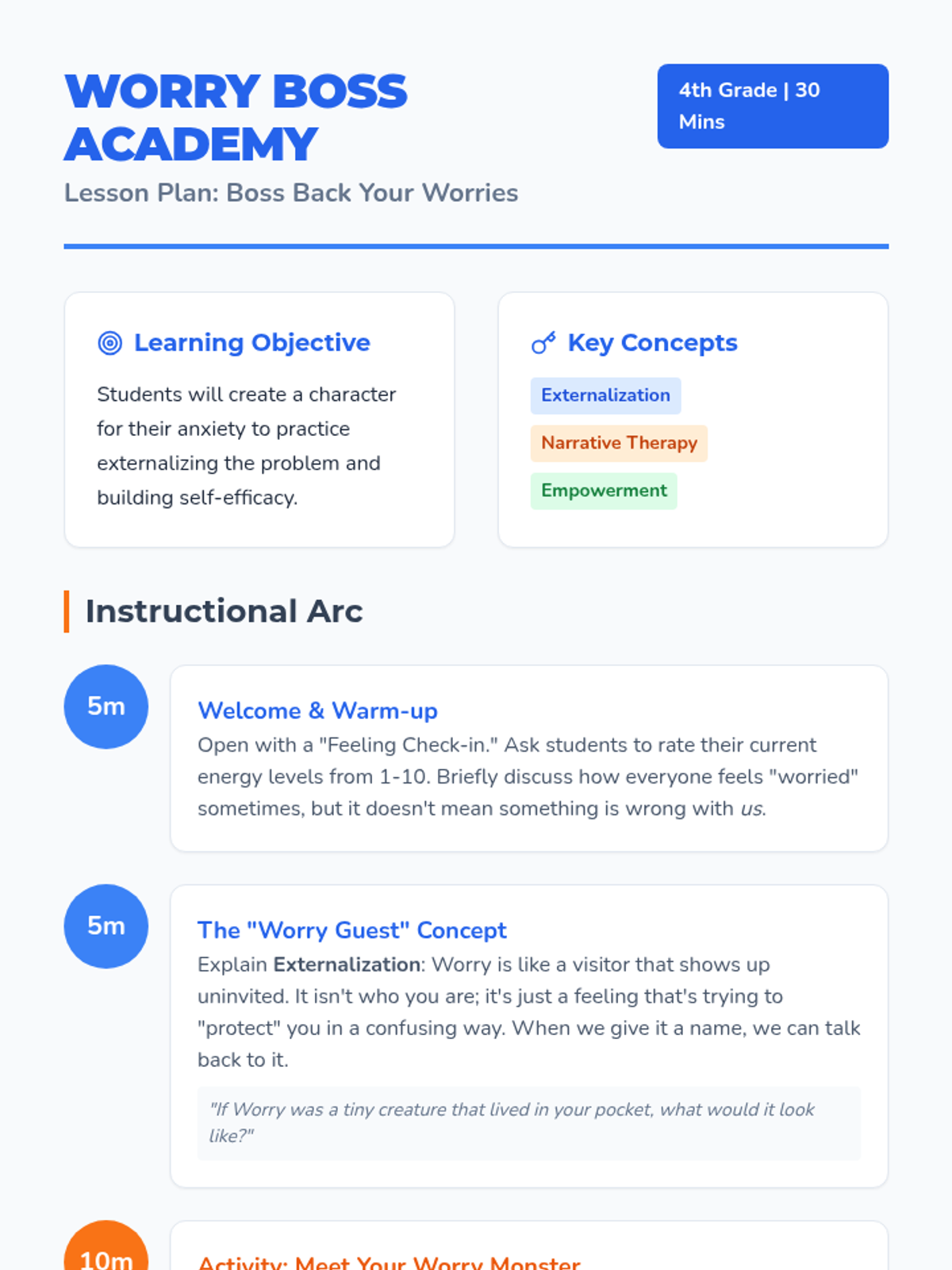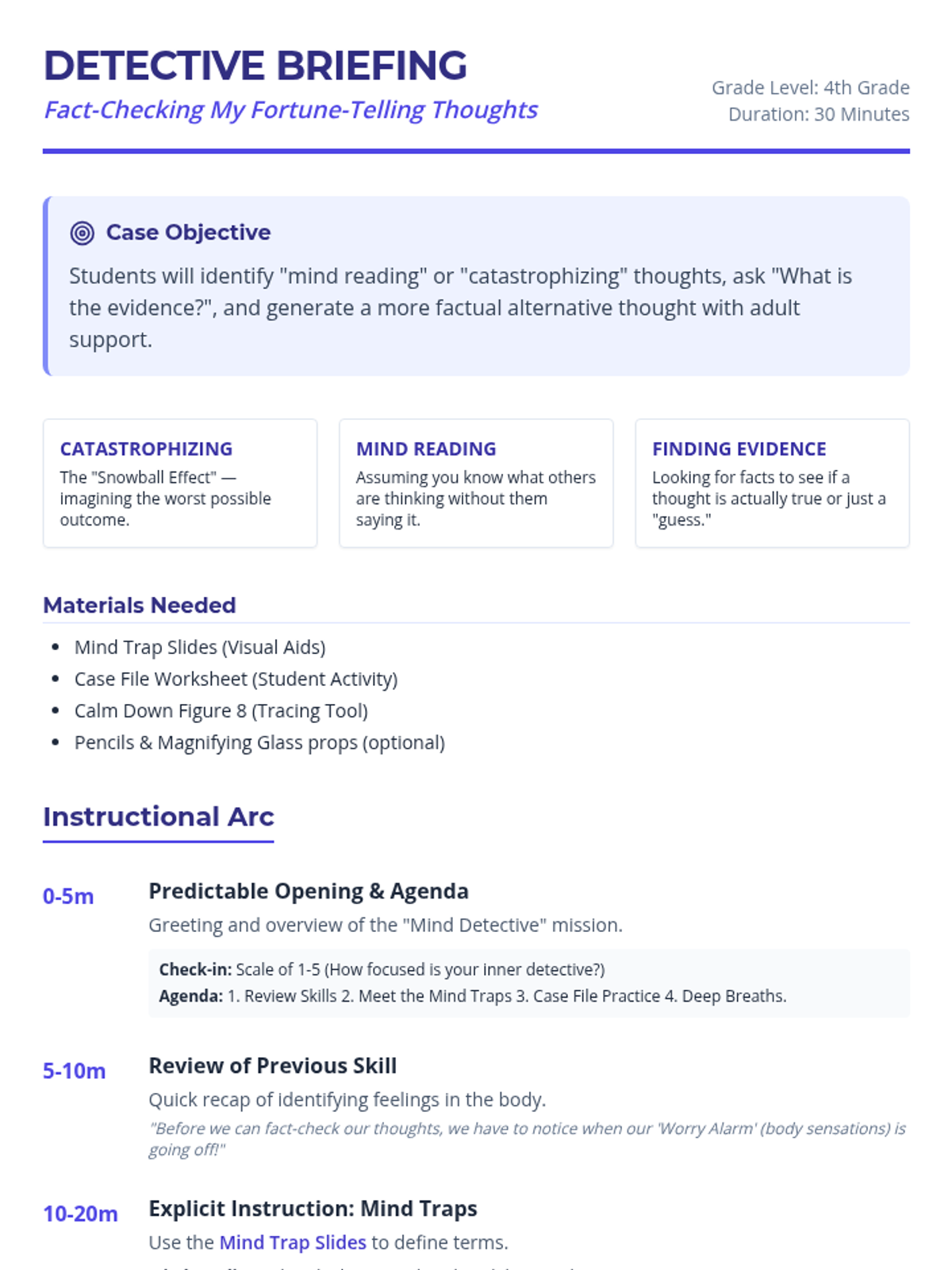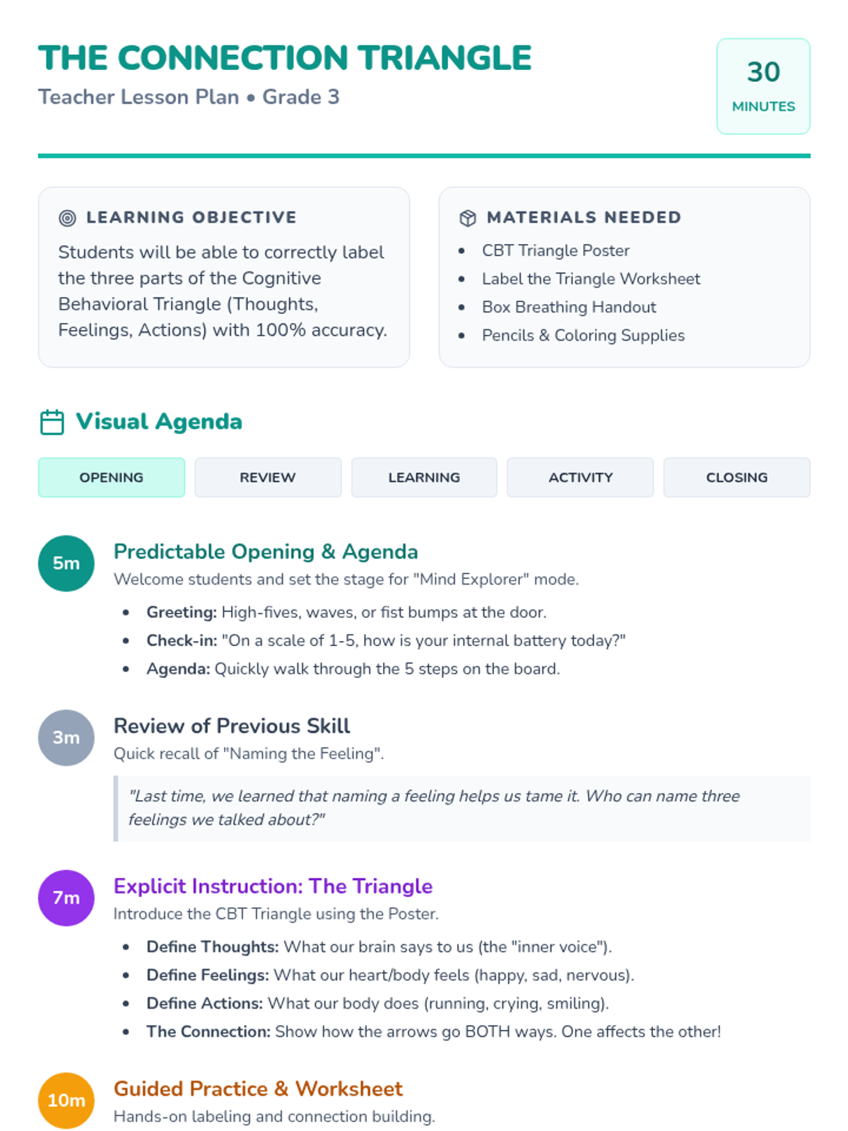 A 30-minute introductory lesson for 3rd graders on the Cognitive Behavioral Triangle, focusing on how thoughts, feelings, and actions influence one another.