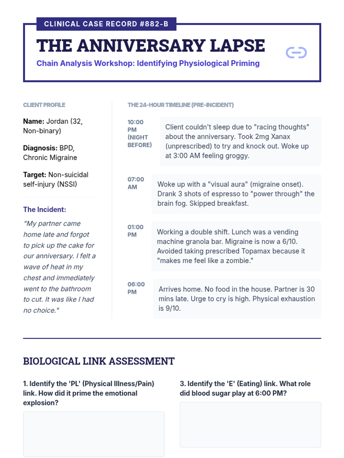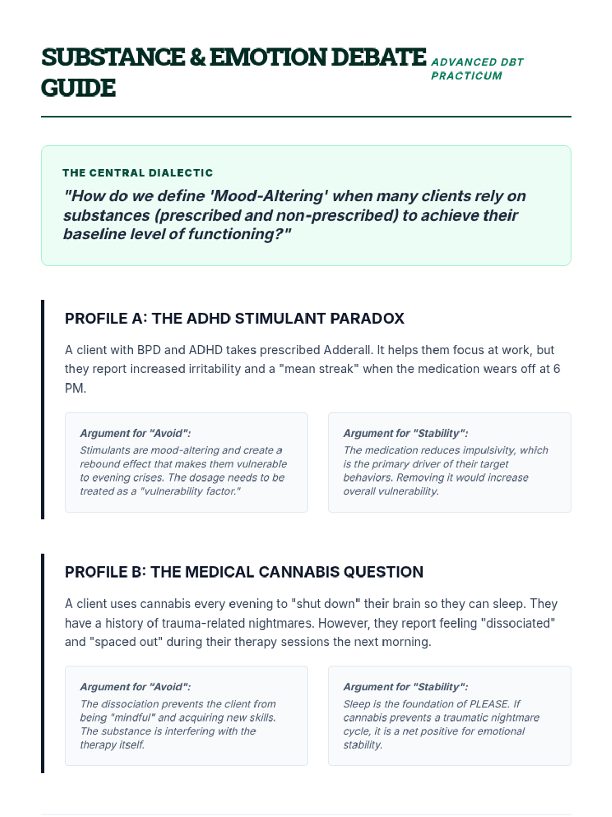 Reducing Emotional Vulnerability (PLEASE)DBT-based strategies for managing physical health to decrease emotional sensitivity. Targets sleep hygiene, balanced nutrition, exercise, and physical illness management to build emotional resilience.
