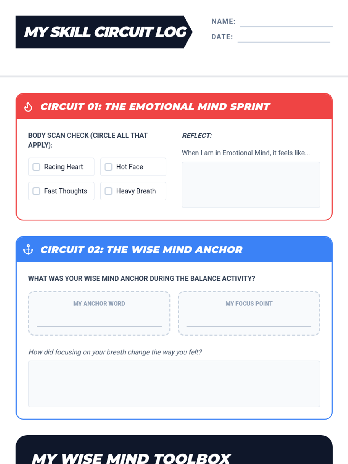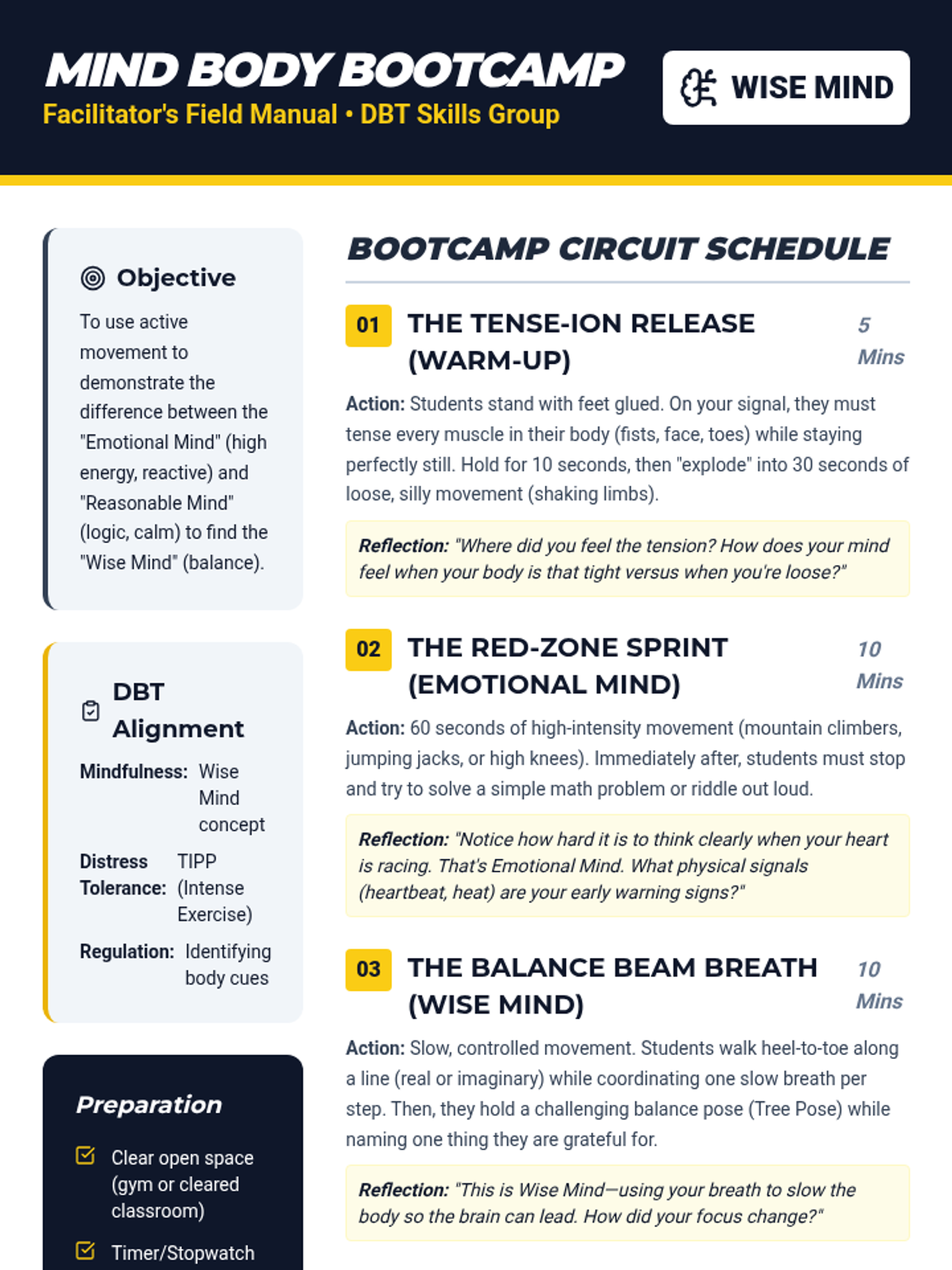 A movement-based DBT skills group designed to help 5th-6th graders transition from emotional reactivity to Wise Mind through structured physical activity and reflection.