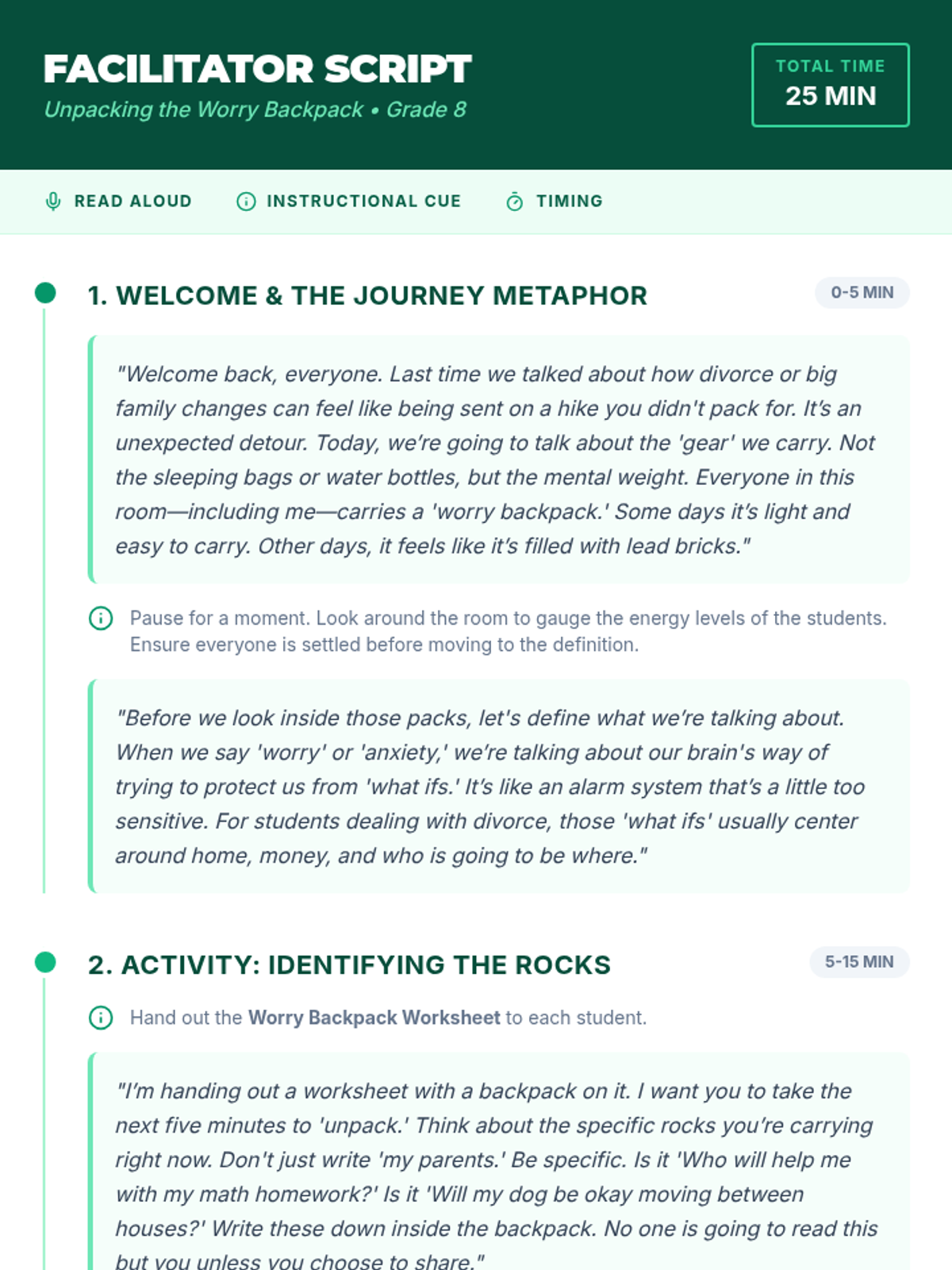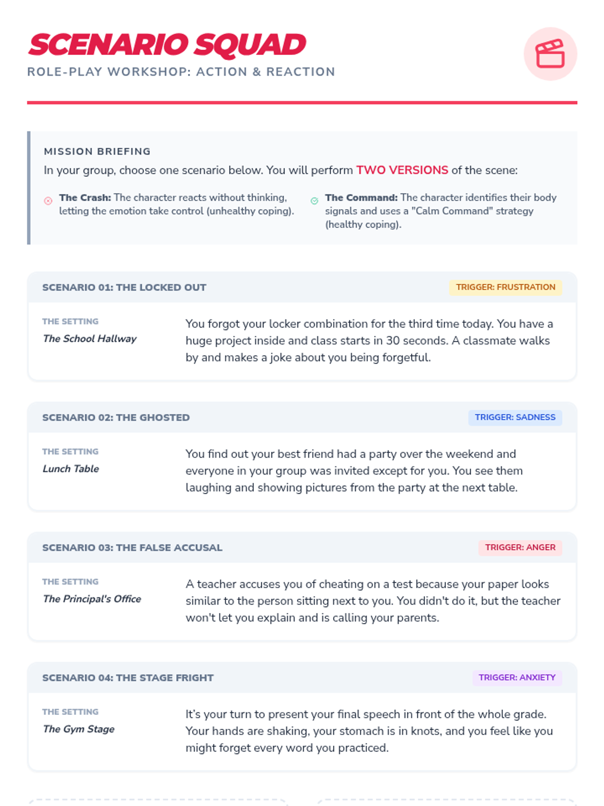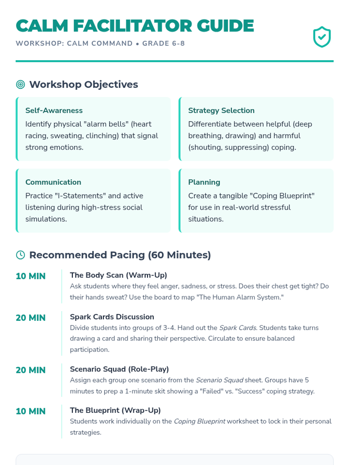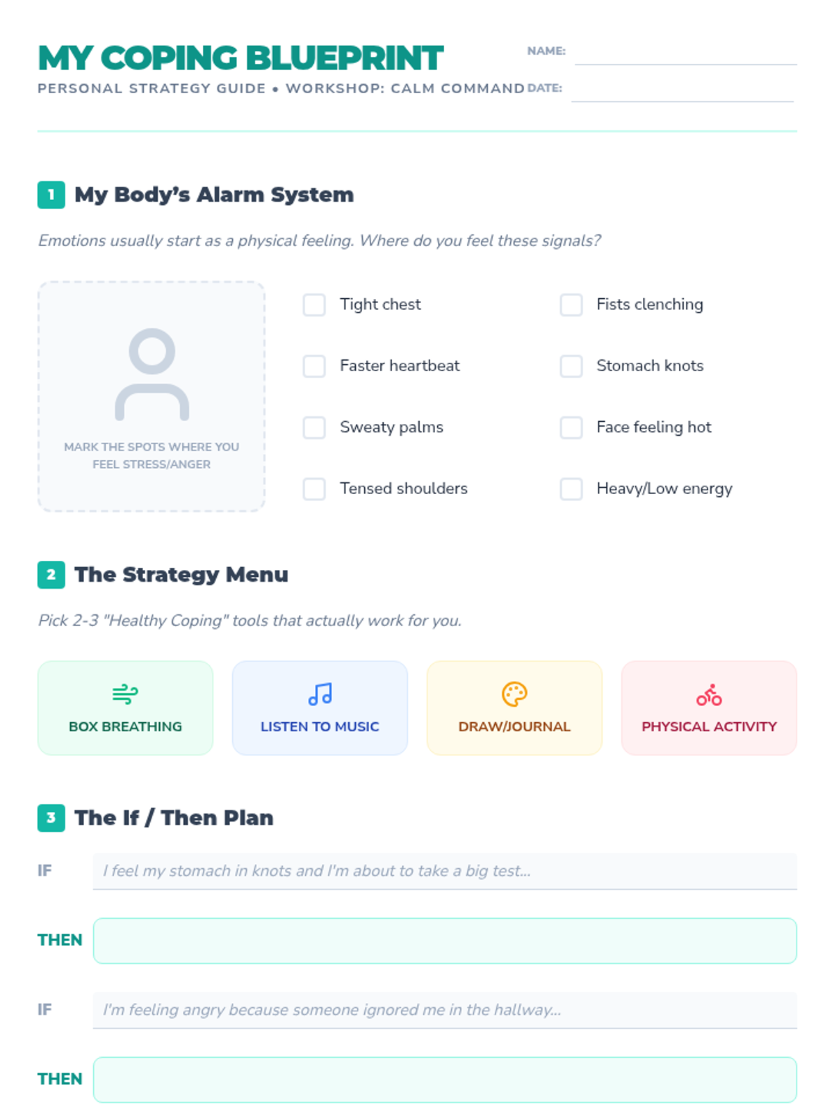 A comprehensive workshop for middle schoolers to identify physical emotional triggers and build a personalized toolkit of healthy coping strategies through discussion and role-play.