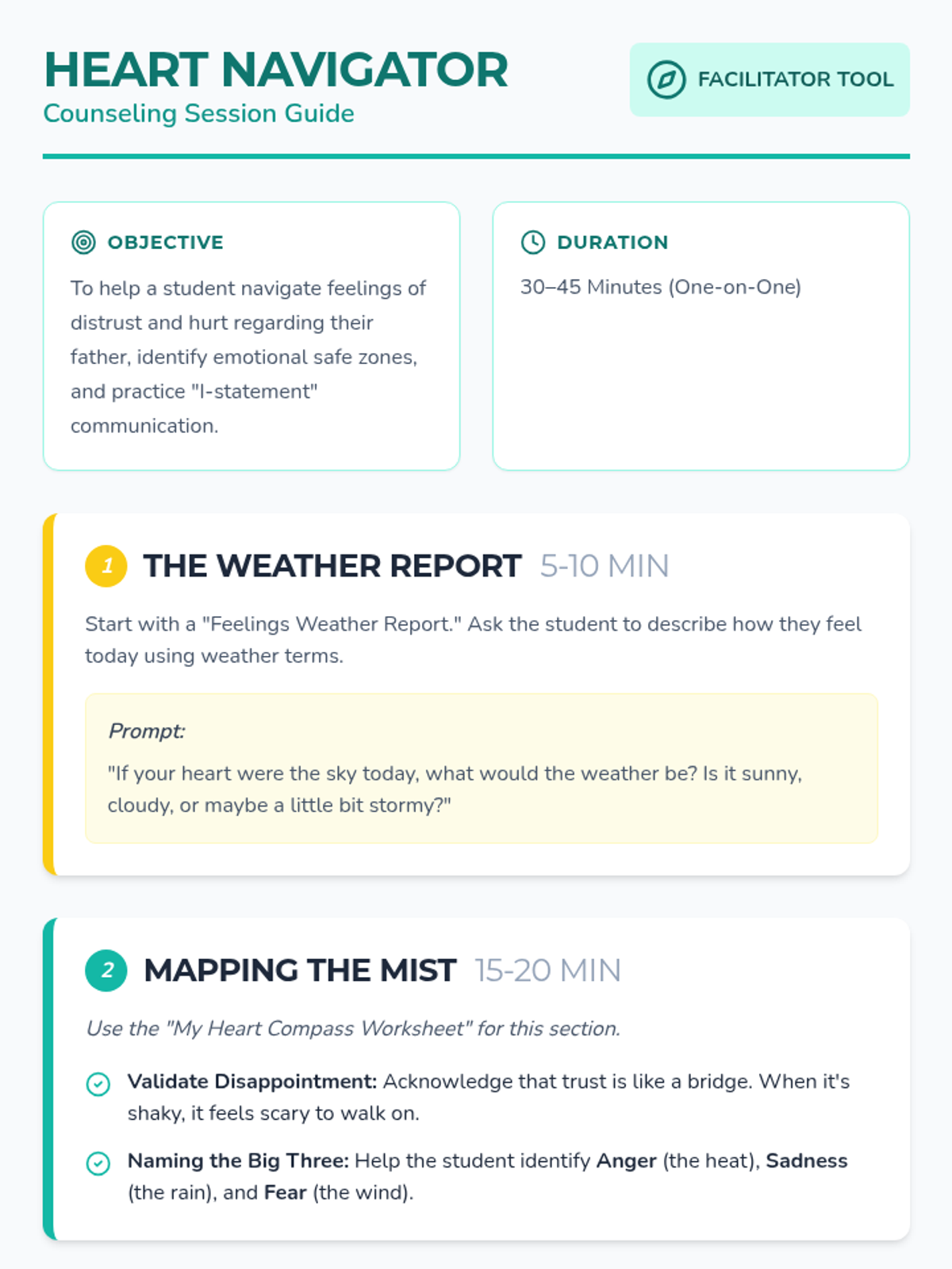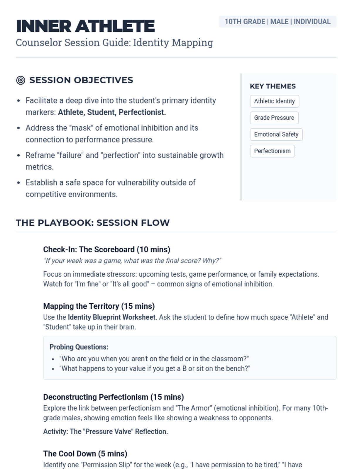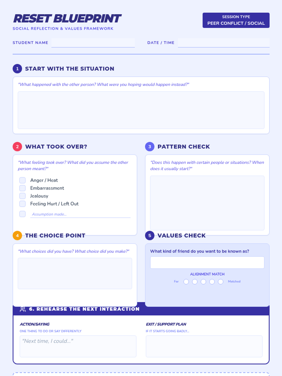 Counseling & Life SkillsSelf-AwarenessBasic Emotion RecognitionComplex Emotion IdentificationEmotional Nuance & Mixed FeelingsBuilding Positive Self-ImageRecognizing Strengths & Growth AreasAccurate Self-AssessmentPersonal Values IdentificationCultural & Individual Identity ExplorationValues-Based Decision MakingSelf-ManagementStop-and-Think StrategiesDelaying GratificationIndependent Impulse ManagementIdentifying Stress TriggersShort-Term Goal SettingSMART Goals DevelopmentGoal Monitoring & AdjustmentBuilding Perseverance & ResilienceInternal Motivation DevelopmentComprehensive Stress Reduction PlanningSocial AwarenessRecognizing Others' FeelingsDemonstrating EmpathyRespecting Individual DifferencesUnderstanding Cultural DiversityComplex Empathetic ResponsesMultiple Viewpoint ConsiderationMulti-Perspective AnalysisChallenging Stereotypes & BiasRelationship SkillsActive ListeningClear Verbal & Nonverbal CommunicationBuilding Positive FriendshipsWorking Cooperatively in GroupsCommunicating Personal BoundariesRespecting Others' BoundariesAssertive ExpressionPeaceful Problem-SolvingContributing to Team GoalsComplex Conflict NavigationMediation & NegotiationHealthy Romantic RelationshipsResponsible Decision-MakingDaily Problem IdentificationBrainstorming Multiple SolutionsEvaluating Pros & ConsRecognizing Risks & ConsequencesApplying Ethical FrameworksInformed Risk-Benefit DecisionsRoot Cause AnalysisMindfulnessMindful BreathingBody Scan MeditationDaily Mindfulness ApplicationDaily Self-Care RoutinesBalancing Life DemandsAdvocating for Wellness NeedsMental Health SupportUnderstanding Anxiety SymptomsWorry Management StrategiesProgressive Muscle RelaxationRecognizing Depression SignsBuilding Mood-Supporting RoutinesBehavioral Activation for MoodUnderstanding Grief StagesHealthy Grief CopingCreative Expression of LossBehavioral SupportDaily Check-In ProceduresDaily Goal Setting & ReviewRecognizing Escalation Warning SignsRequesting Breaks & SupportSelf-Calming During DistressUnderstanding Positive ReinforcementToken Economy ImplementationBehavior Chart TrackingAnalyzing Behavior PatternsIdentifying Antecedents & ConsequencesDetermining Behavior FunctionFunction-Based InterventionsIndividualized Behavior ContractsData-Driven Behavior AdjustmentTherapeutic ApproachesThoughts-Feelings-Behaviors ConnectionRecognizing Thinking PatternsChallenging Negative ThoughtsPositive Self-Talk PracticeThought Record TrackingAdvanced Cognitive RestructuringComprehensive CBT PlansBehavioral Activation TechniquesBuilding Positive ExperiencesExposure Hierarchies for AnxietyPresent-Moment AwarenessNon-Judgmental ObservationSelf-Soothing & DistractionComplex Emotion LabelingReducing Emotional Vulnerability (PLEASE)DEAR MAN CommunicationGIVE Skills for RelationshipsFAST Skills for Self-RespectRadical Acceptance PracticeCrisis Survival Skills (TIPP)Understanding Trauma EffectsTrauma Responses & TriggersIdentifying Trauma FeelingsGrounding TechniquesRegulation During Trauma DistressSafe Place VisualizationProcessing Through NarrativeDeveloping Trauma StoryPersonalized Safety PlanningGroup SupportTurn-Taking & SharingGroup Conversation SkillsSharing in Supportive EnvironmentLearning from Similar ChallengesBuilding Community & BelongingNavigating Peer RelationshipsGroup Skill PracticeGroup Mental Health EducationStress & Anxiety UnderstandingCrisis Support & SafetyKnowing When to Seek HelpIdentifying Mental Health CrisesGrounding During CrisisUsing Crisis HotlinesBuilding Support NetworksAccessing Mental Health ResourcesWarning Signs & Coping StrategiesDeveloping Personal Safety PlansUnderstanding Suicide Warning SignsGatekeeper Skills for PeersDigital LiteracySocial MediaTechnology BasicsProductivity ToolsInternet and Online ResearchWeb Design and PublishingDigital CitizenshipOnline Safety and PrivacyEmerging TechnologiesFinancial LiteracyMaking Financial DecisionsBanking and AccountsConsumer SkillsSaving and InvestingCredit and DebtEmployment and IncomeTaxesInsuranceMajor PurchasesEconomic ConceptsFinancial PlanningCollege & Post-Secondary PlanningCareer ExplorationUnderstanding Post-Secondary OptionsCollege Research & SelectionAdmission RequirementsCollege Application ProcessPersonal Statement WritingFAFSA CompletionScholarship Search & ApplicationsUnderstanding Student LoansContinuing Education PlanningInterview PreparationResearching EmployersCommon Interview QuestionsSTAR Method ResponsesProfessional Interview PresenceVirtual Interview SkillsInterview Follow-UpJob Search SkillsUnderstanding Job PostingsEffective Job Search StrategiesNetworking for OpportunitiesResume Writing BasicsAction Verbs & AchievementsTailoring Resumes to JobsCover Letter WritingProfessional ReferencesProfessional CommunicationBusiness Email EtiquettePhone & Voicemail ProfessionalismMeeting ParticipationPresentation SkillsProfessional Work EthicTime Management & ProductivityTeamwork & CollaborationAdaptability & FlexibilityProblem-Solving at WorkConstructive FeedbackWorkplace RightsUnderstanding Employment LawsPay & Benefits UnderstandingWorkplace SafetyAnti-Discrimination & Harassment