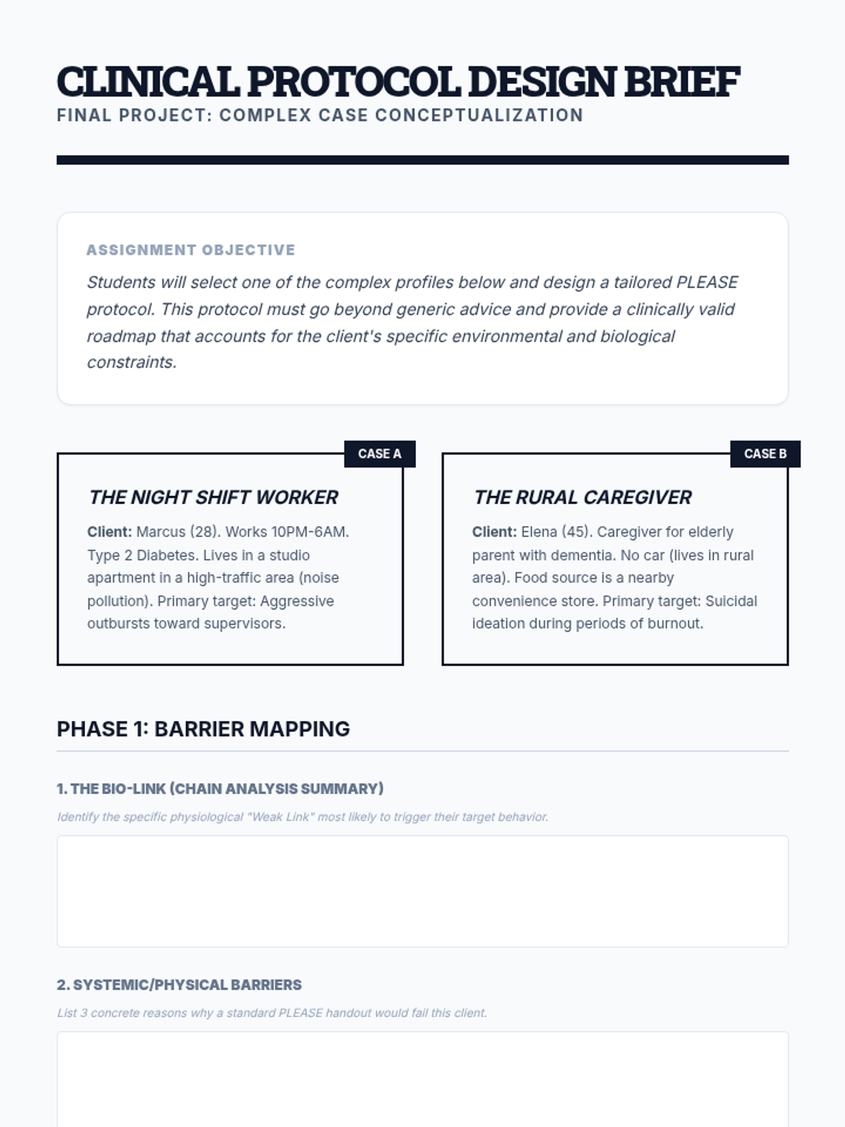 Students analyze mood and activity data to evaluate intervention effectiveness, practicing the role of the scientist-practitioner in a clinical setting.
