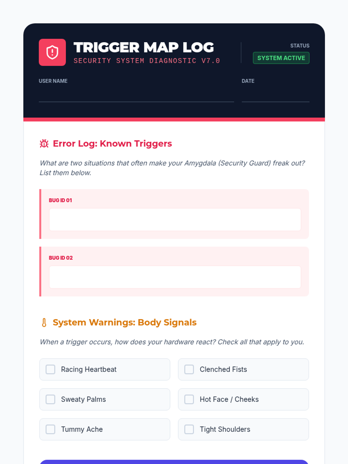 Identifying Trauma FeelingsRecognition of emotional and physiological signatures associated with traumatic experiences. Targets awareness of triggers, somatic markers, and the distinction between past reactions and present safety.