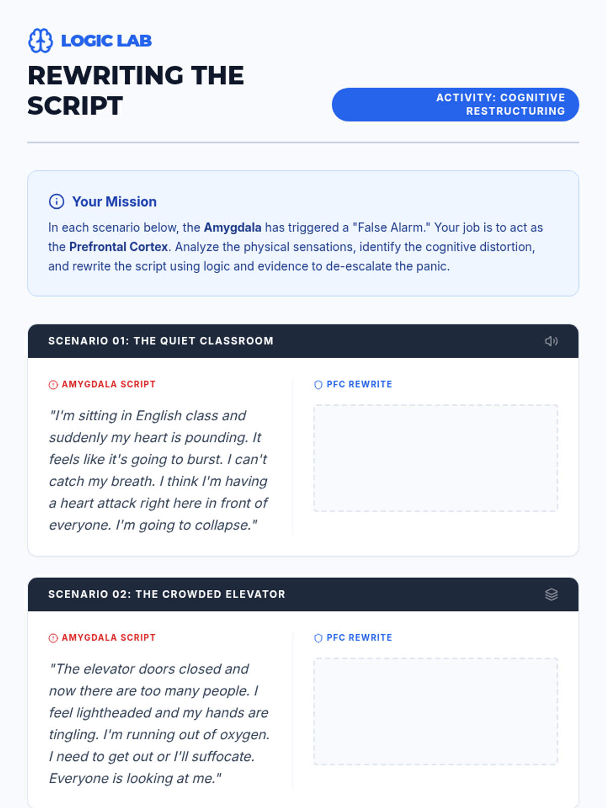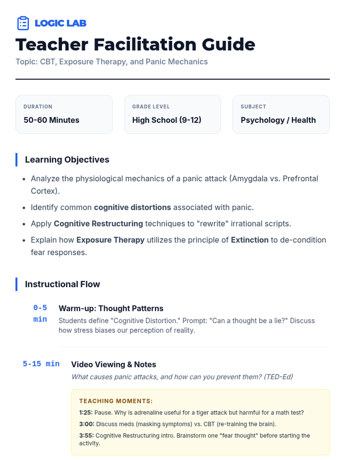 Students will understand that panic attacks are common physiological overreactions and learn concrete coping strategies to manage them. The lesson uses a mix of video analysis, biological diagrams, and hands-on breathing practice to demystify the experience of panic.
