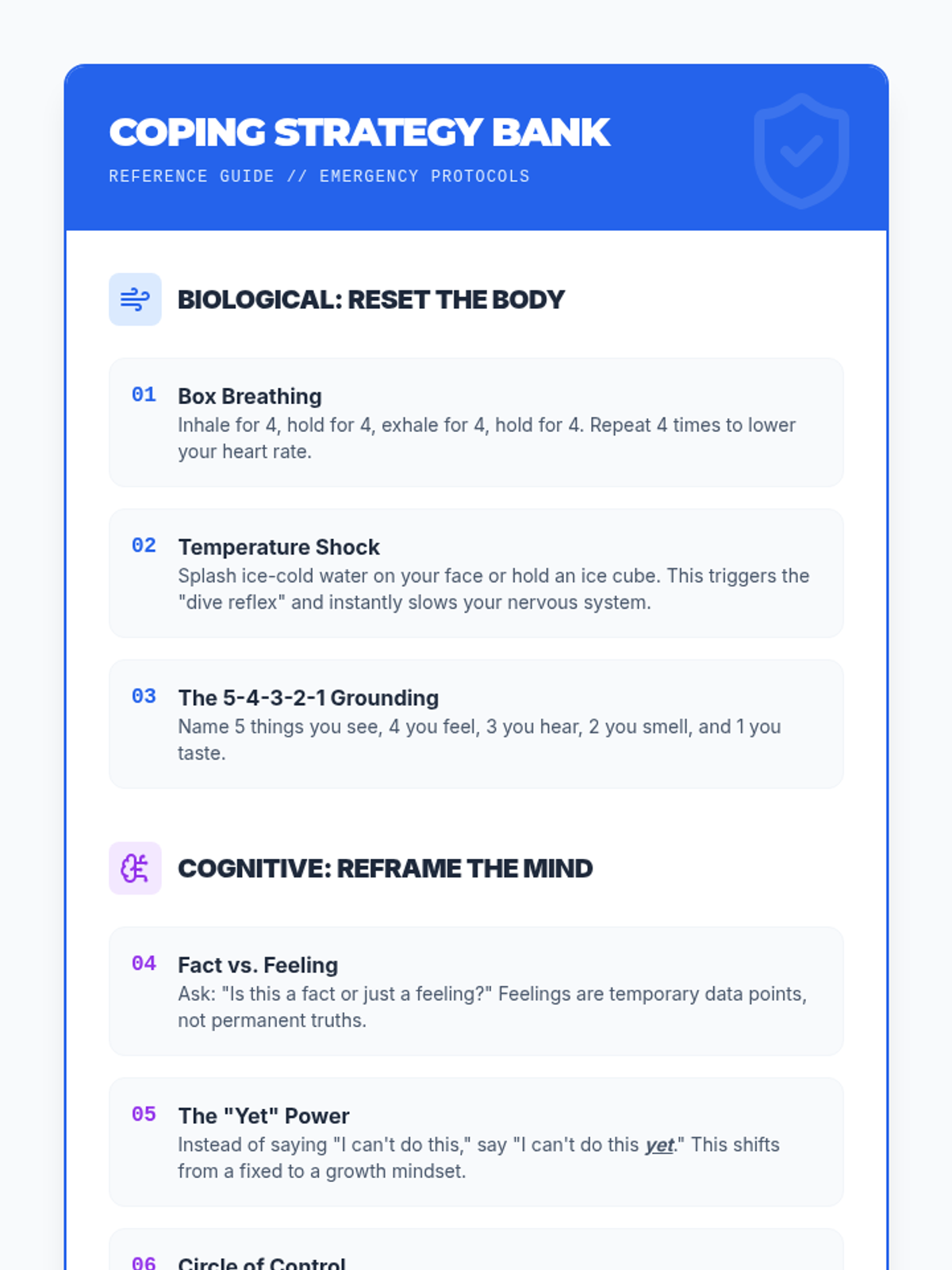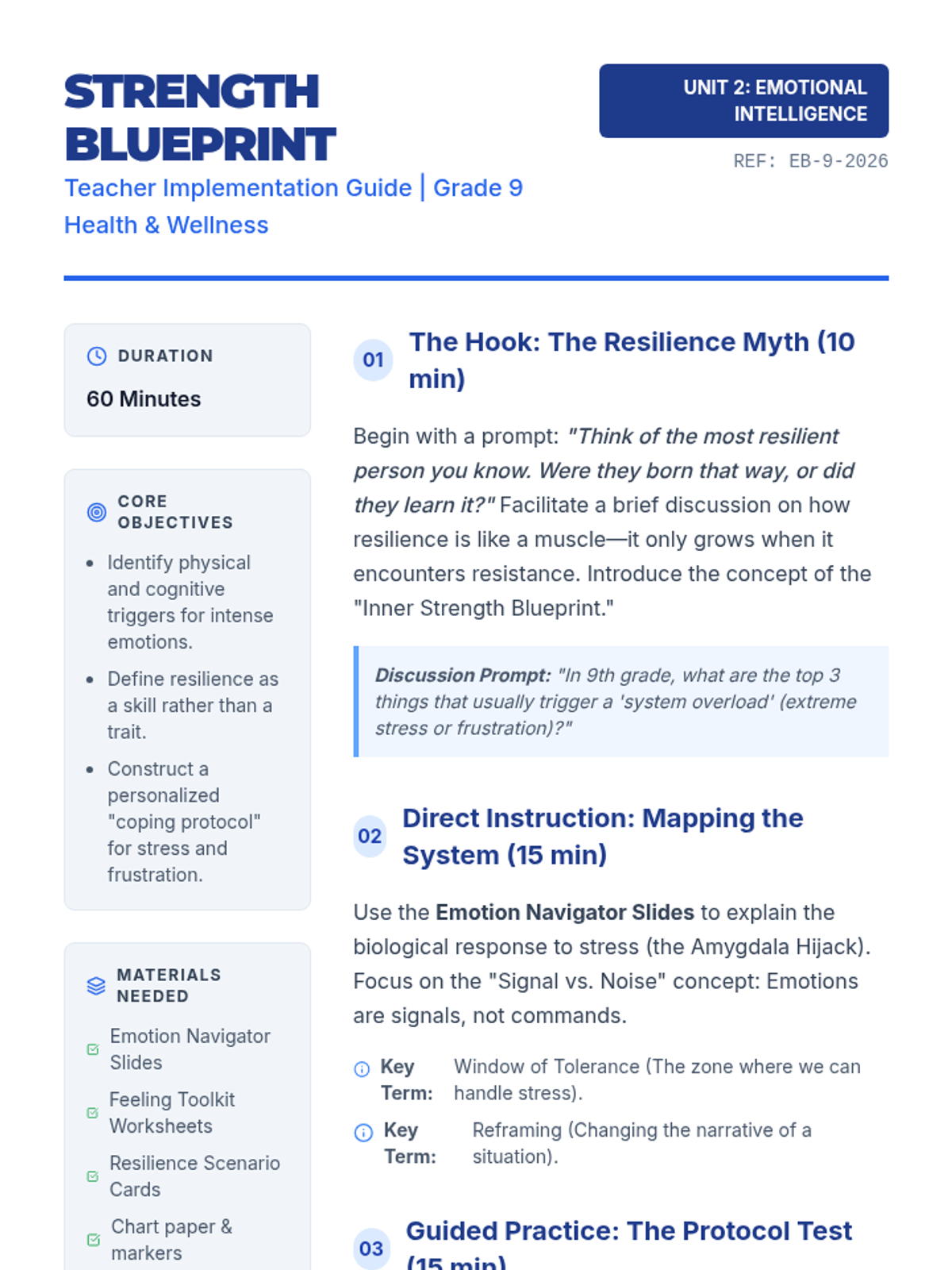 A comprehensive lesson for 9th graders on building emotional resilience, identifying triggers, and developing a personalized set of coping strategies to navigate stress, frustration, and sadness.