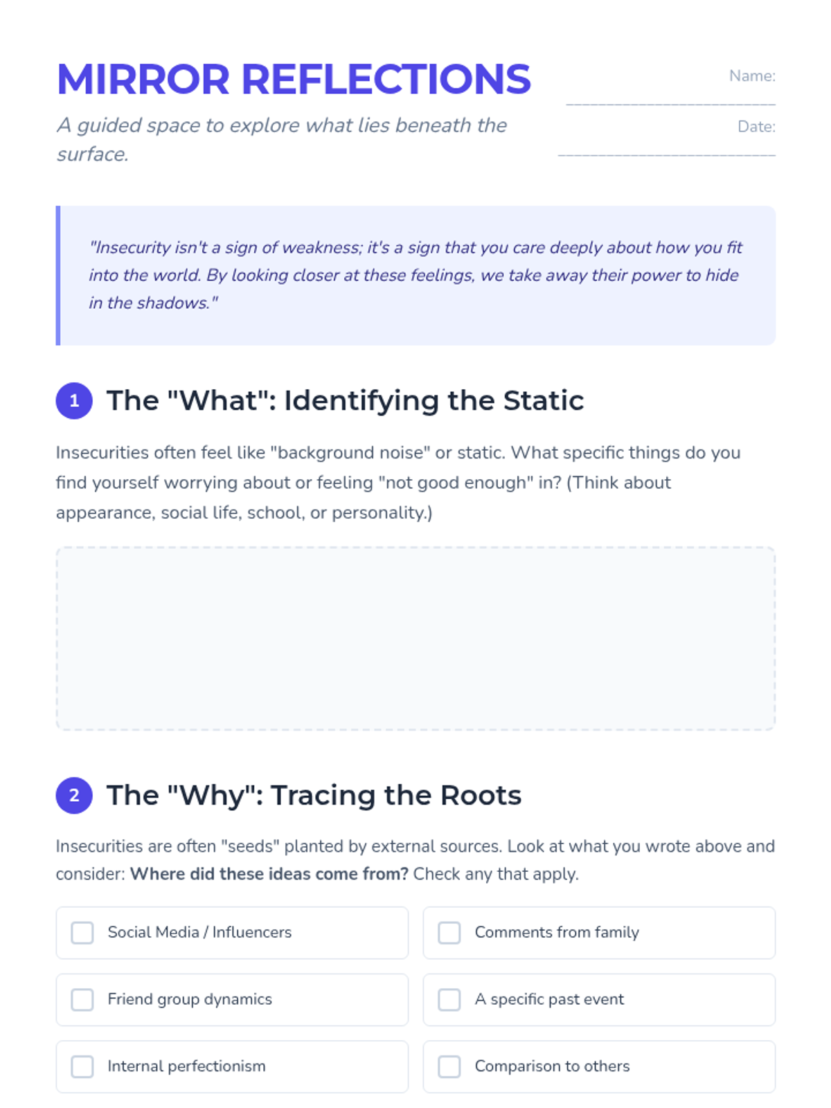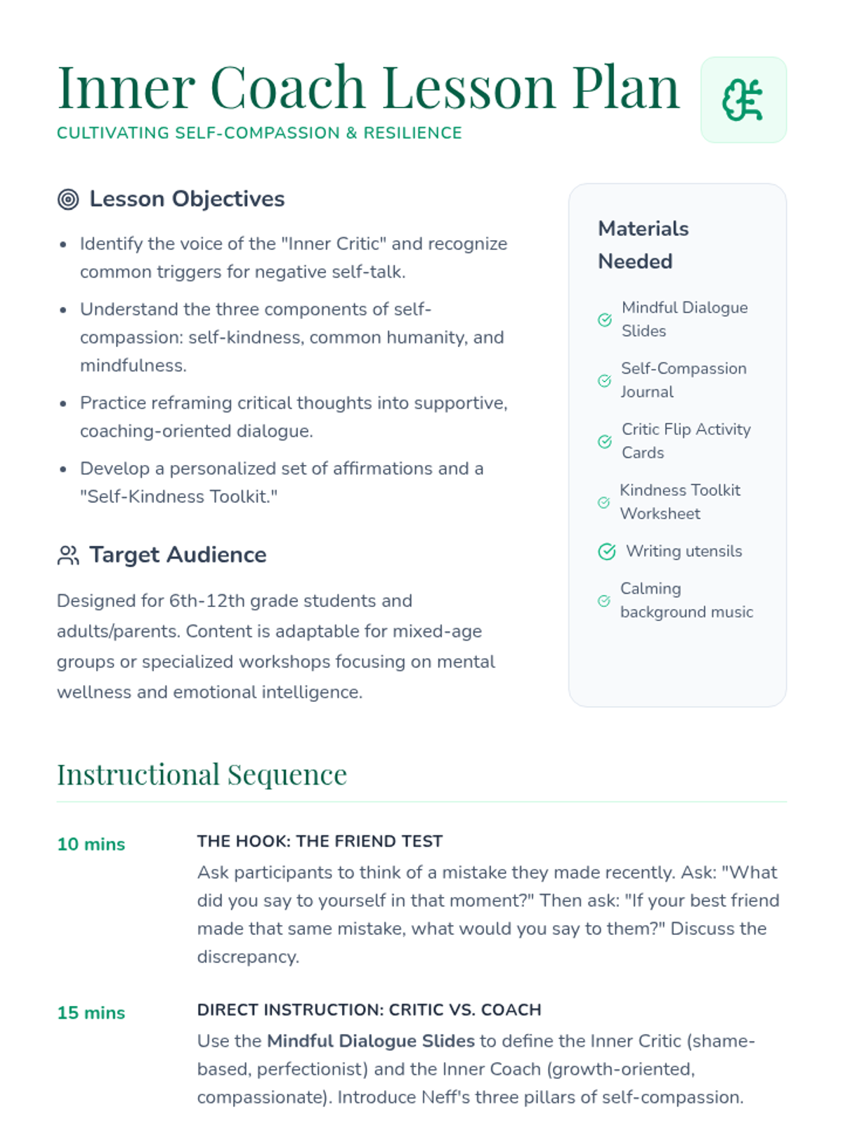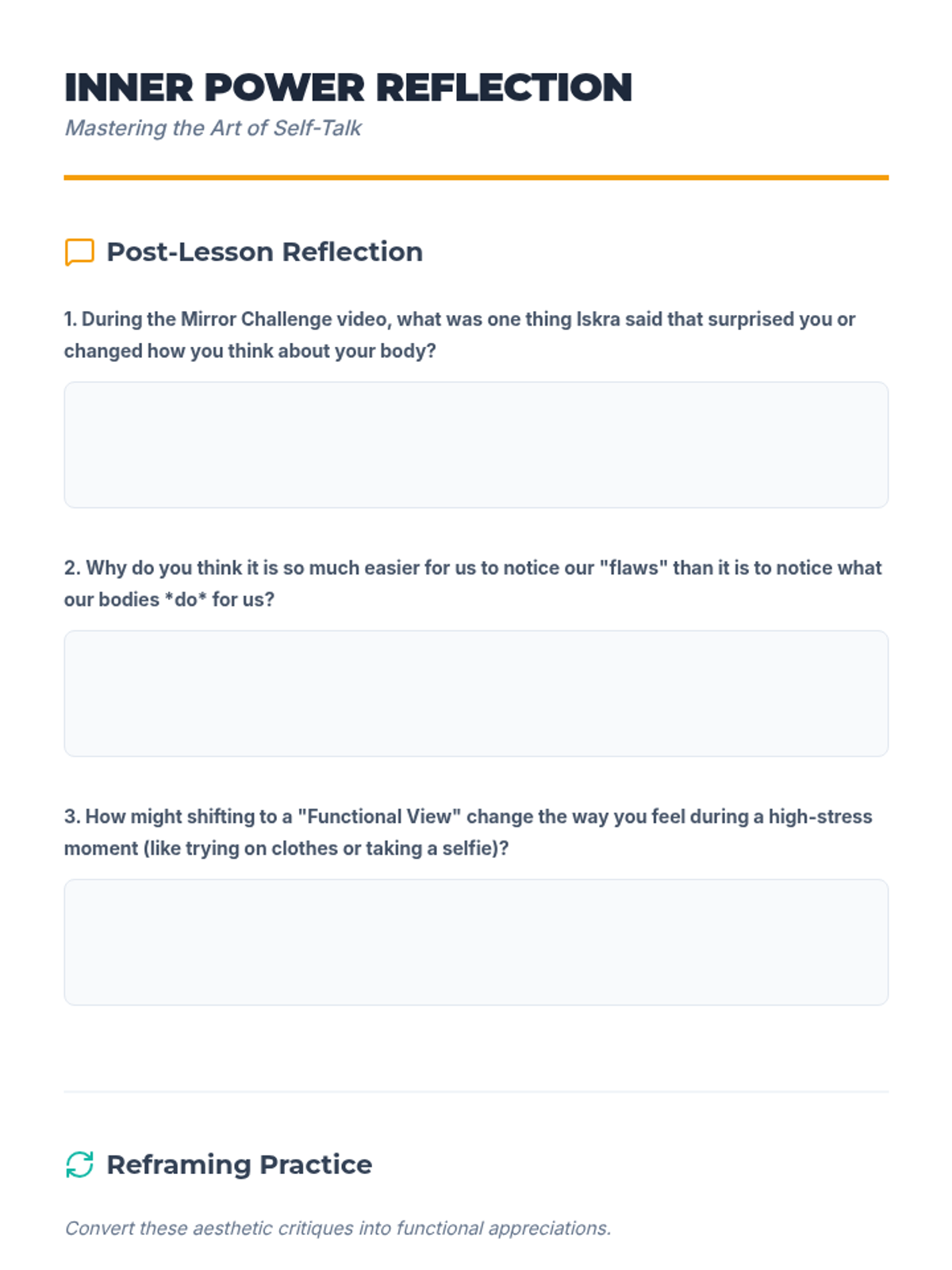 Positive Self-Talk PracticeCognitive restructuring techniques to identify and reframe negative internal dialogue. Strengthens self-compassion and emotional resilience through practical affirmations and mindfulness exercises.