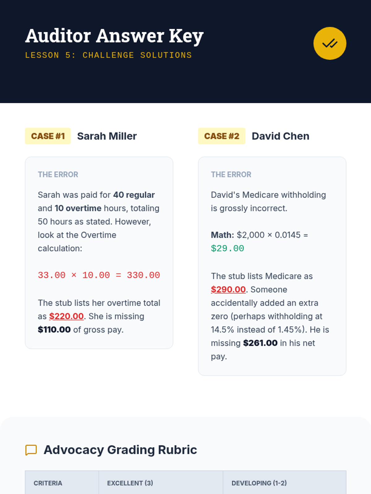 In this culminating lesson, students act as payroll auditors to review a series of generated paystubs containing deliberate errors. They must identify discrepancies in hours worked, overtime rates, or deduction calculations.