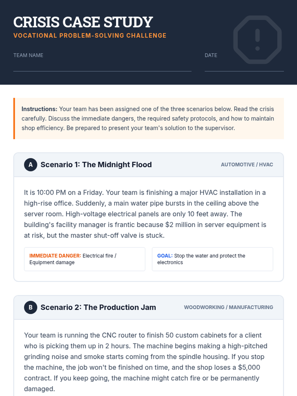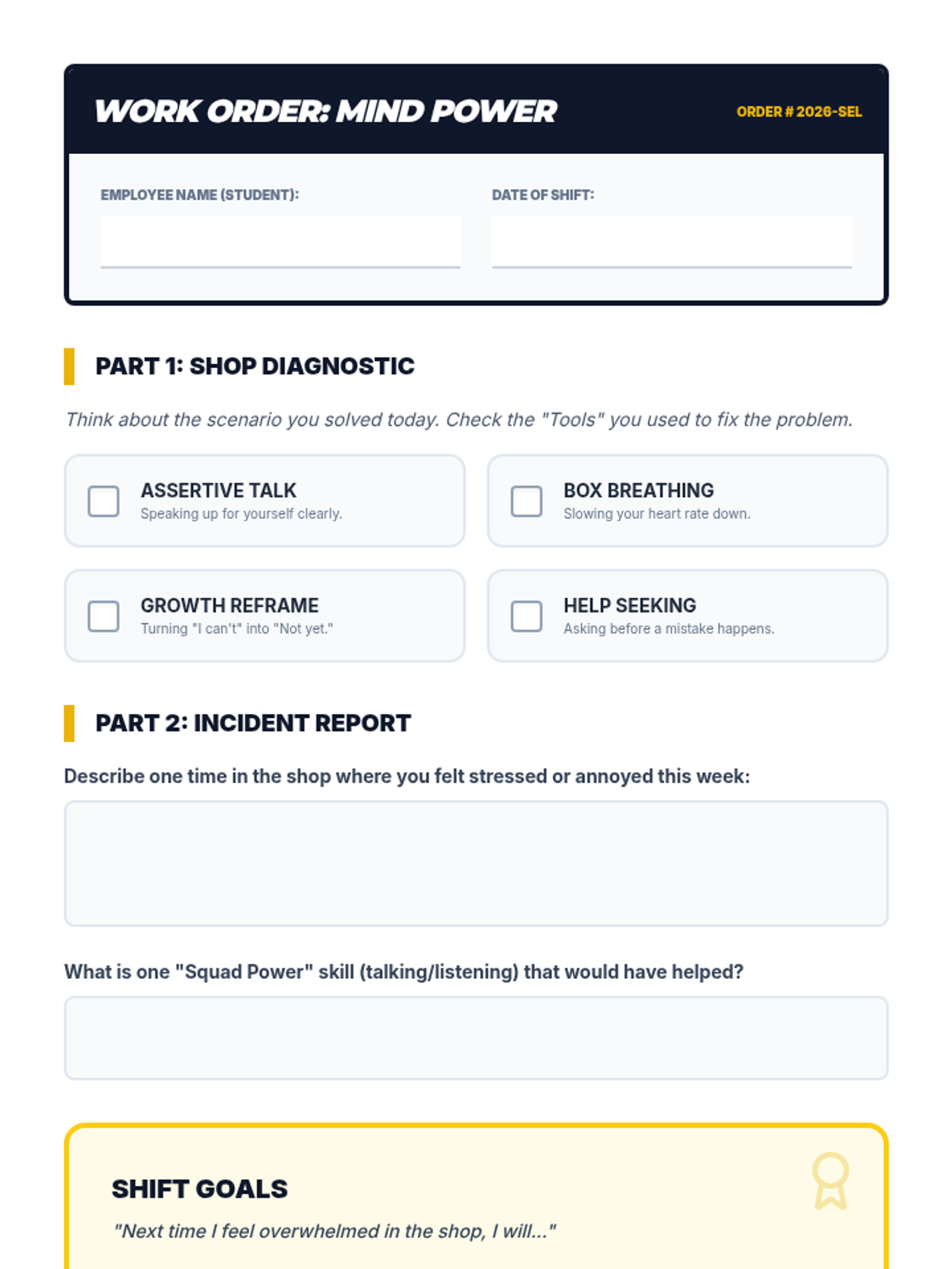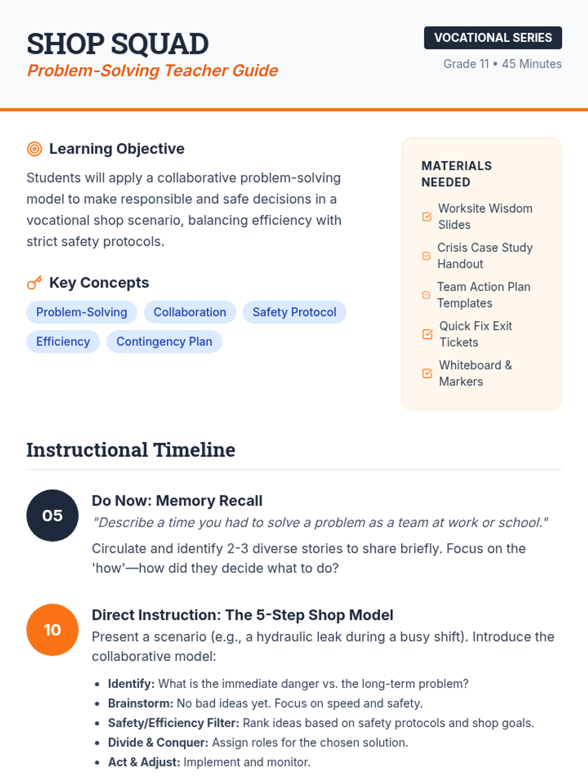 A 45-minute vocational lesson where students learn to apply a collaborative problem-solving model to workplace shop scenarios, focusing on safety, efficiency, and team communication.