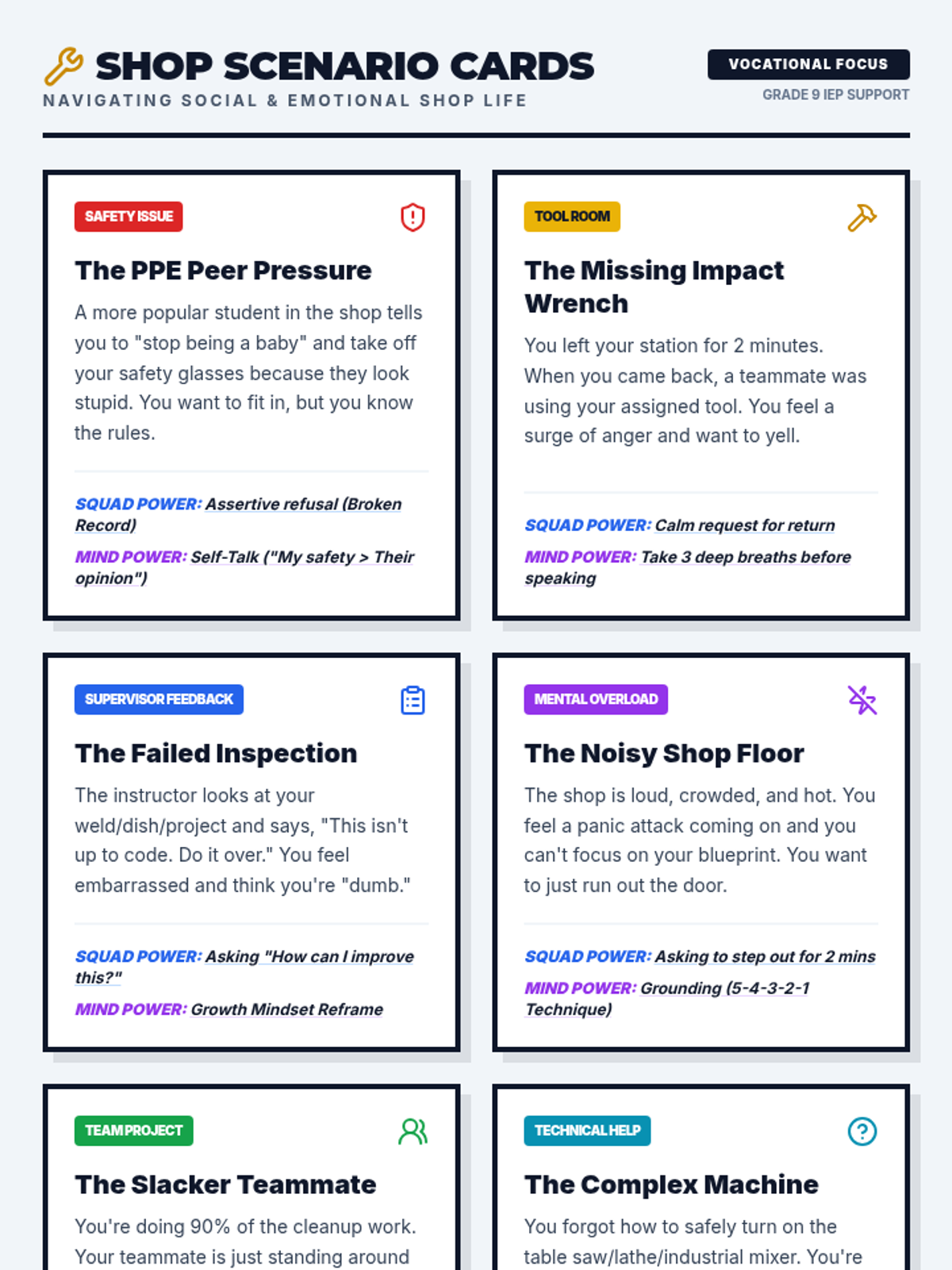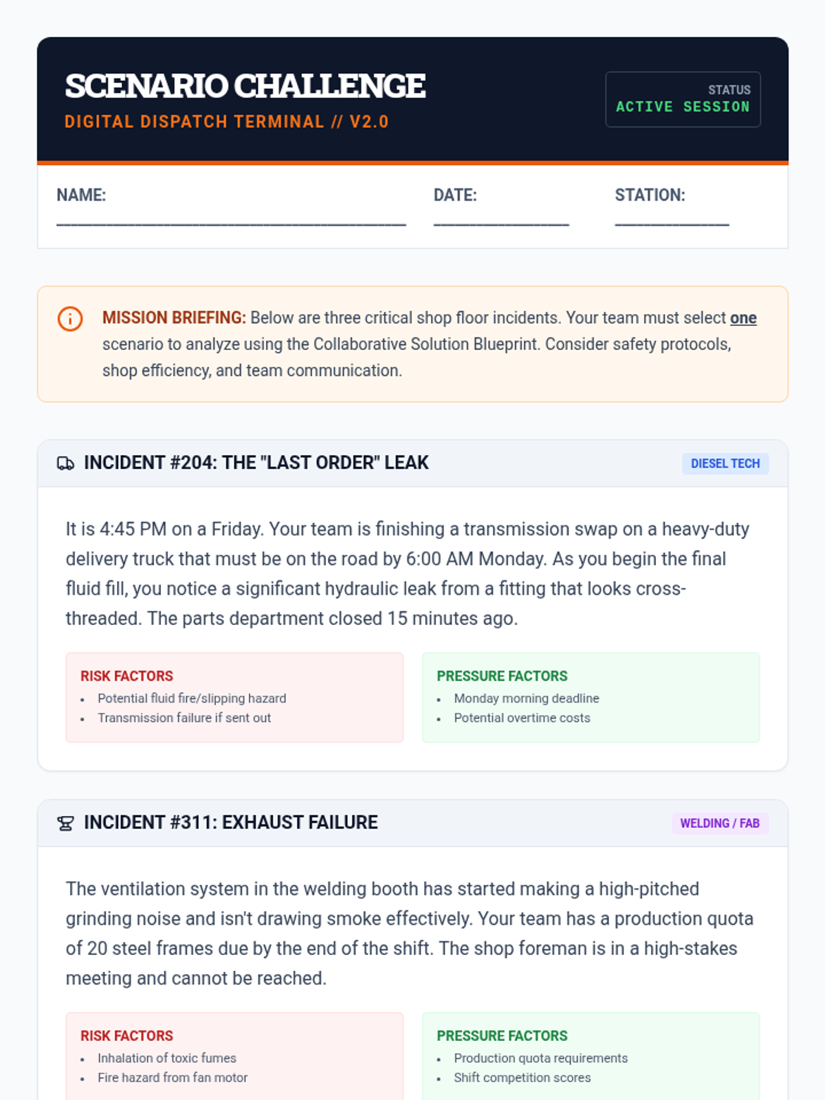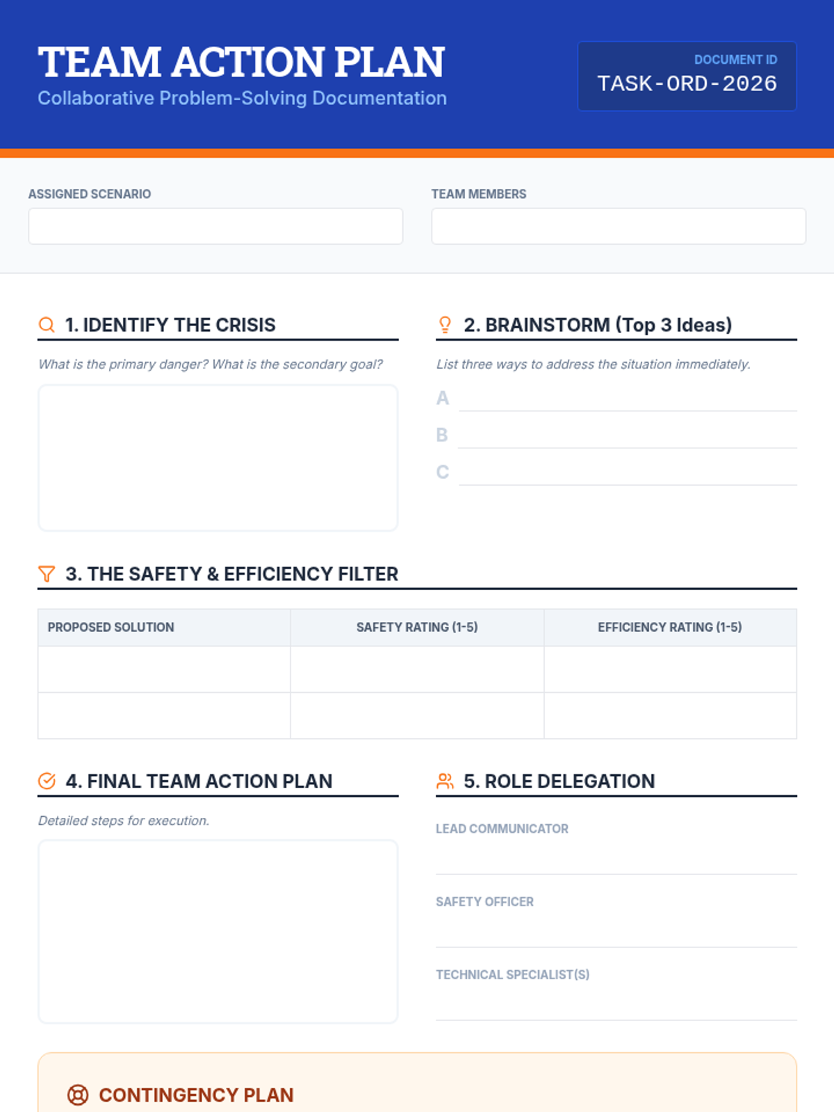 A 45-minute vocational lesson where students learn to apply a collaborative problem-solving model to workplace shop scenarios, focusing on safety, efficiency, and team communication.