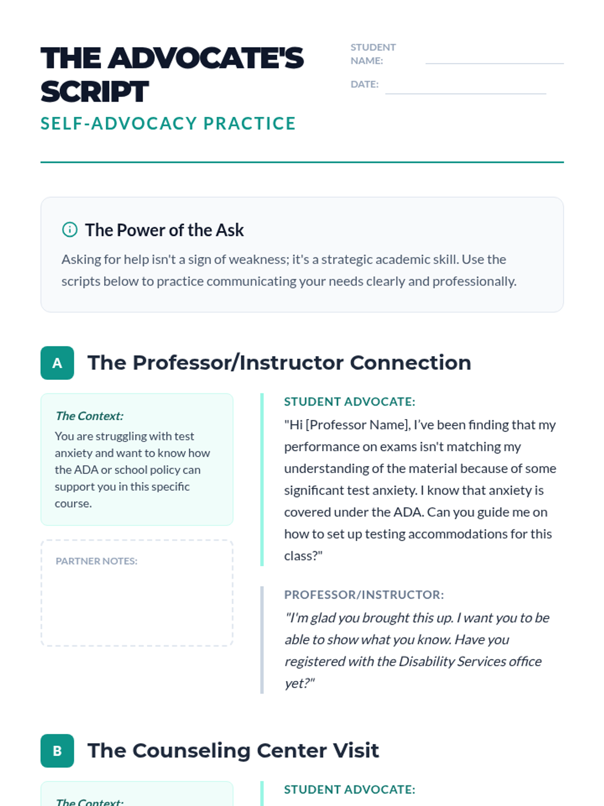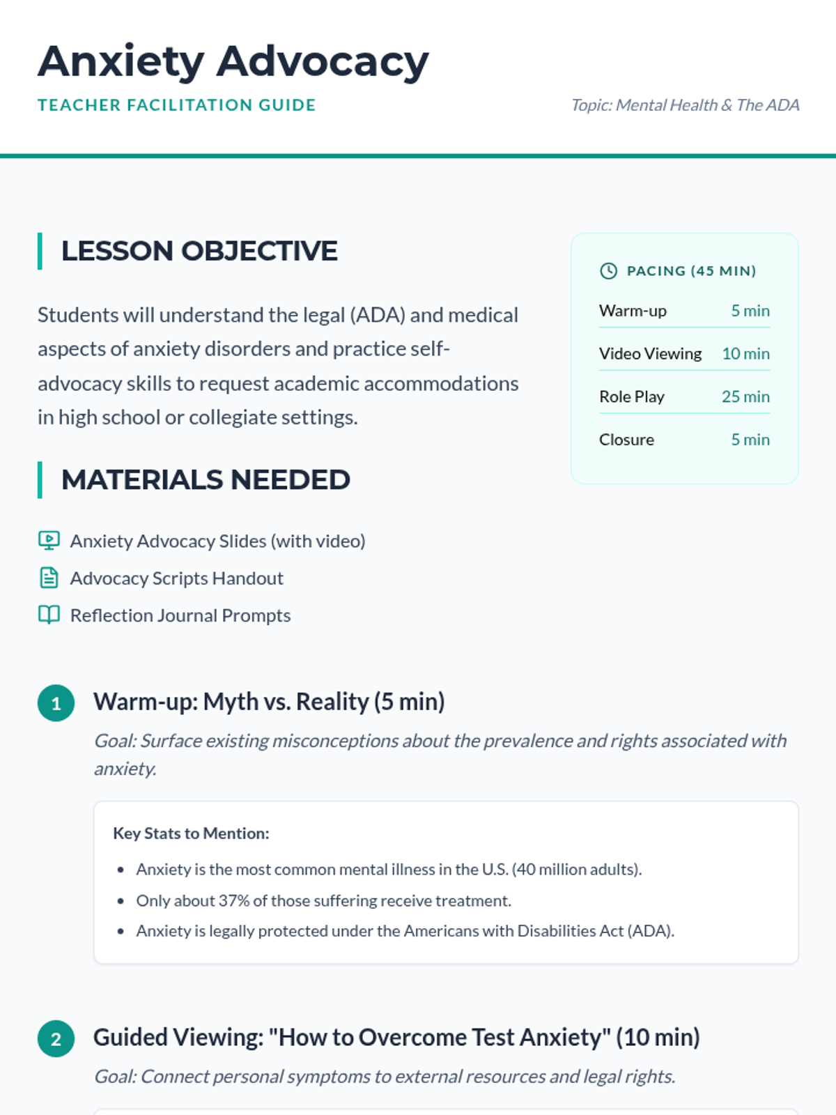 A comprehensive lesson designed for high school and college students to understand the legal protections for anxiety under the ADA and develop practical self-advocacy skills for academic accommodations.
