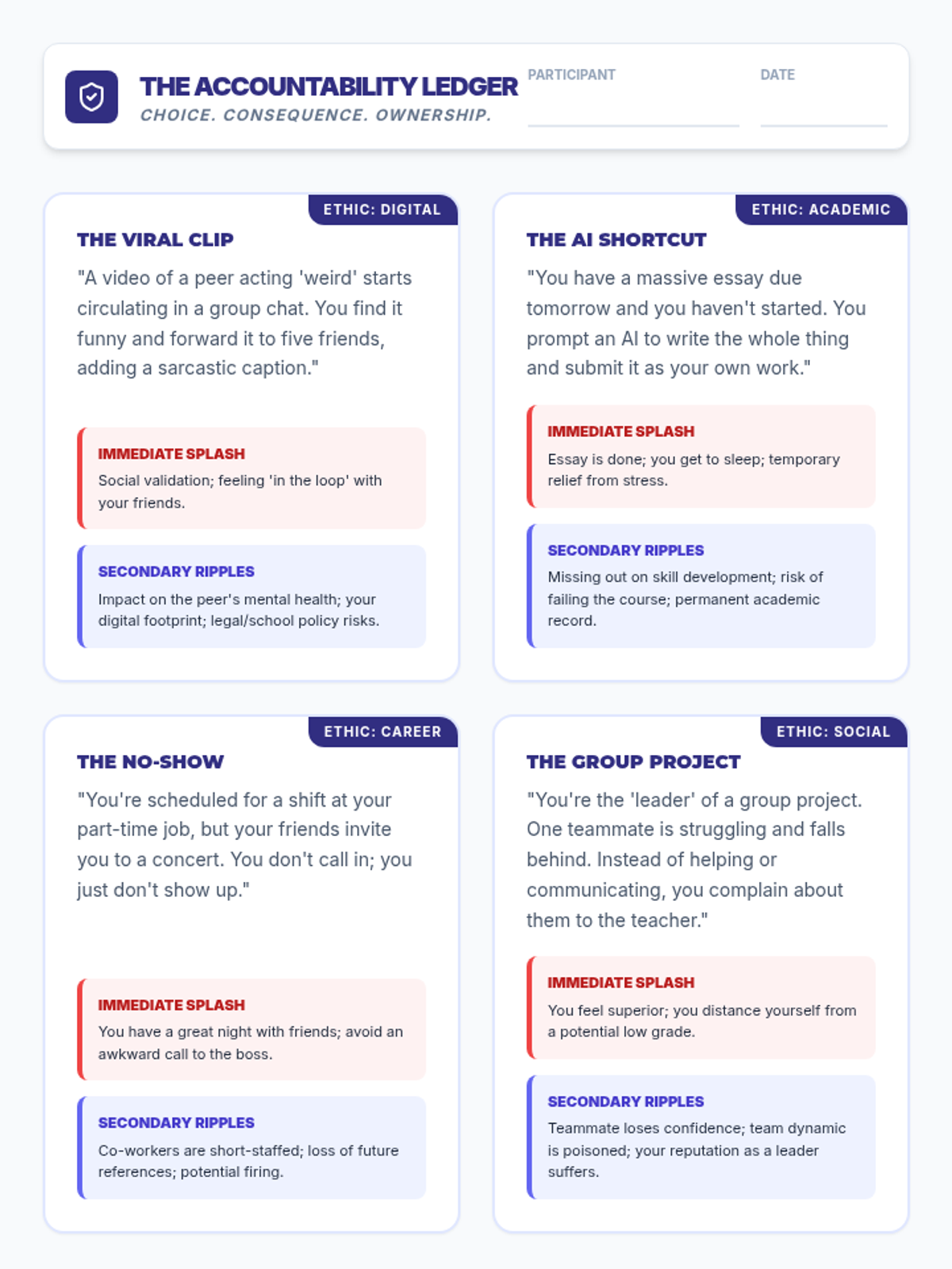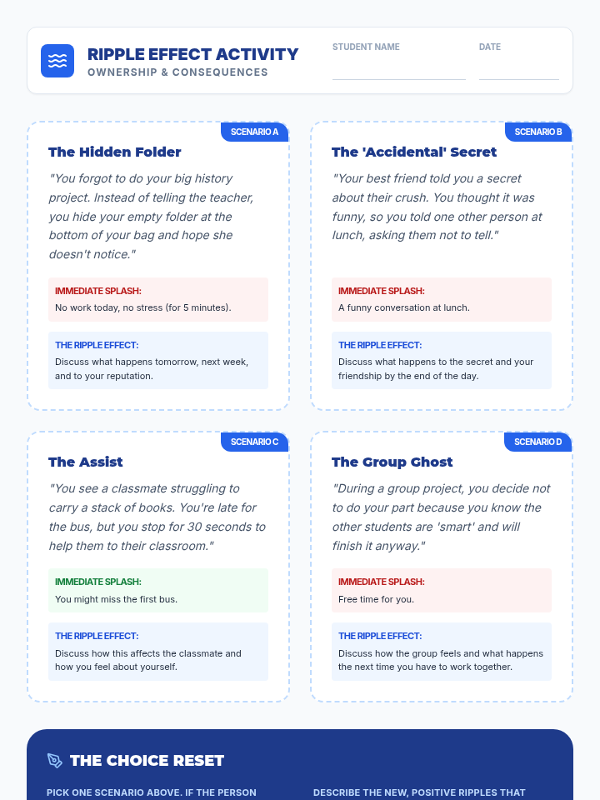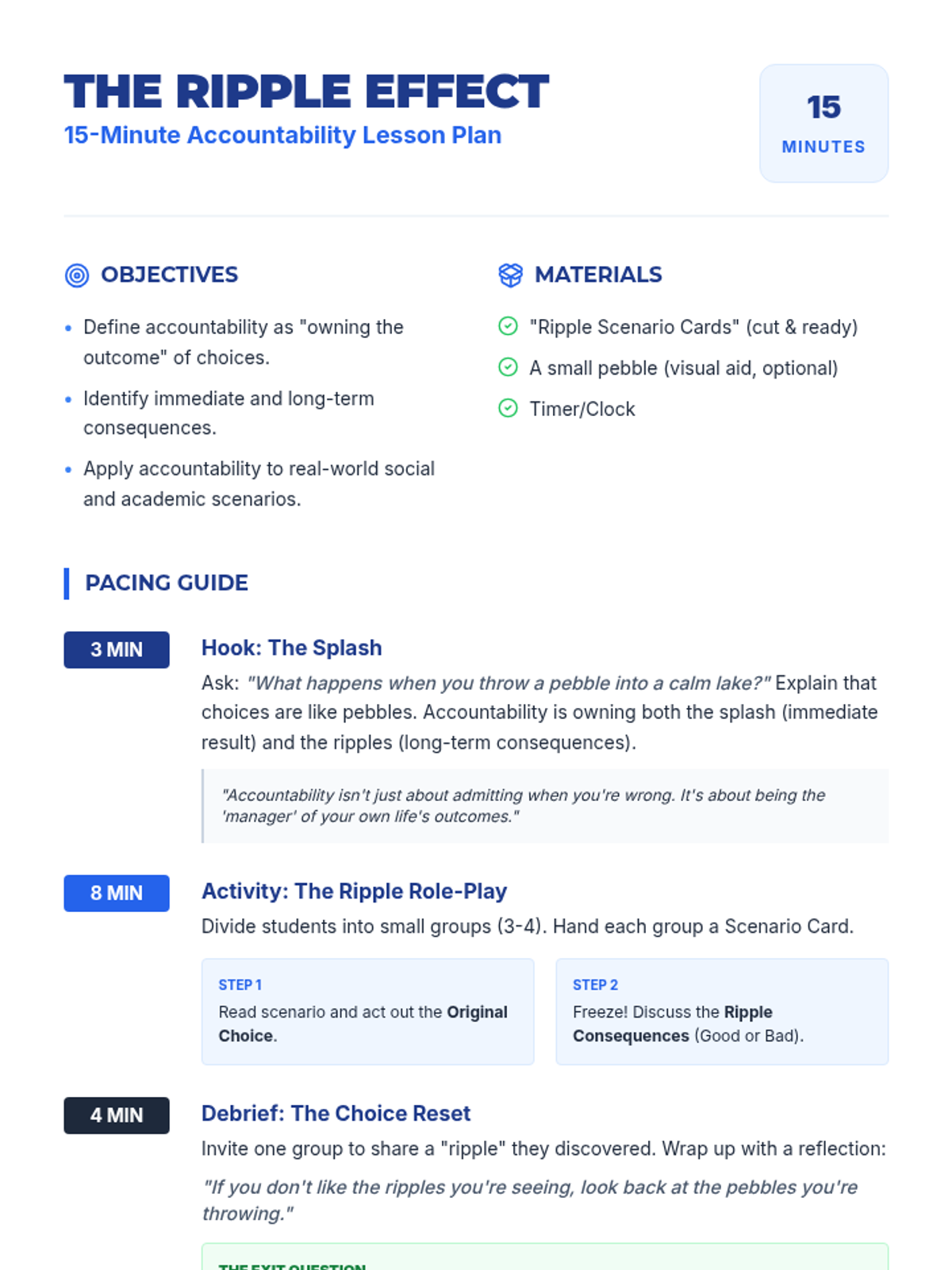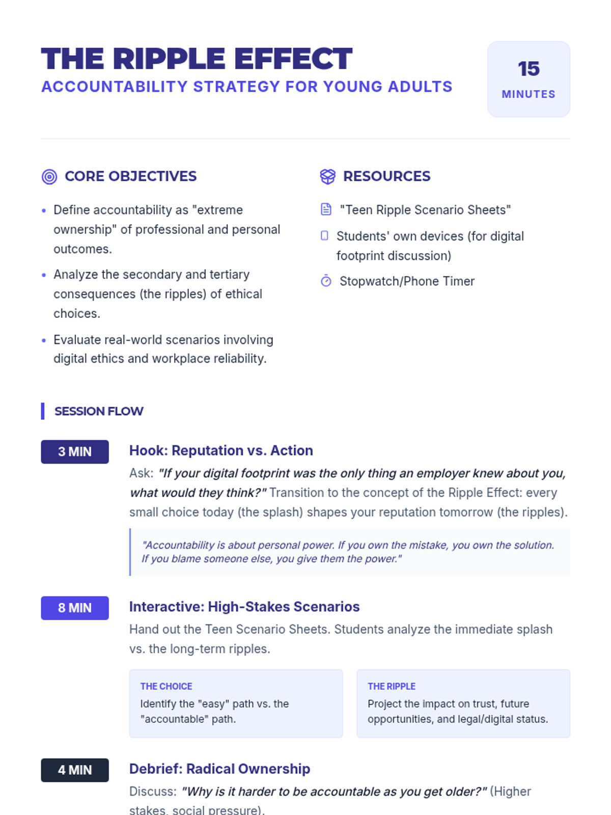 A 15-minute accountability lesson designed for teenagers and young adults. Explores the 'Ripple Effect' of choices through high-stakes scenarios like digital ethics, workplace reliability, and academic integrity.
