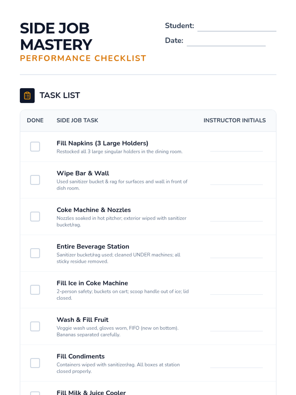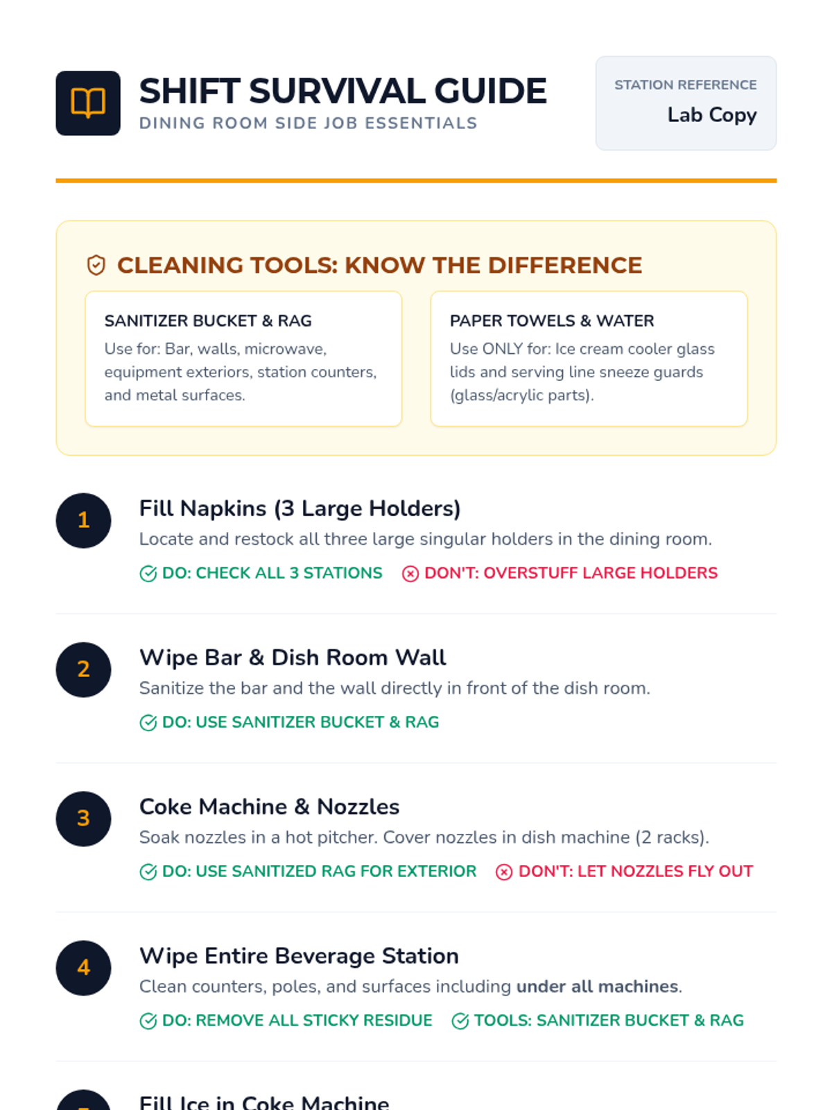 A comprehensive look at the essential 'side jobs' that keep a dining room running smoothly, focusing on sanitation, organization, and preparation.
