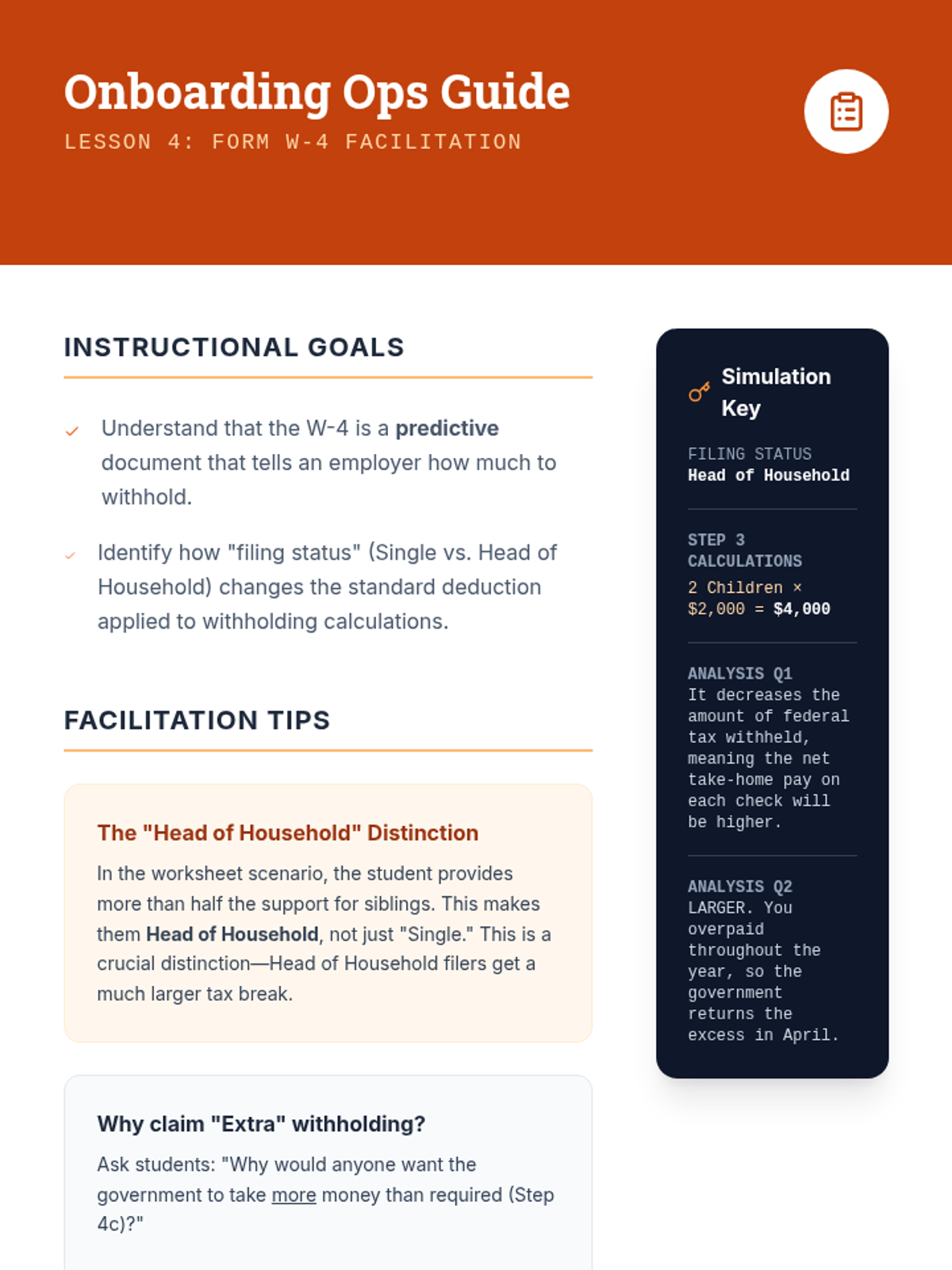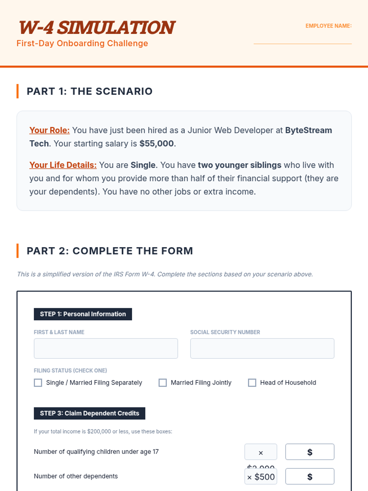 Students simulate the onboarding process by completing a Form W-4 and analyzing how their personal withholding decisions directly affect their net pay.