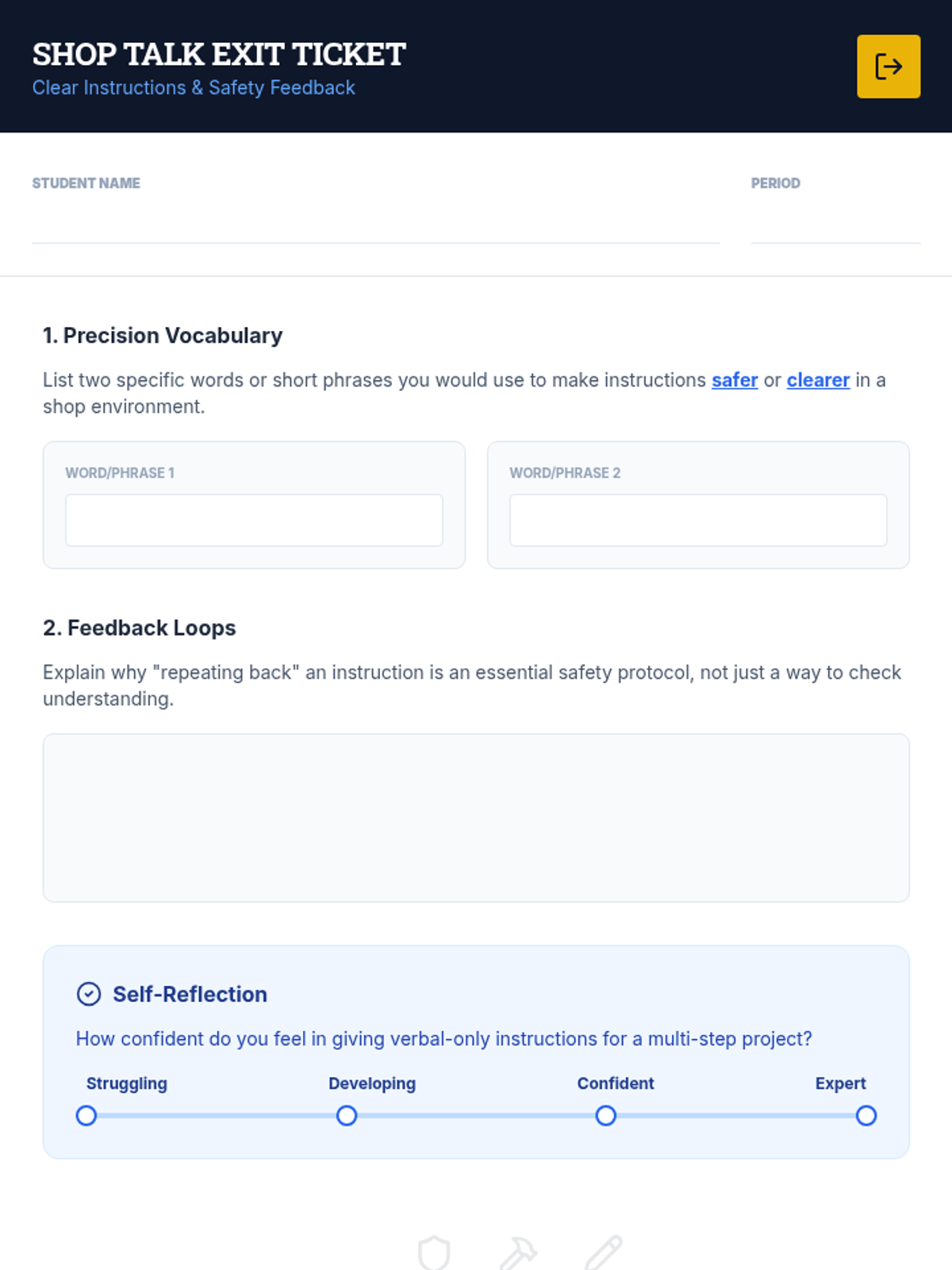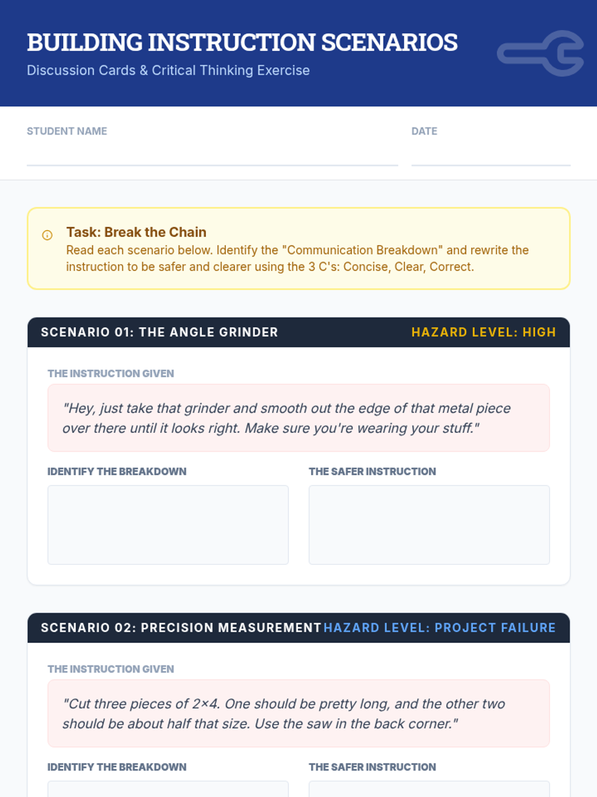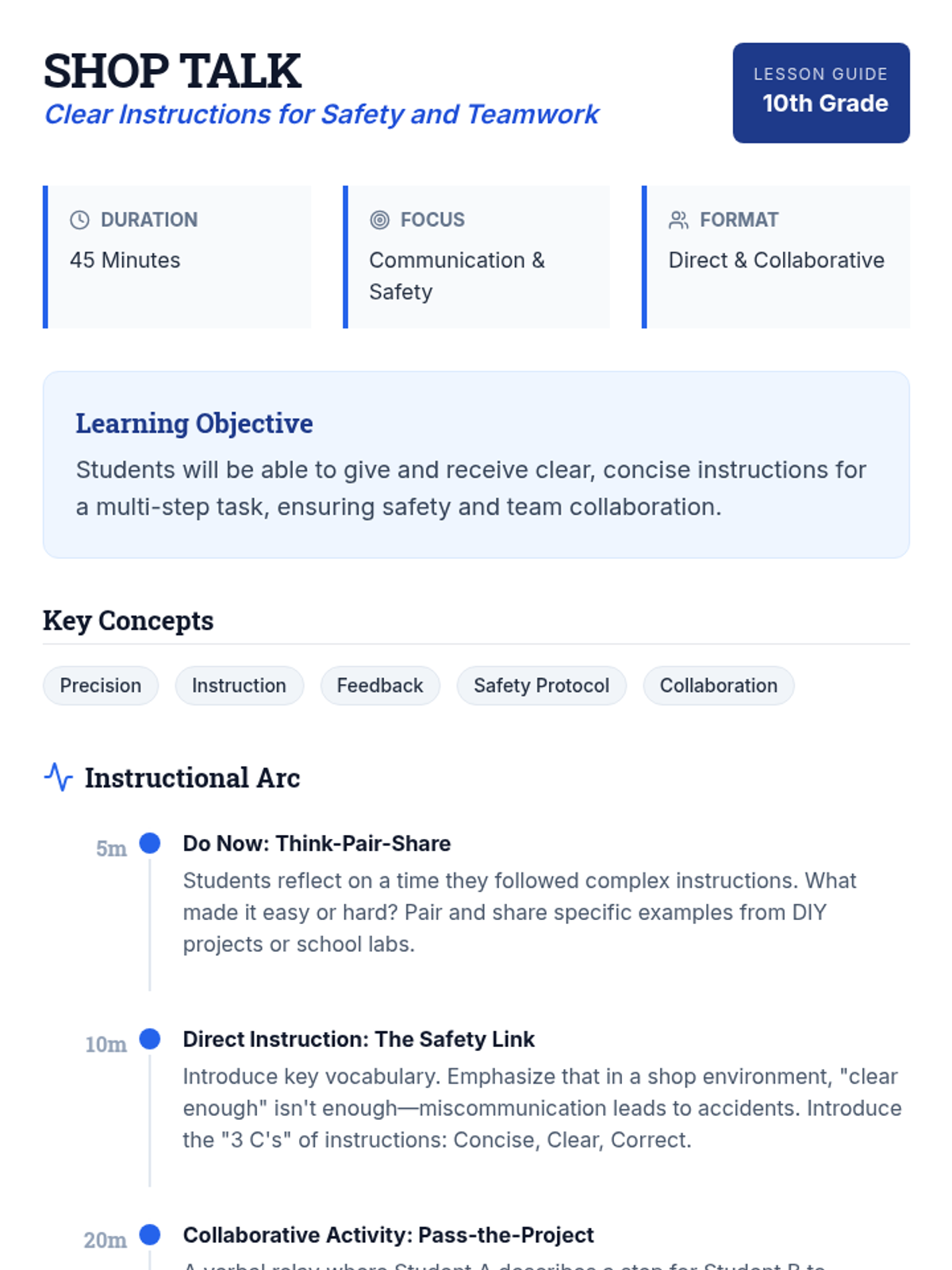 A 10th-grade lesson focused on the critical link between precise communication and shop safety. Students practice giving and receiving multi-step instructions through a collaborative simulation.