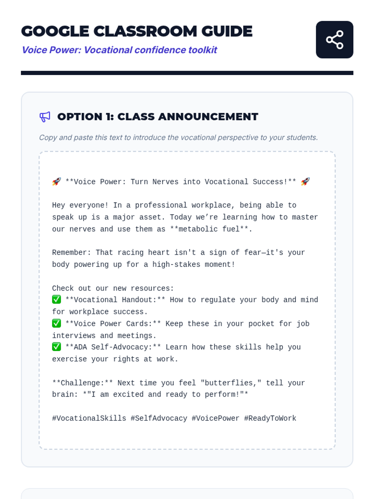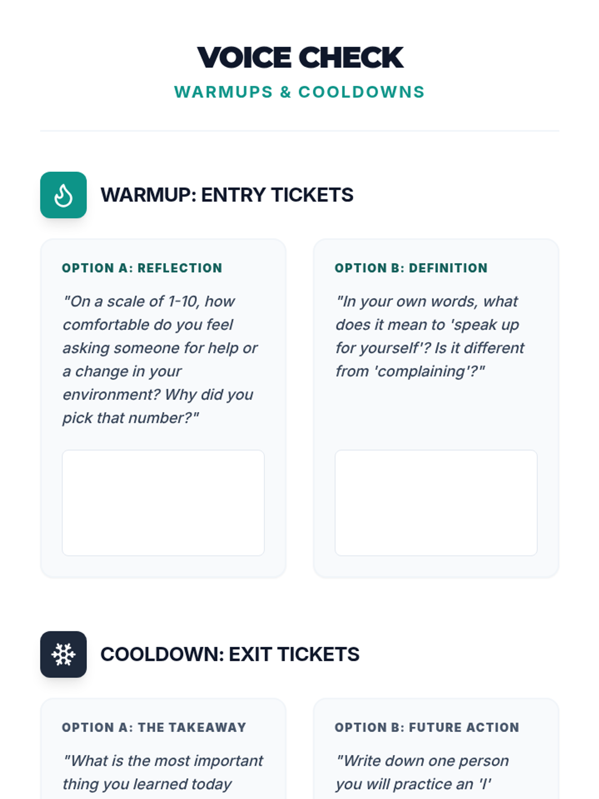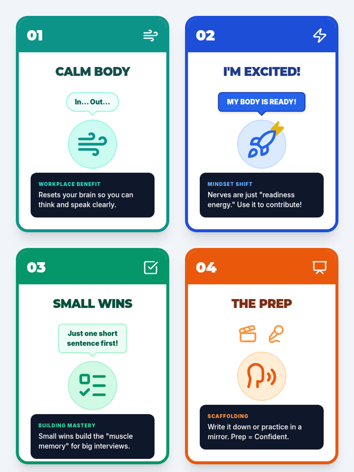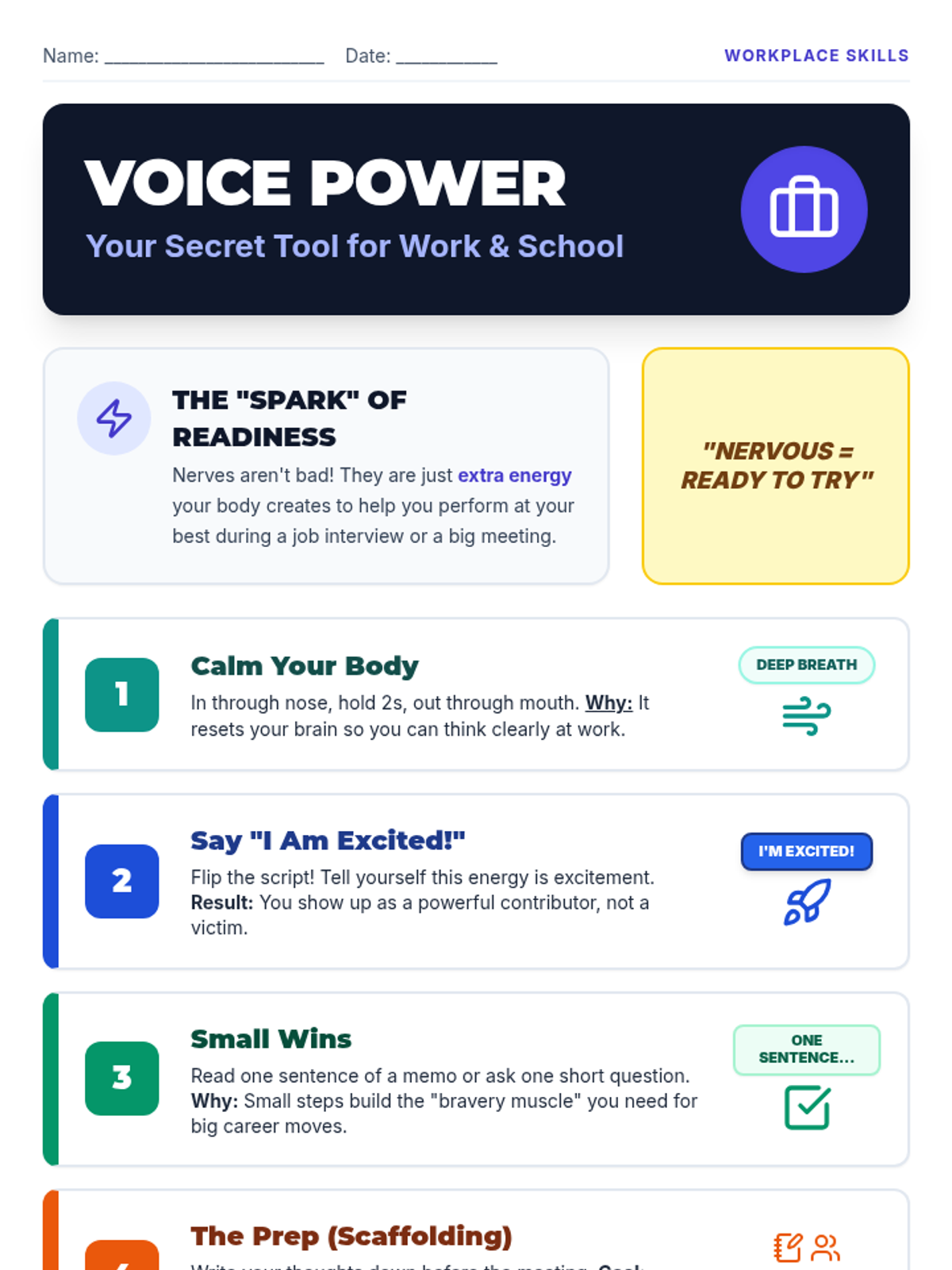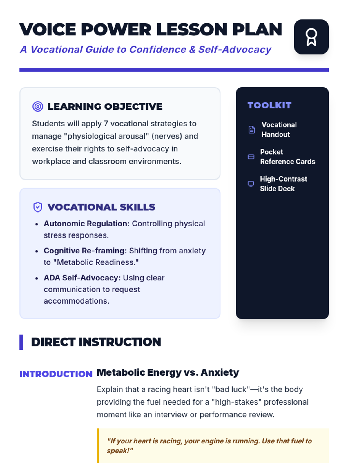 A lesson focused on building confidence and managing nervousness for self-advocacy and public speaking through seven practical steps.