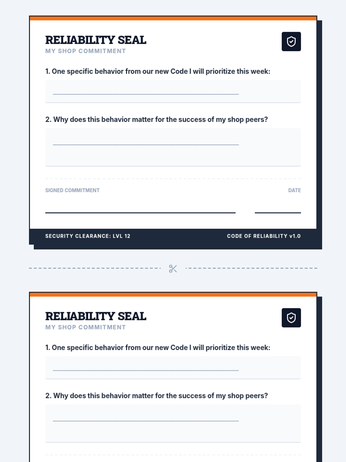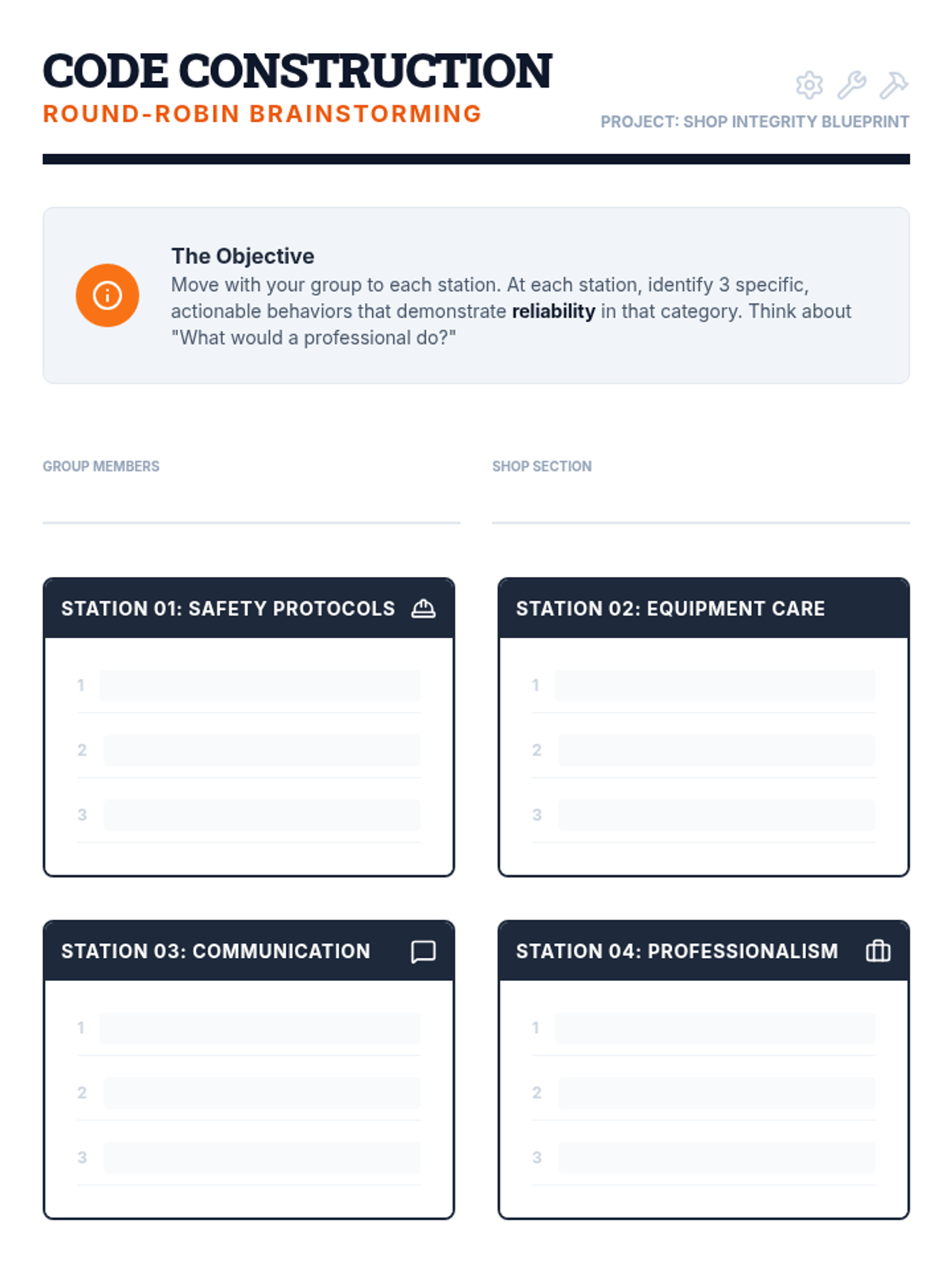 A 45-minute vocational shop lesson focused on co-creating a 'Code of Reliability' to ensure safety, accountability, and professional ethics in a collaborative workspace.