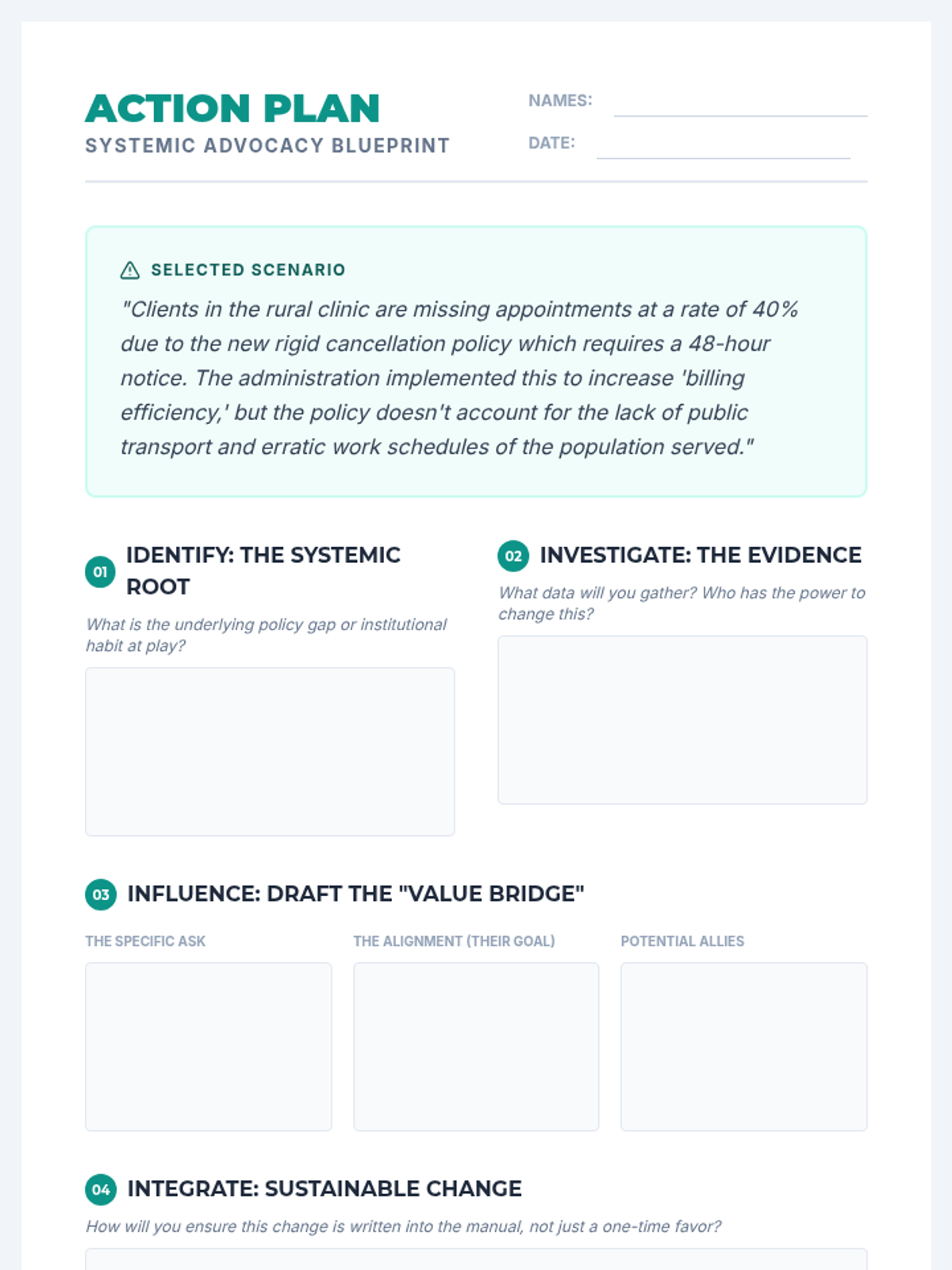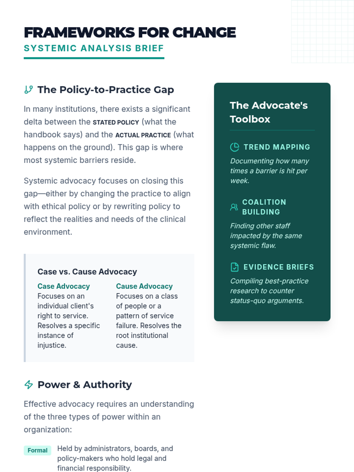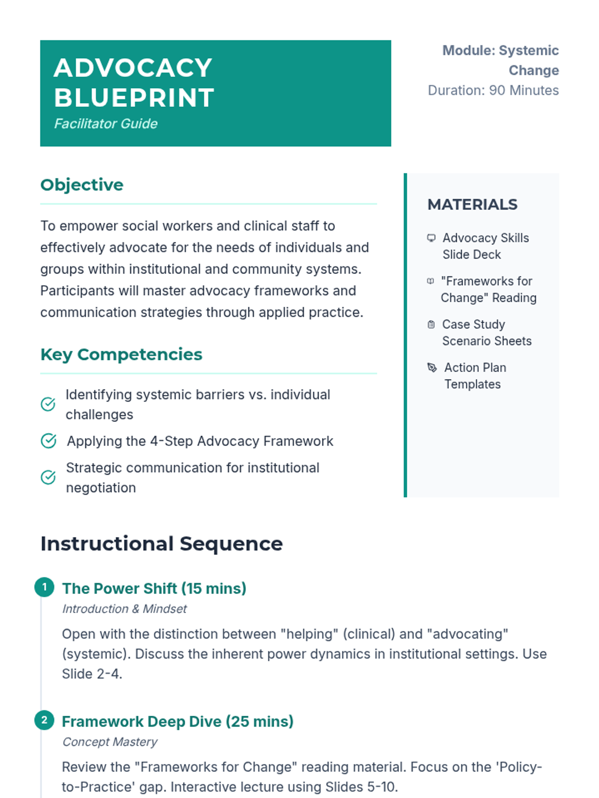 A comprehensive lesson designed for social workers and clinical staff to master advocacy frameworks, systemic communication strategies, and practical implementation through scenario-based analysis.