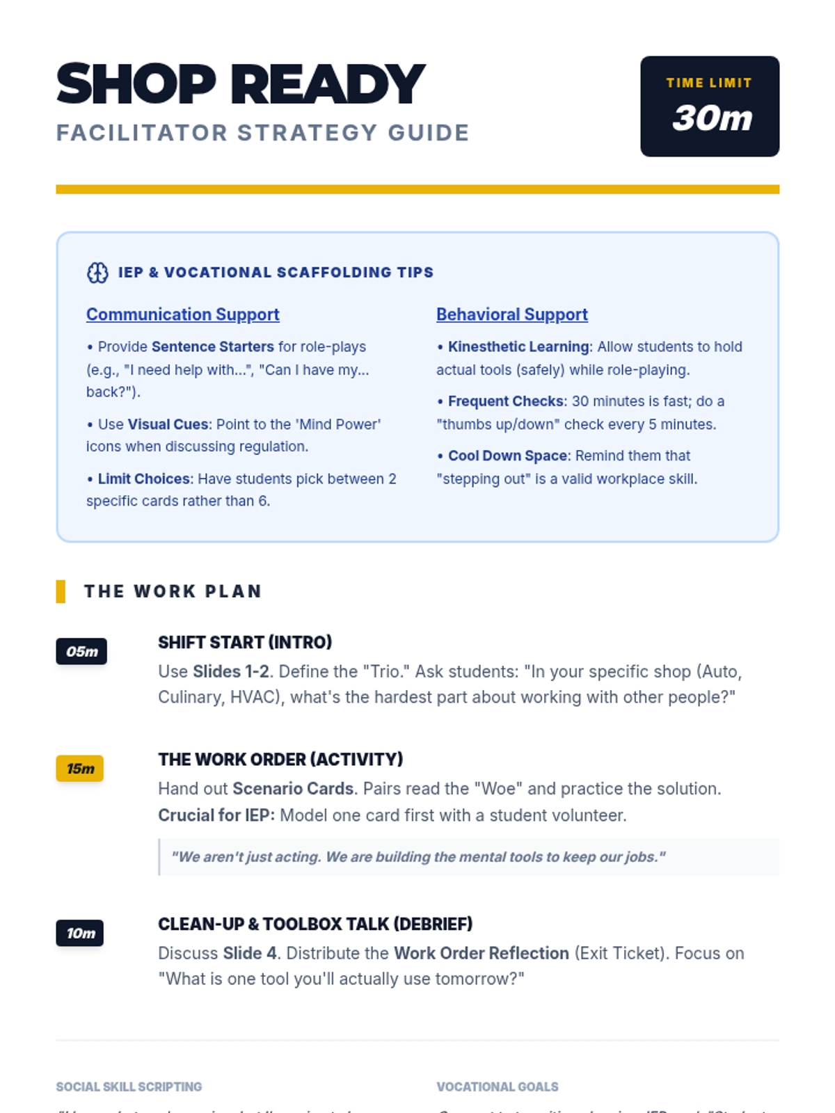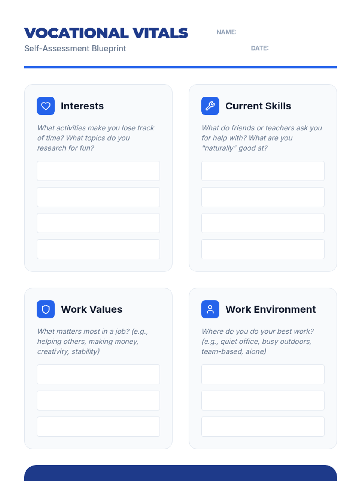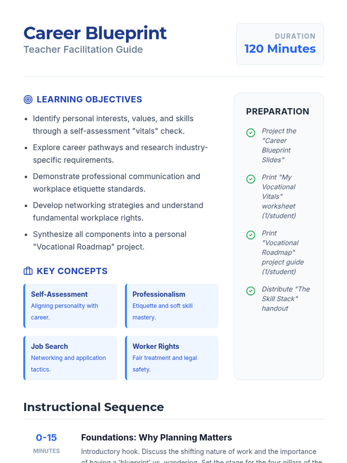 A comprehensive 2-hour lesson covering the essential stages of vocational planning, from self-discovery to workplace rights. Includes a slide deck, teacher's guide, student worksheets, and a guided project outline.