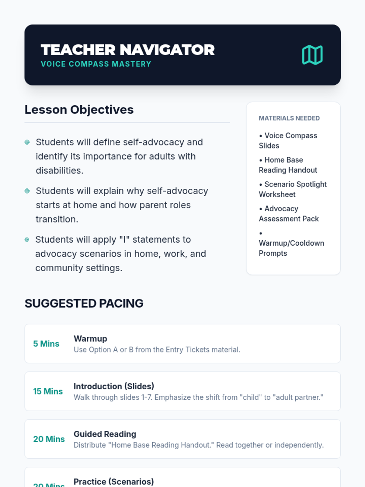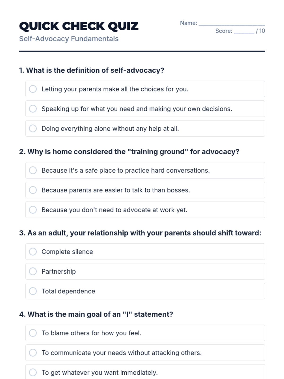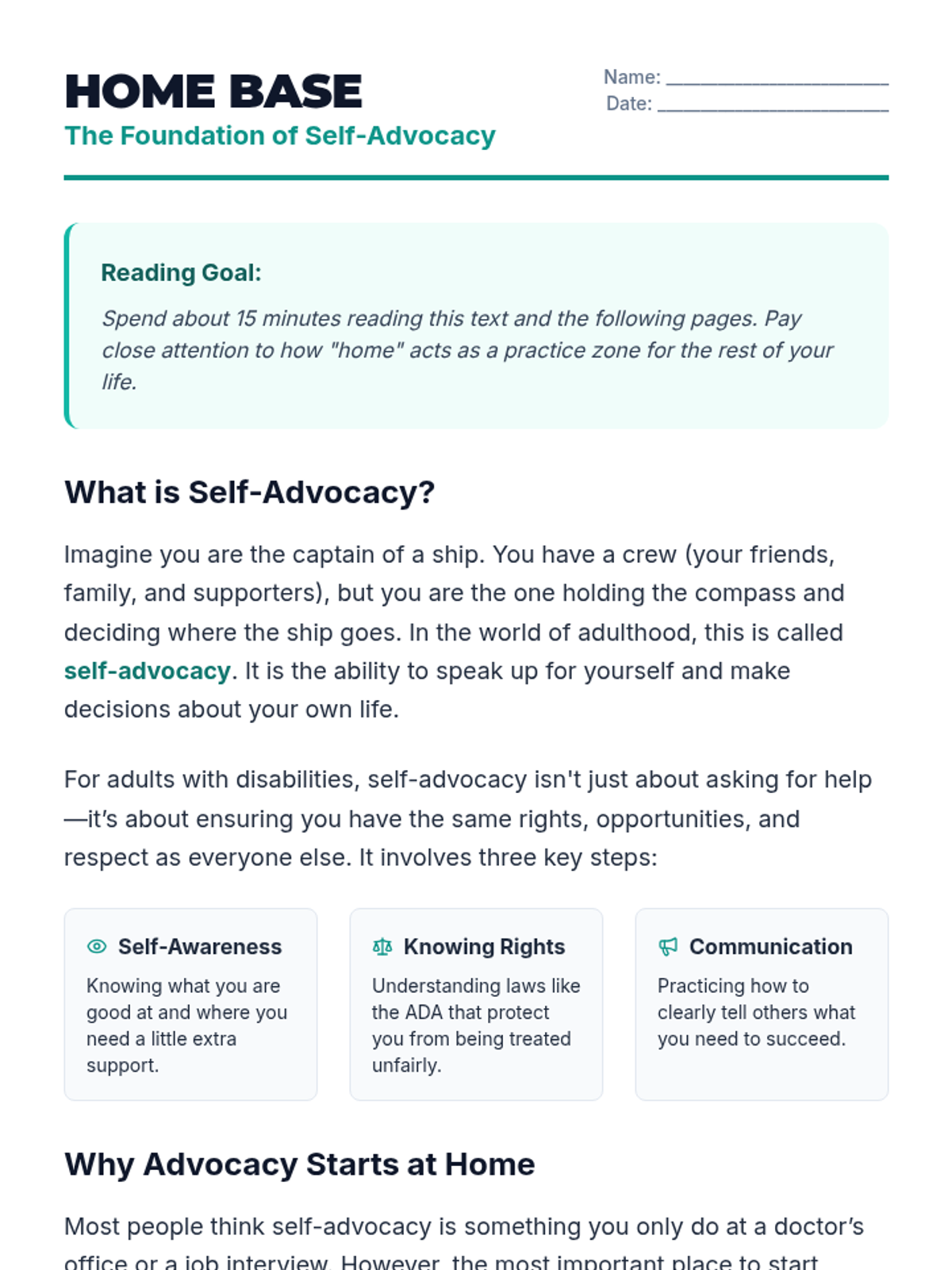 This lesson focuses on the transition of self-advocacy from childhood to adulthood, specifically highlighting how adults with disabilities can advocate for themselves at home, at work, and in the community. It emphasizes that advocacy skills are built at home and provides practical strategies for communicating with parents as an adult.