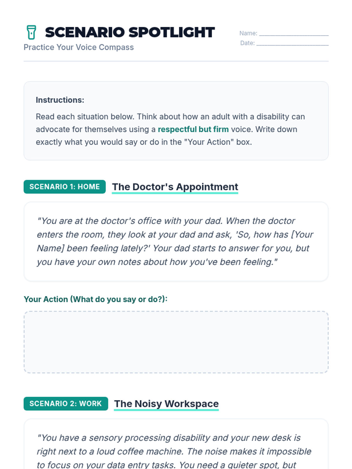 Students practice professional communication and self-advocacy by simulating requests for accommodations in college and workplace settings.