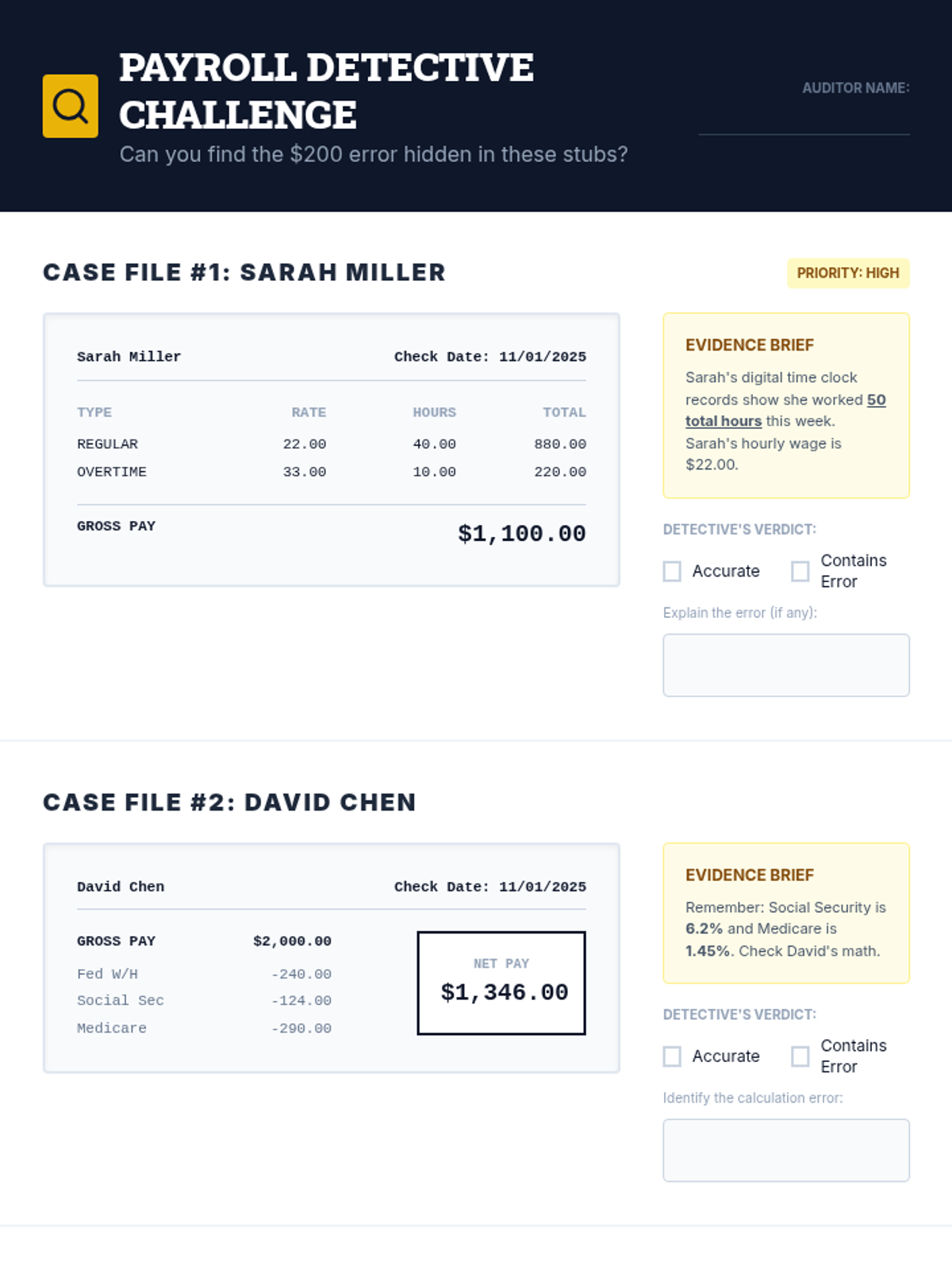 Students act as payroll auditors to identify errors in sample paystubs, reinforcing their ability to verify their own compensation and advocate for accurate payment.