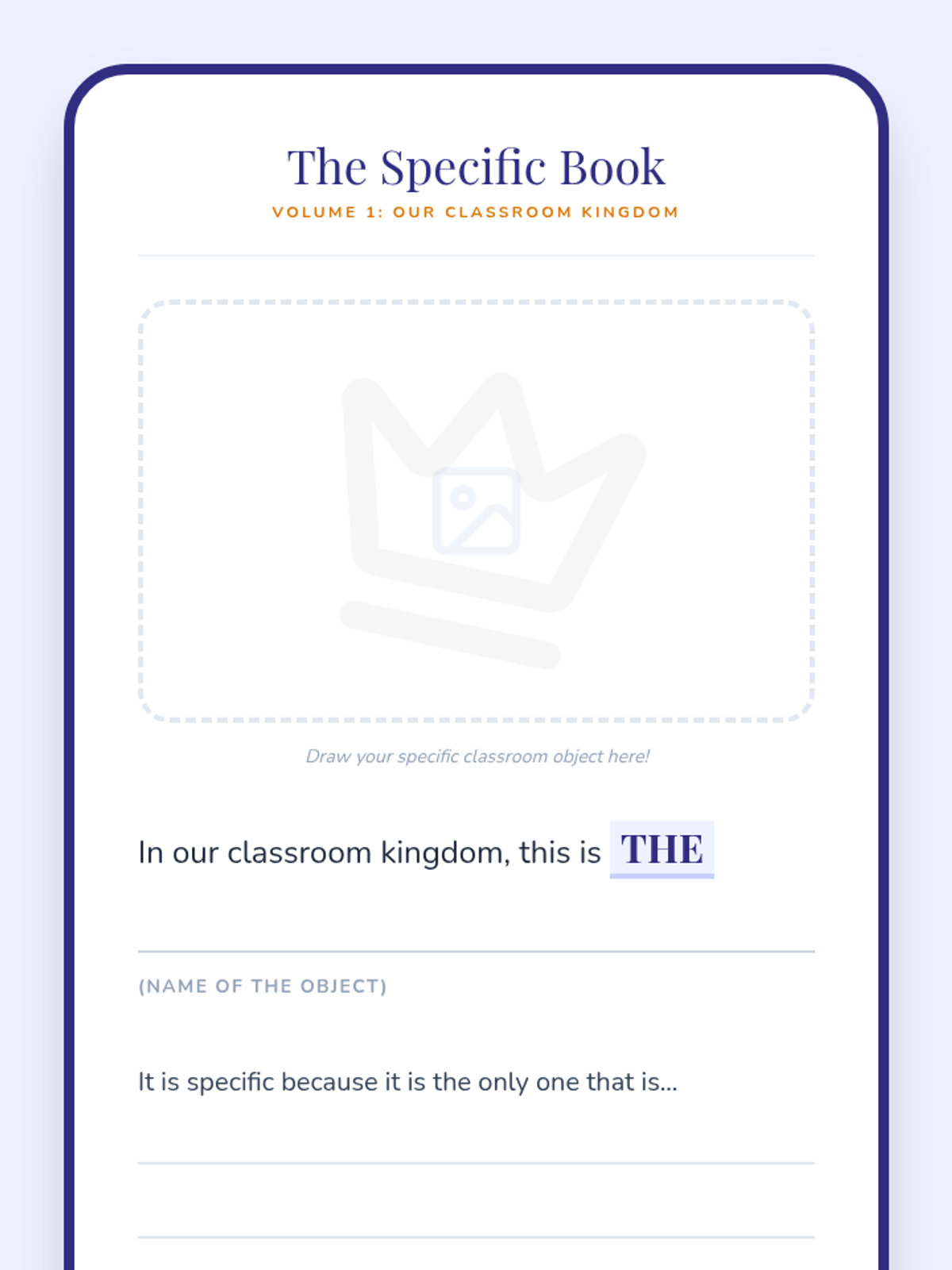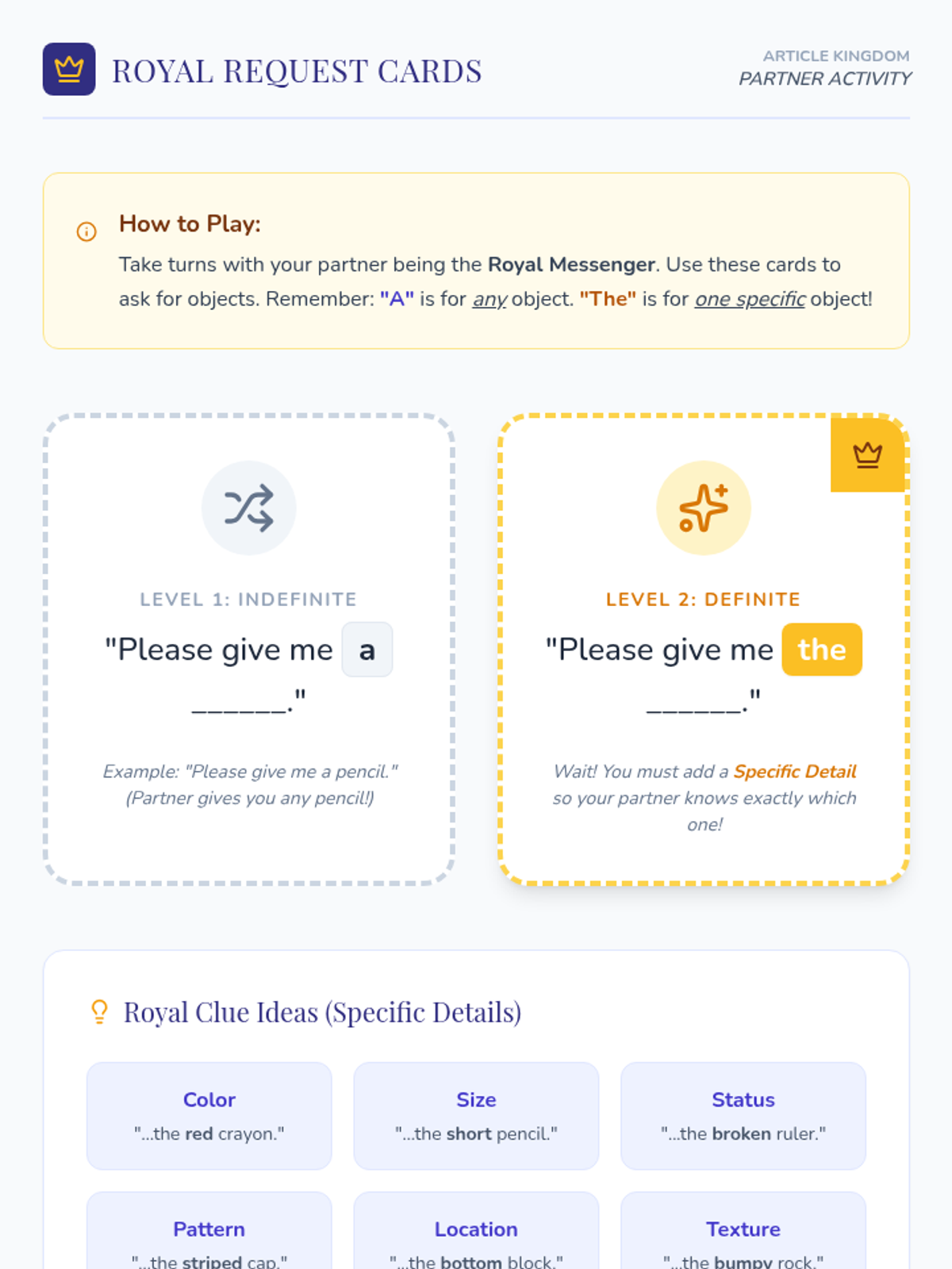 A royal-themed lesson where 2nd graders learn the difference between definite (the) and indefinite (a/an) articles using classroom objects and a regal metaphor.
