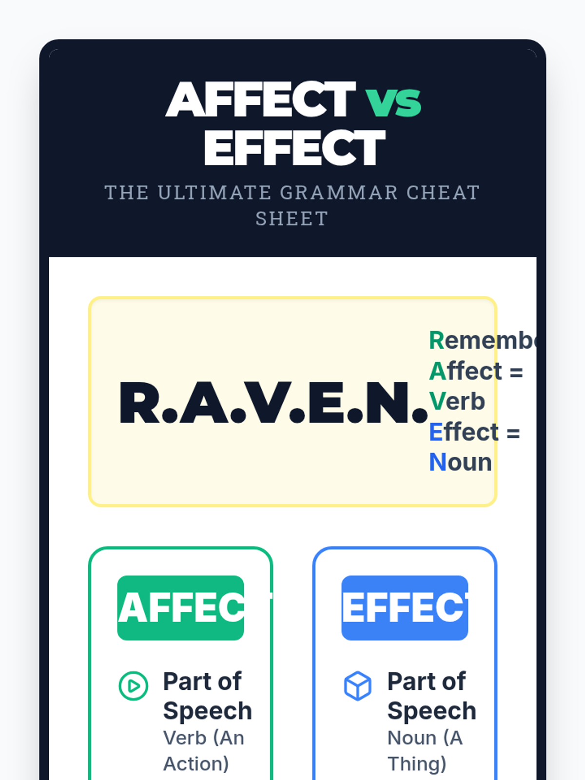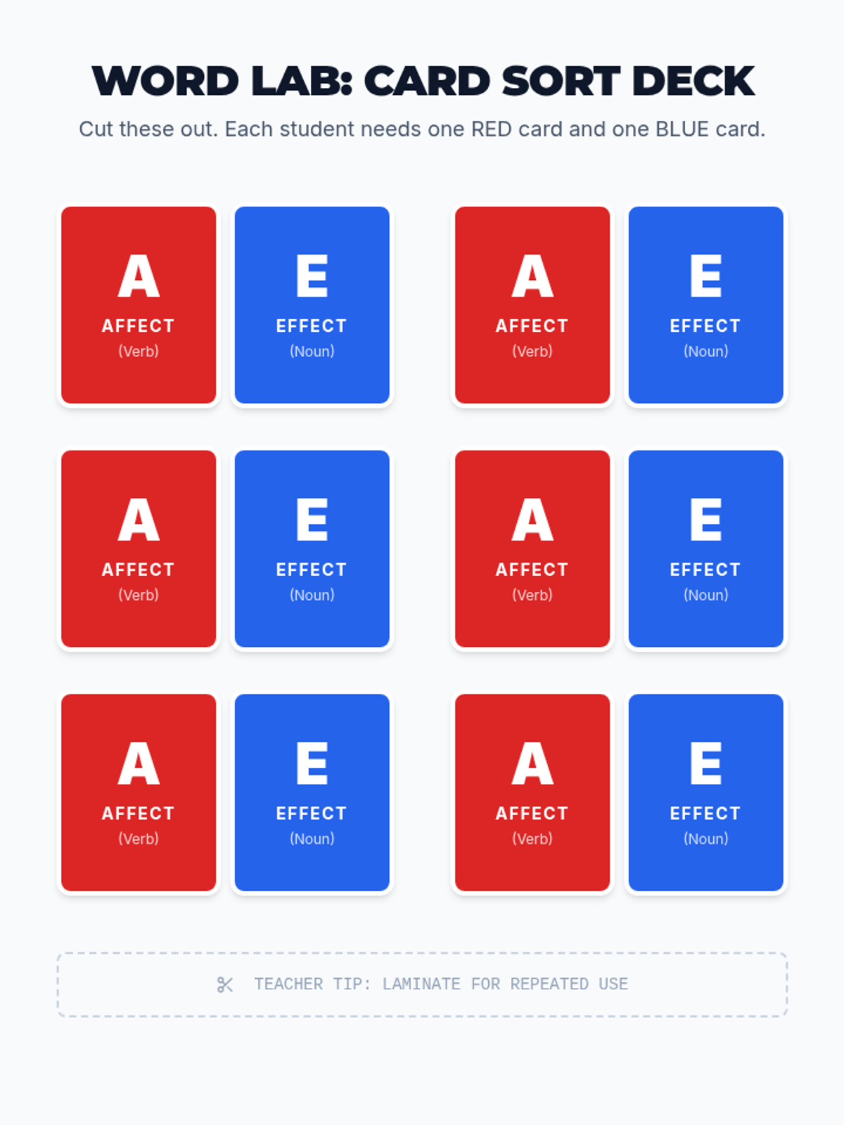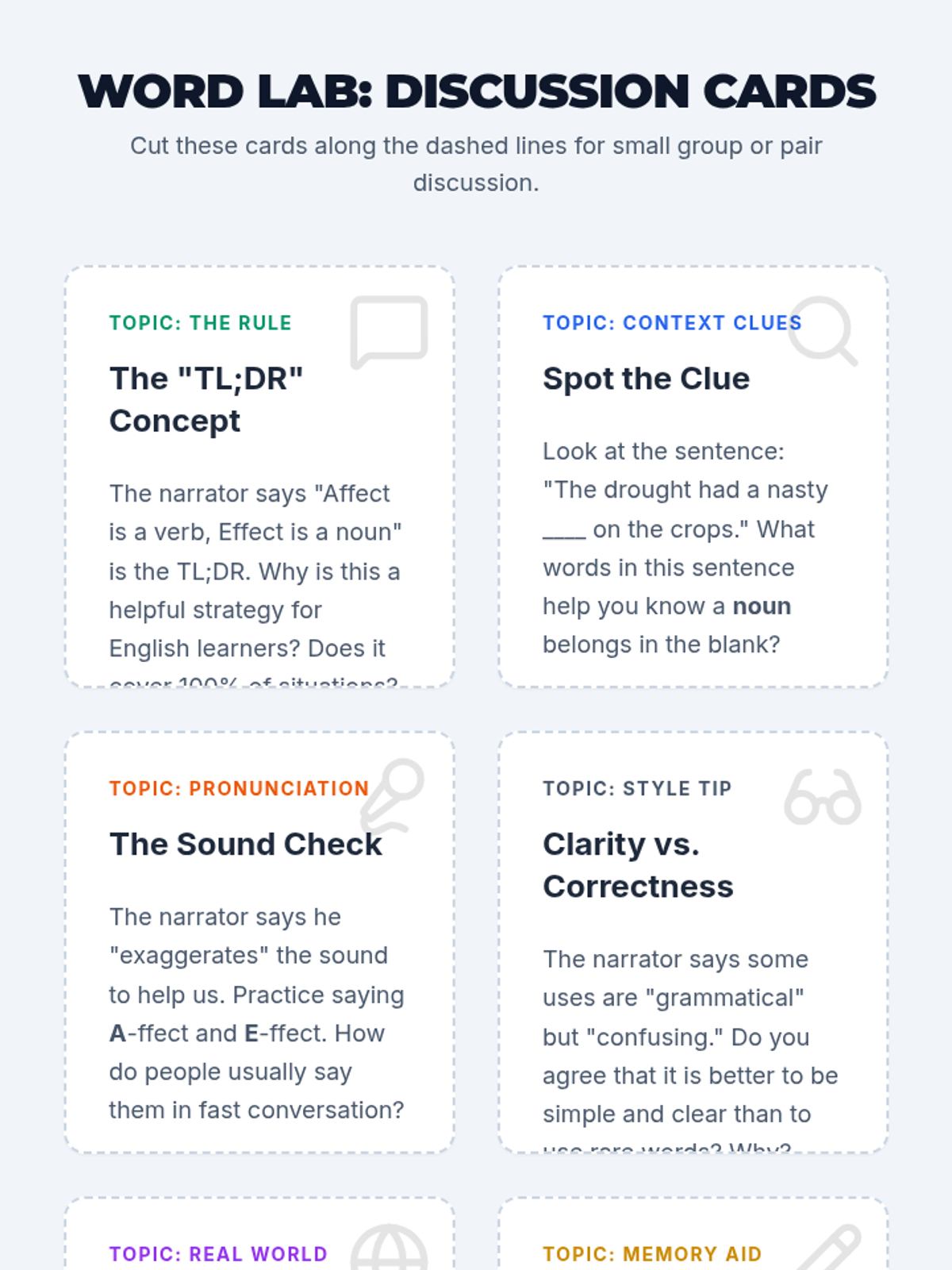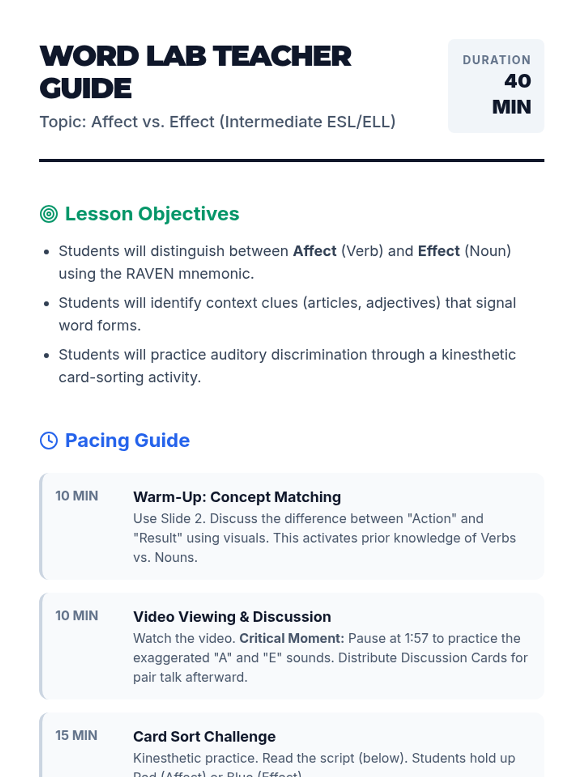 An intermediate ESL/ELL lesson focused on distinguishing between 'affect' and 'effect' using word forms, context clues, and a visual mnemonic. Includes a video-based discussion, a kinesthetic card-sorting activity, and a visual anchor chart.