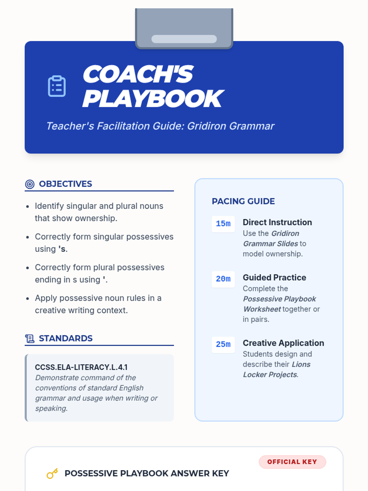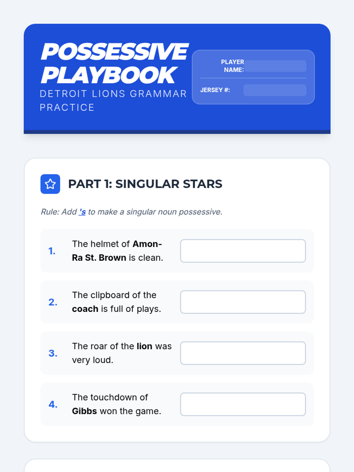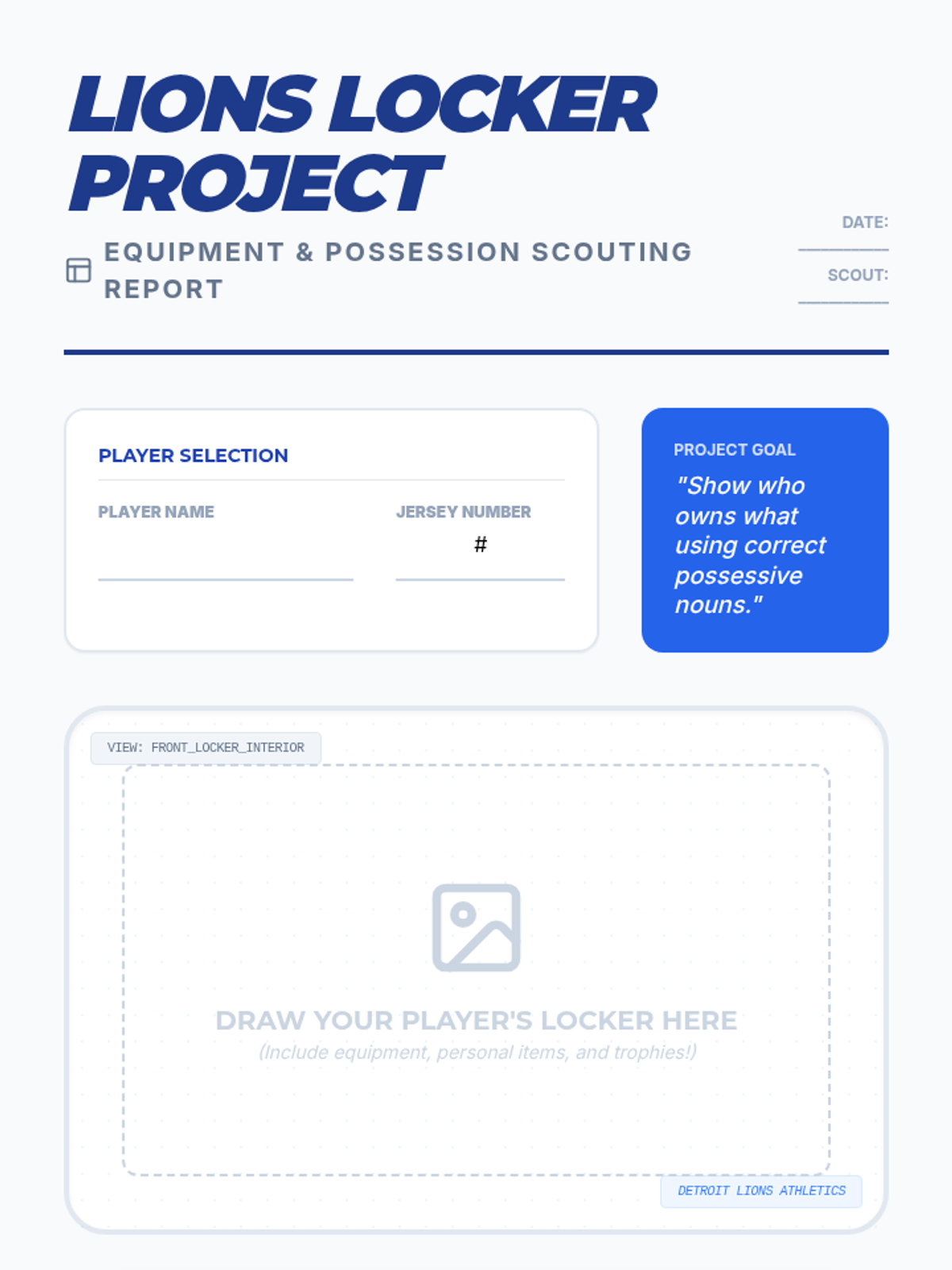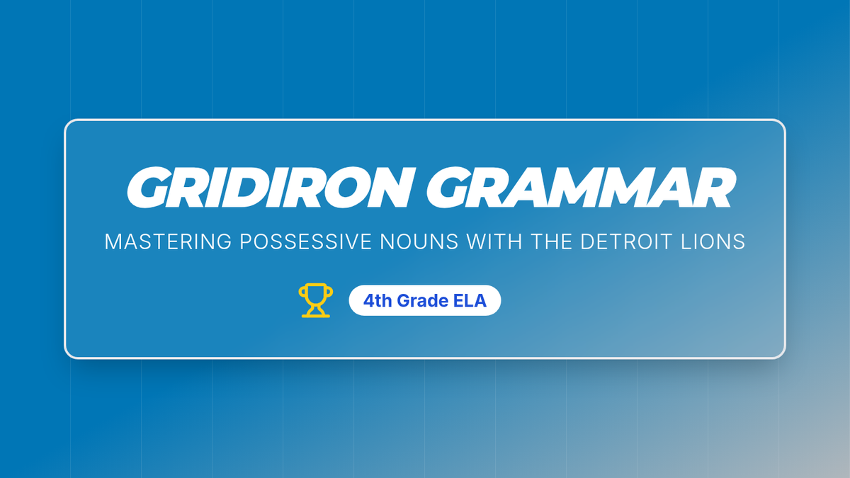 A fourth-grade grammar lesson that uses Detroit Lions players, facts, and equipment to teach singular and plural possessive nouns. Students will identify, form, and use possessive nouns through interactive slides, a practice worksheet, and a creative locker-description project.
