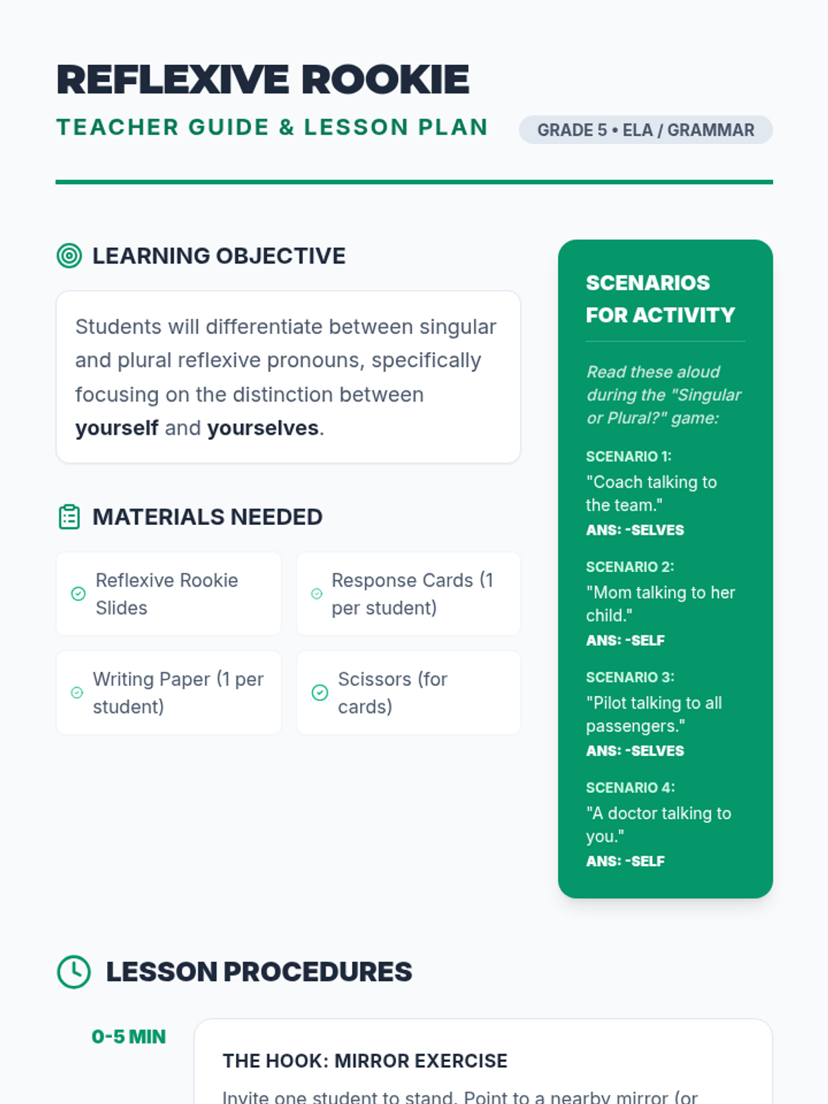 A grammar lesson for 5th graders focusing on the distinction between singular 'yourself' and plural 'yourselves' through sports-themed scenarios and writing exercises.