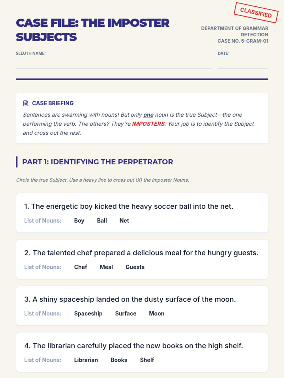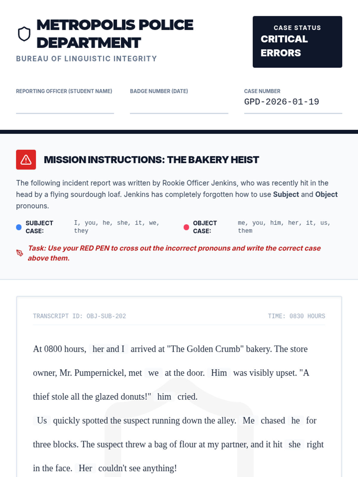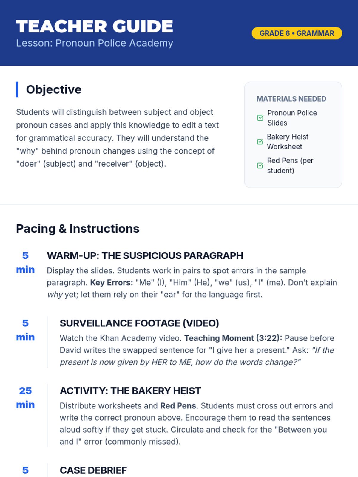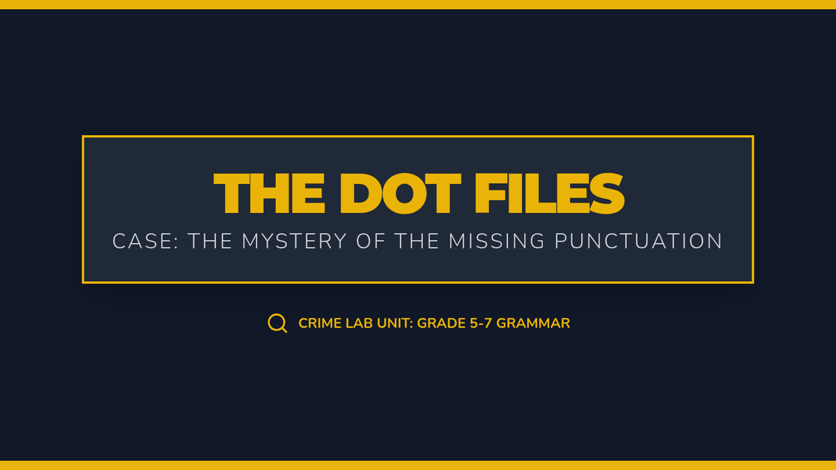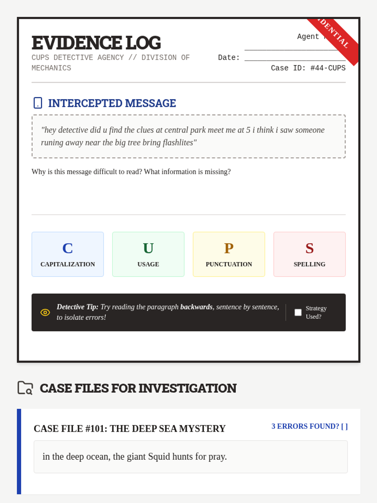 Students become "editing detectives" using the CUPS strategy (Capitalization, Usage, Punctuation, Spelling) to investigate and correct error-ridden "Case Files," including a tricky Red Herring.