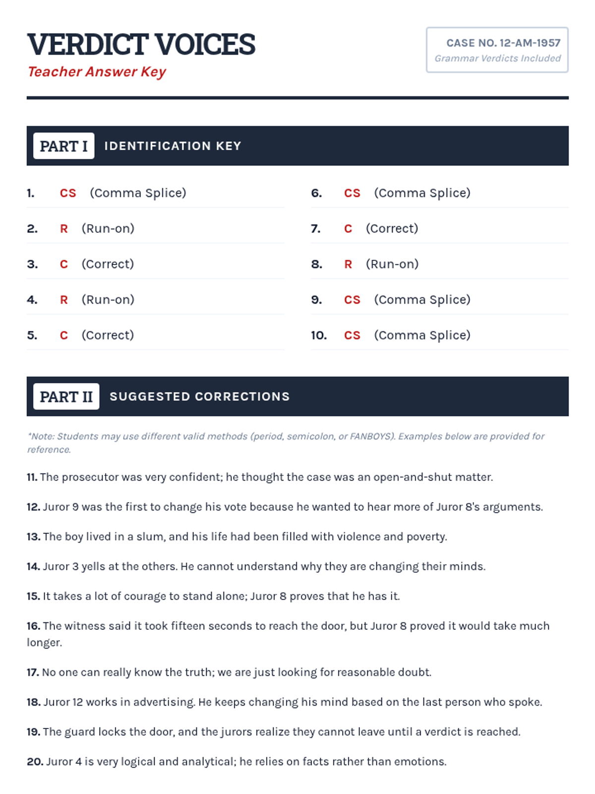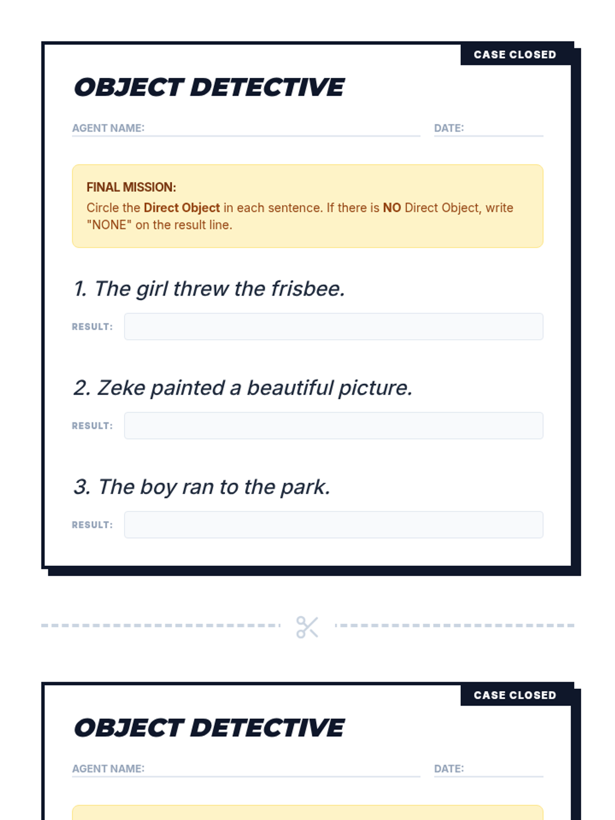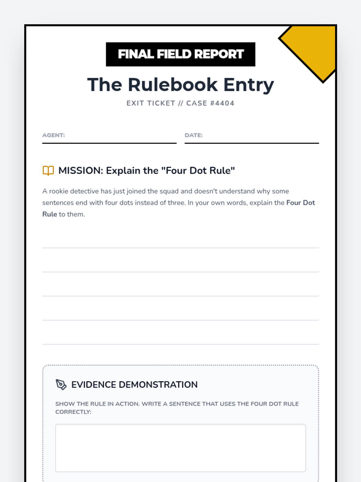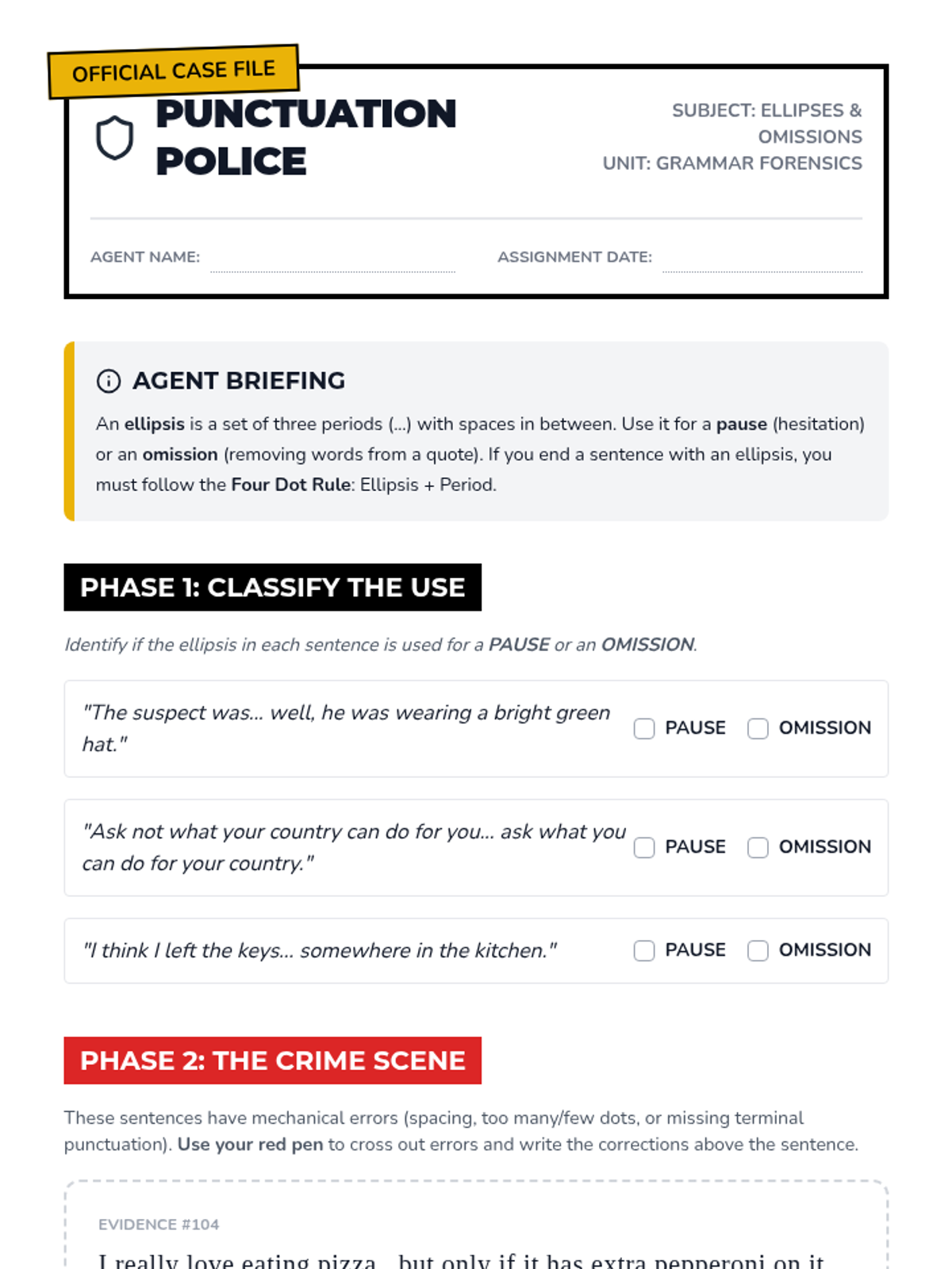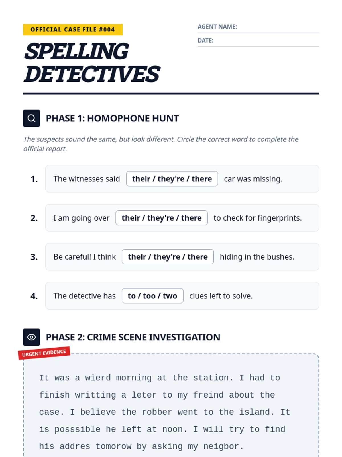 Students become "editing detectives" using the CUPS strategy (Capitalization, Usage, Punctuation, Spelling) to investigate and correct error-ridden "Case Files," including a tricky Red Herring.