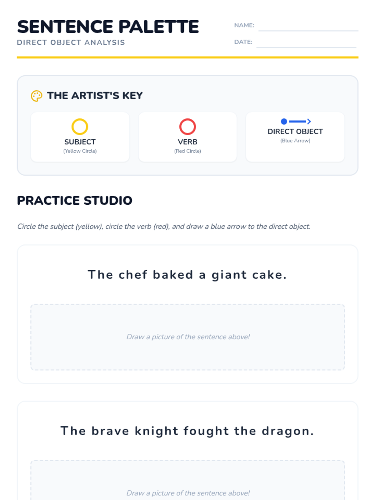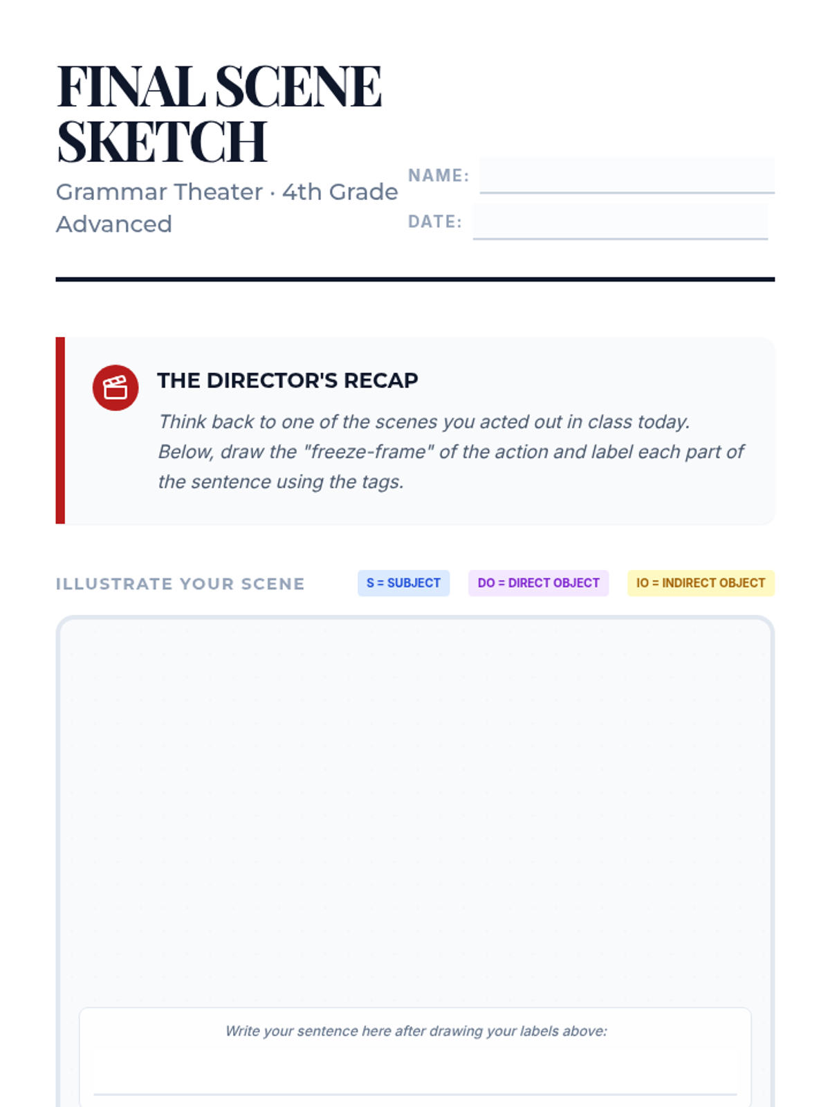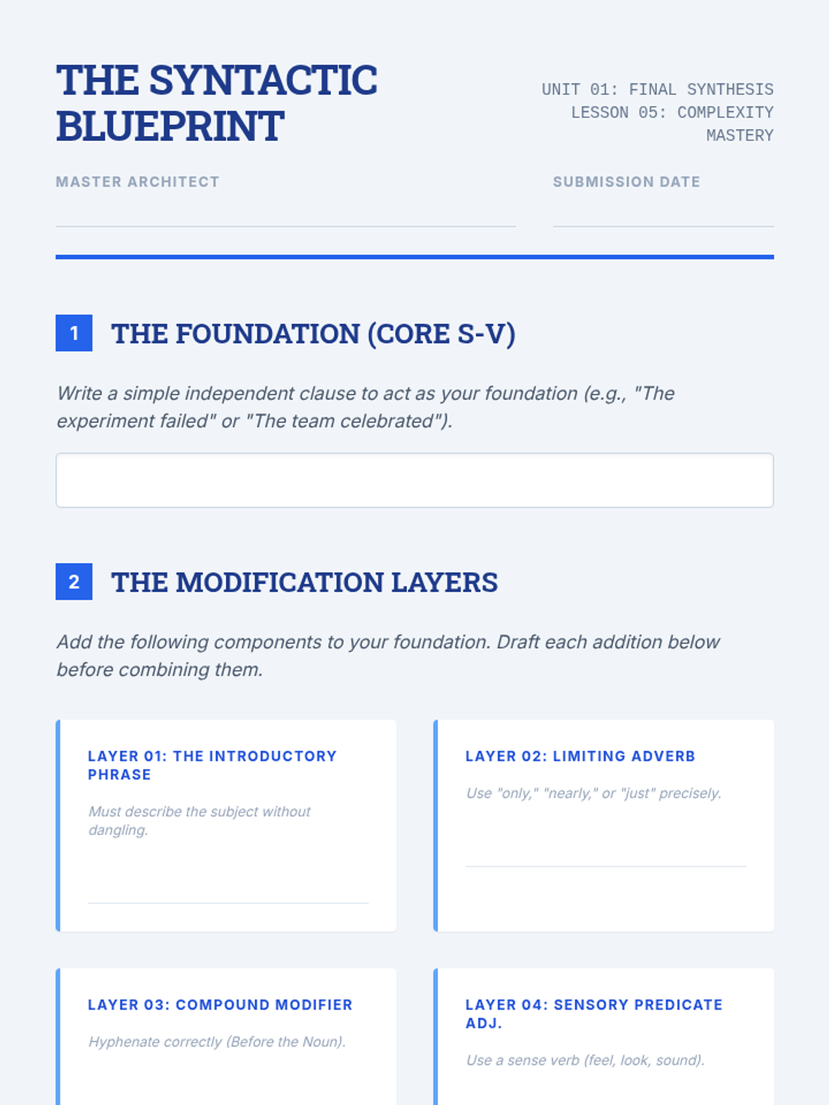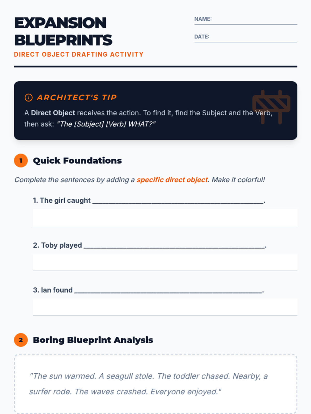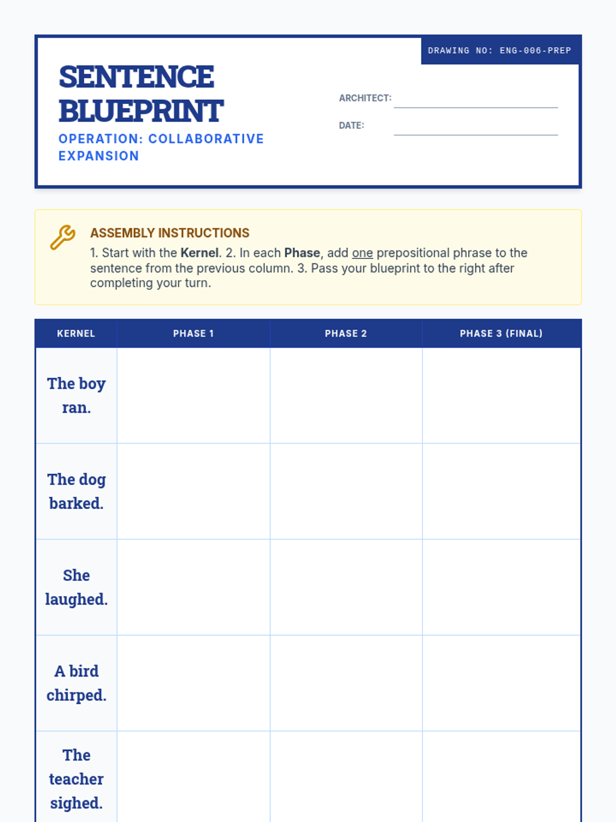 Students learn the essential components of a sentence—subject and predicate—through an architectural lens. They analyze model 'blueprints' and construct their own sturdy, descriptive sentences.