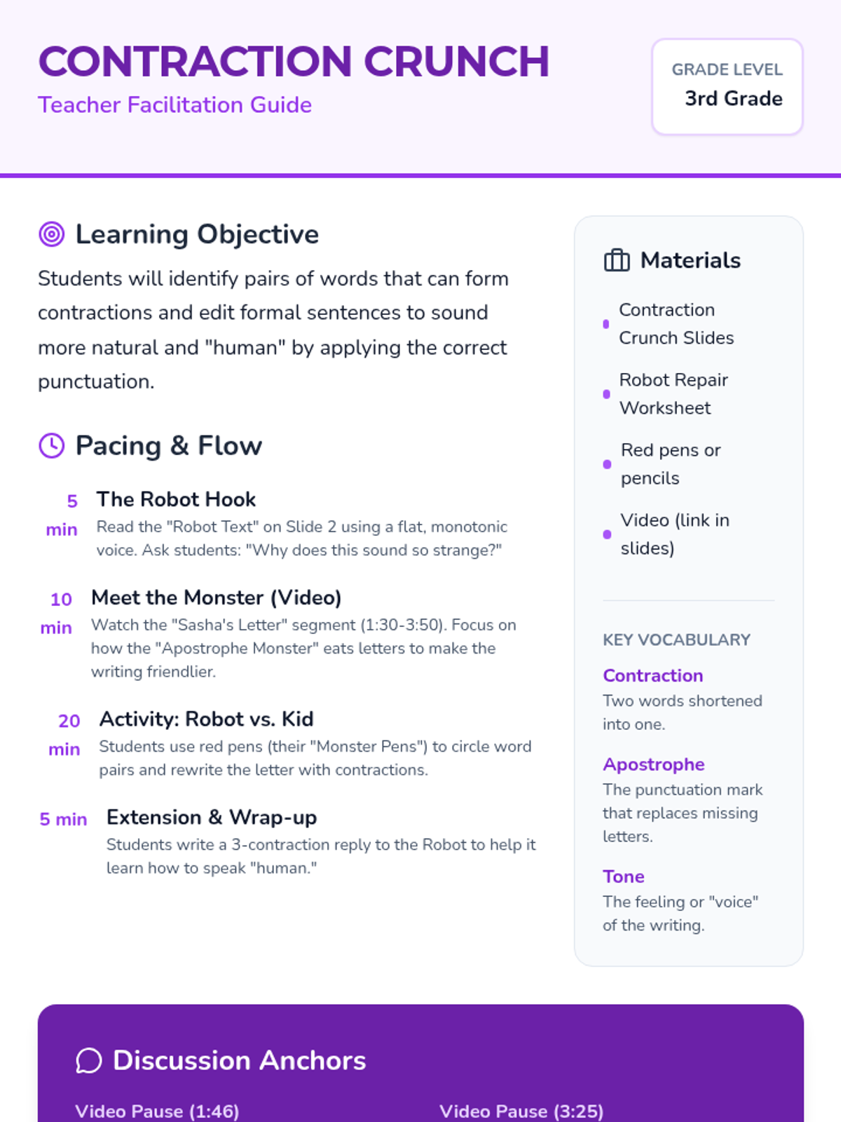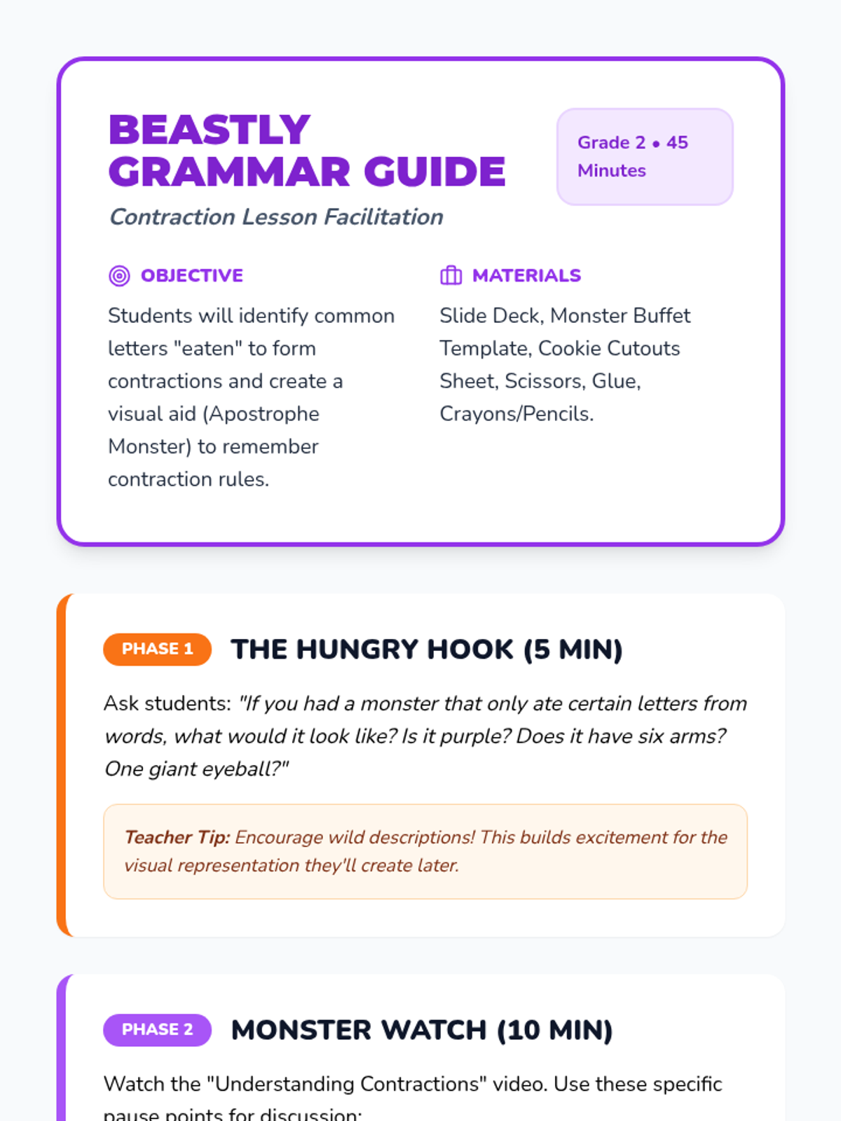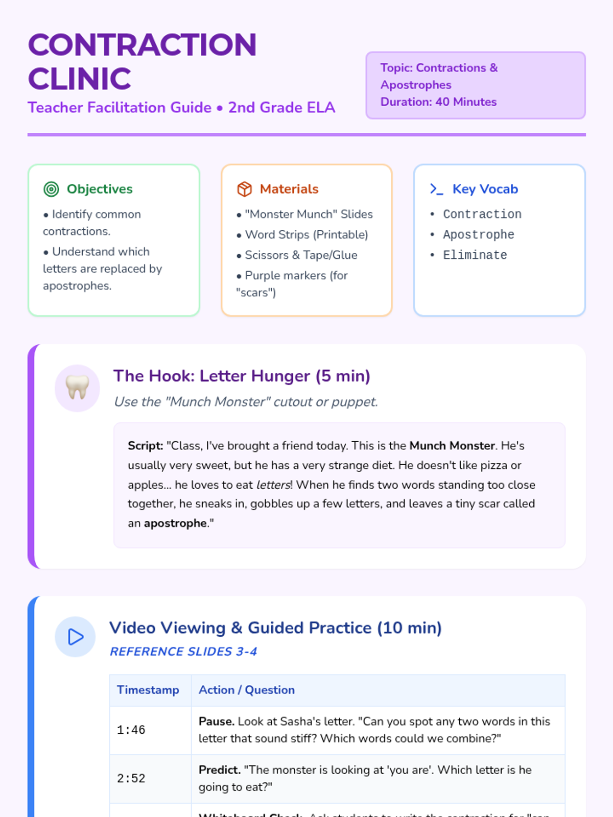 A 2nd-grade ELA lesson where students act as "word surgeons" to help a letter-eating monster create contractions. Includes a video hook, hands-on cutting activity, and guided discussion.