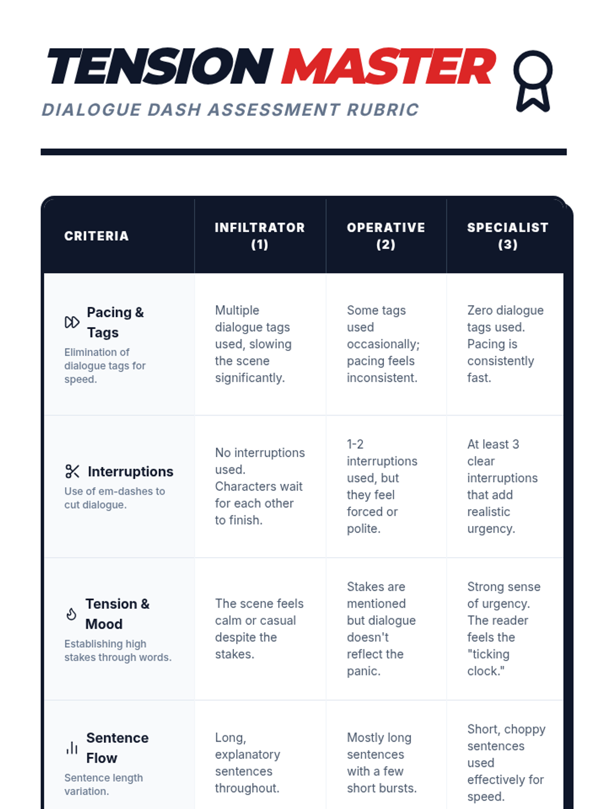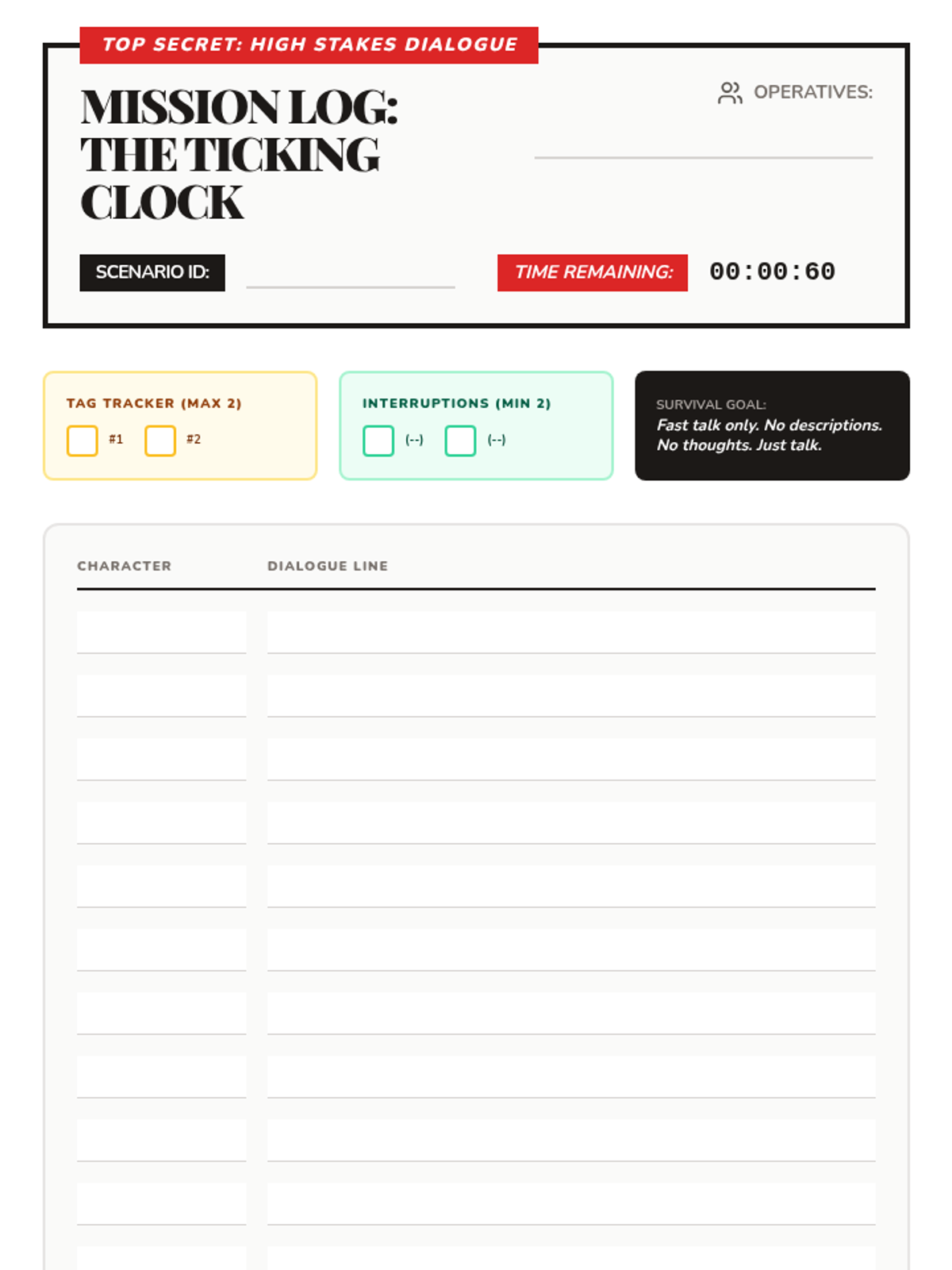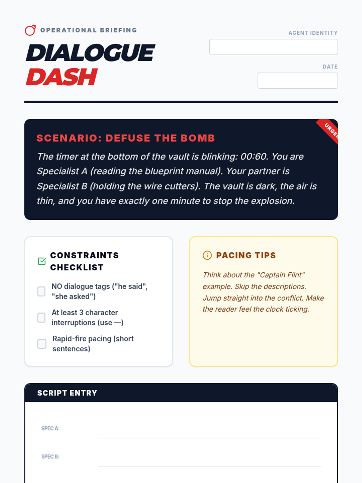 A fast-paced creative writing lesson where Grade 7-8 students master the art of rapid-fire dialogue to create tension. Students analyze video examples of pacing, practice tag-less dialogue, and script a high-stakes bomb defusal scene.