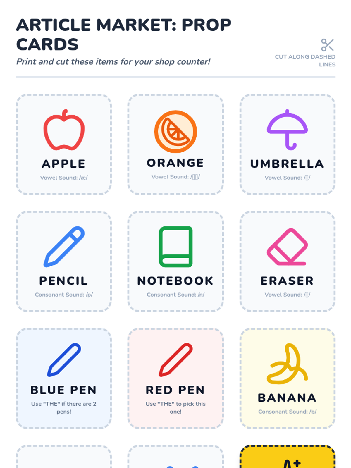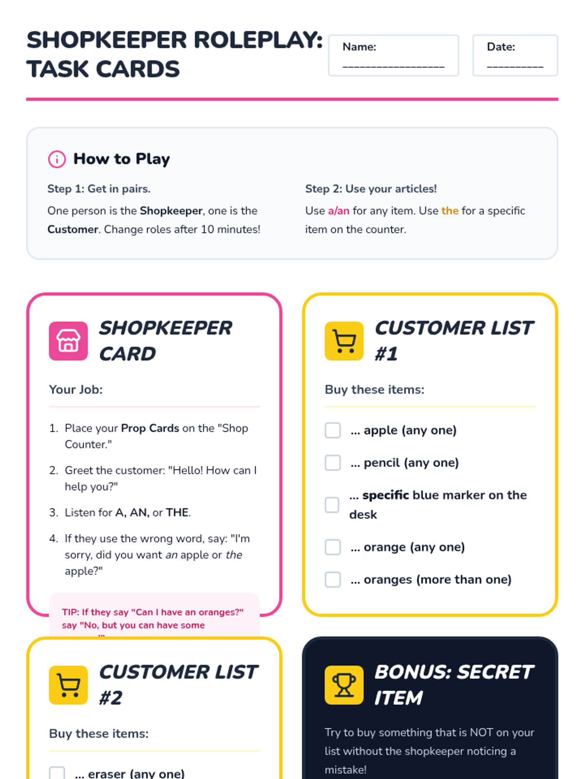 A lesson focused on English articles (a, an, the) through oral requests and a shopkeeper roleplay activity. Students learn to distinguish between specific and non-specific nouns and apply the vowel-sound rule for indefinite articles.