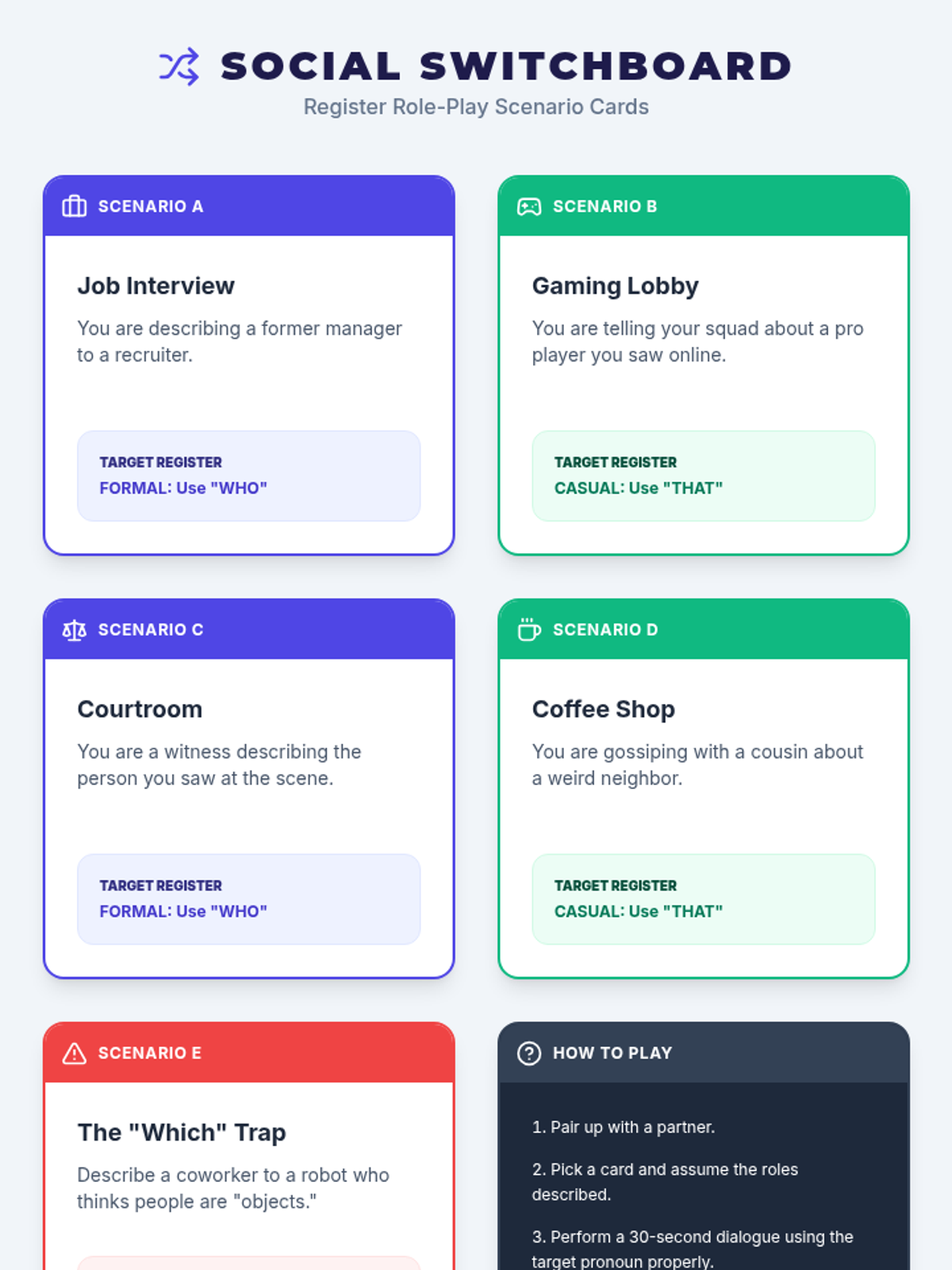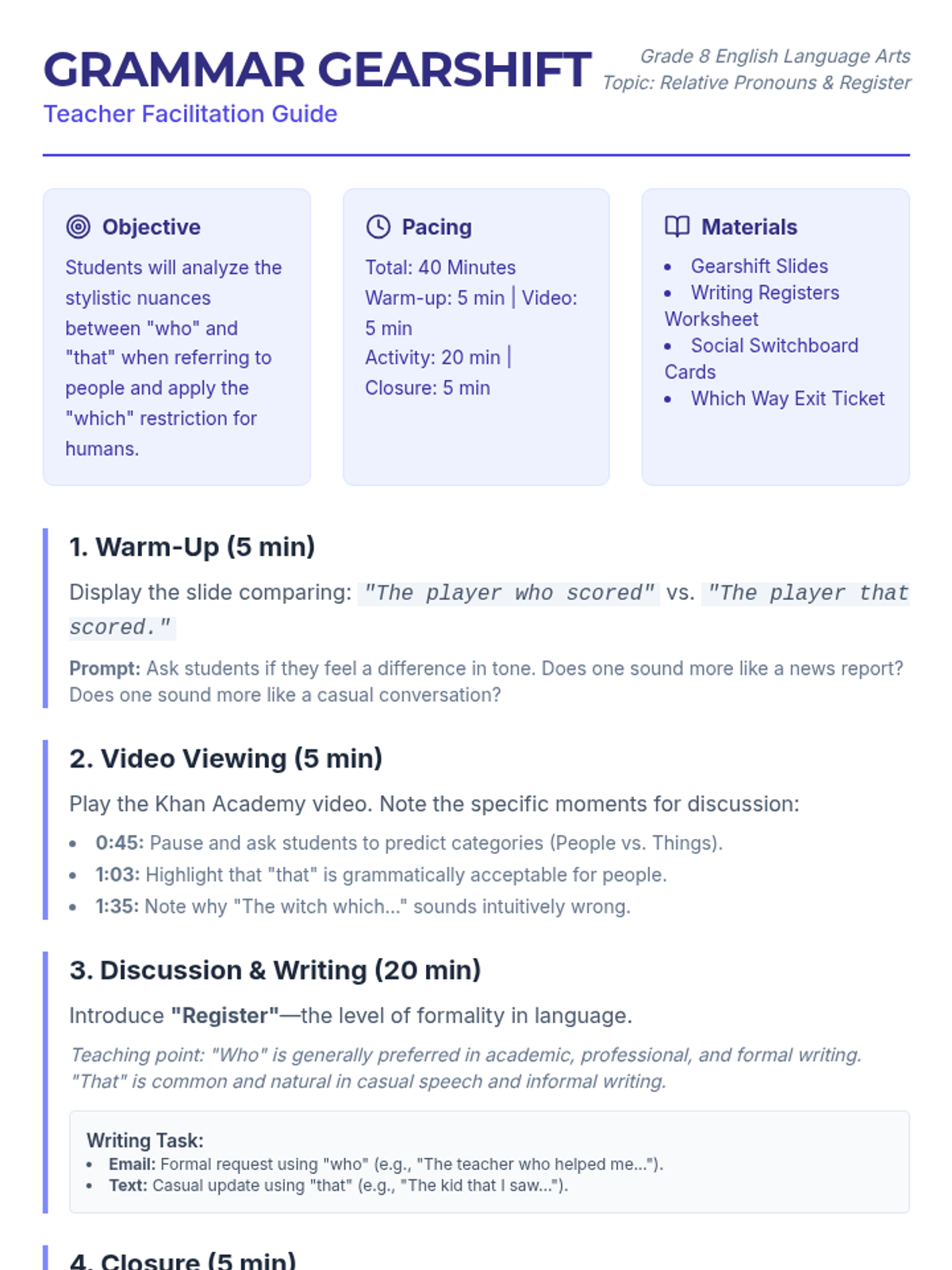 A lesson exploring the stylistic differences between 'who' and 'that' when referring to people, focusing on formal vs. informal registers and the 'which' restriction.