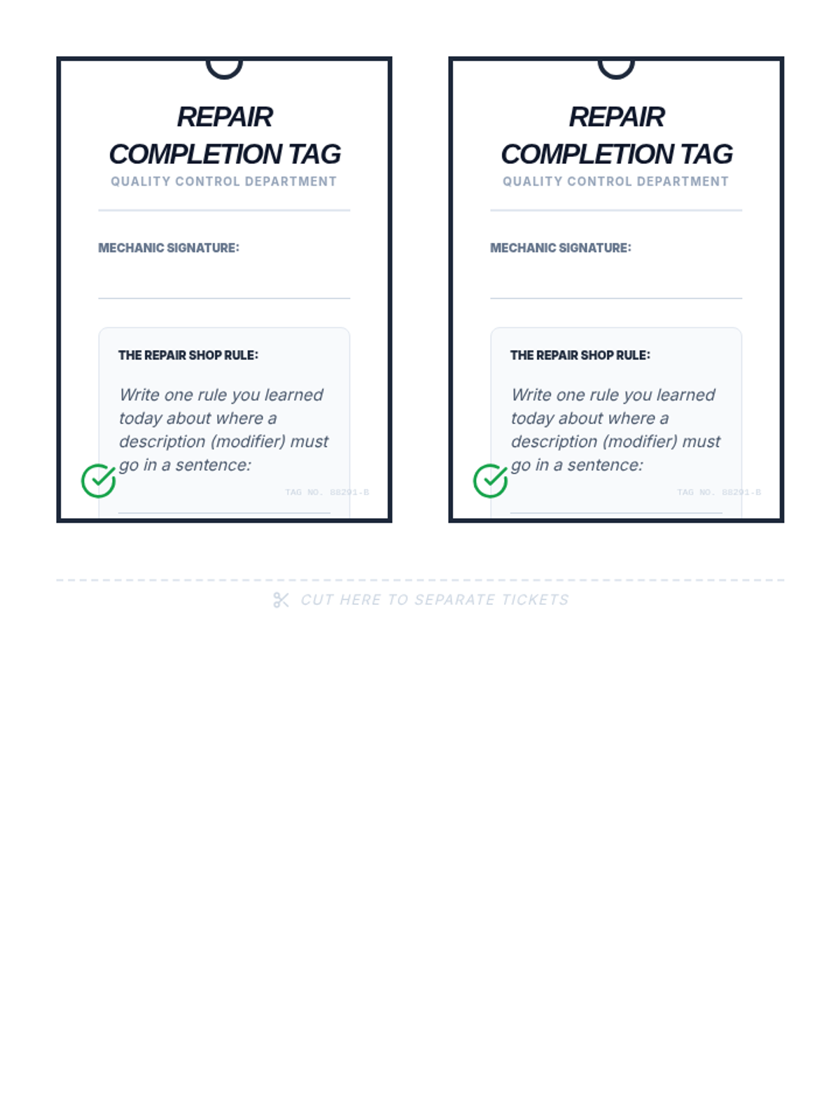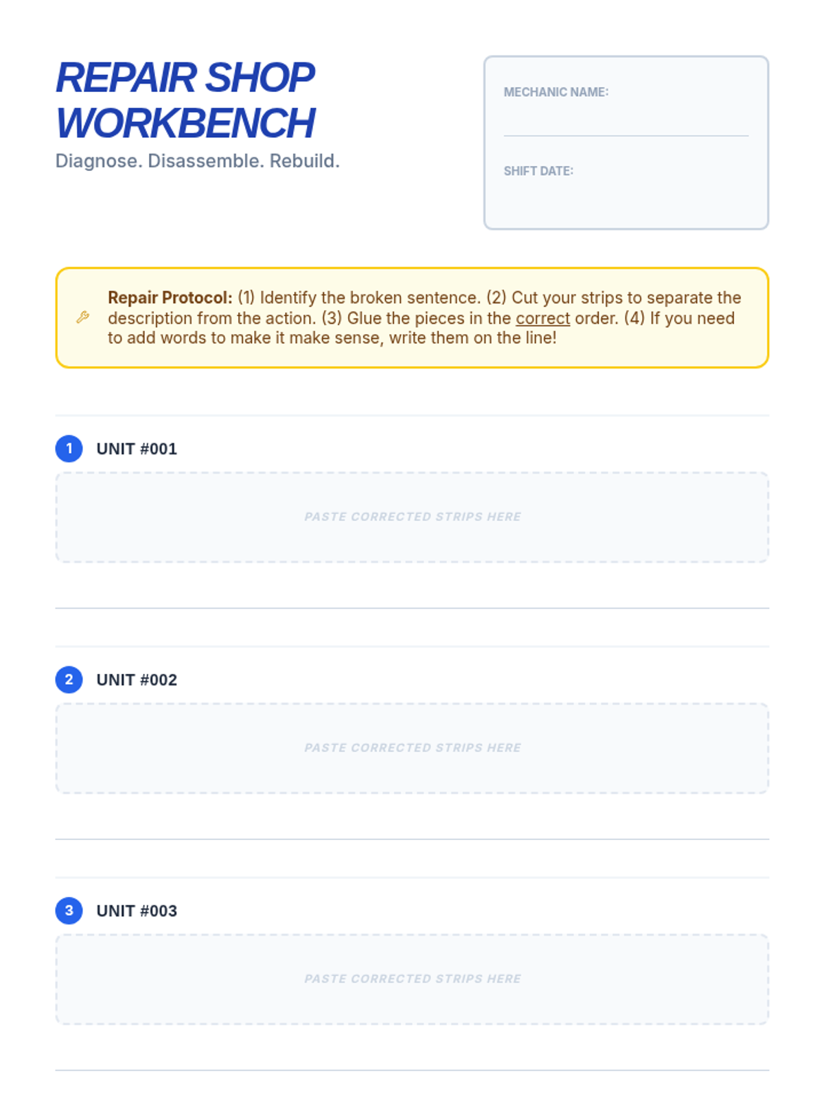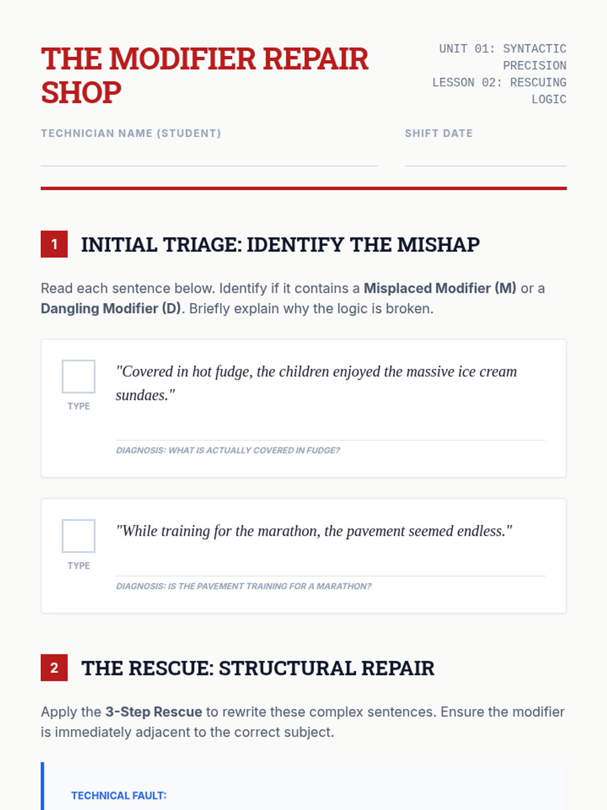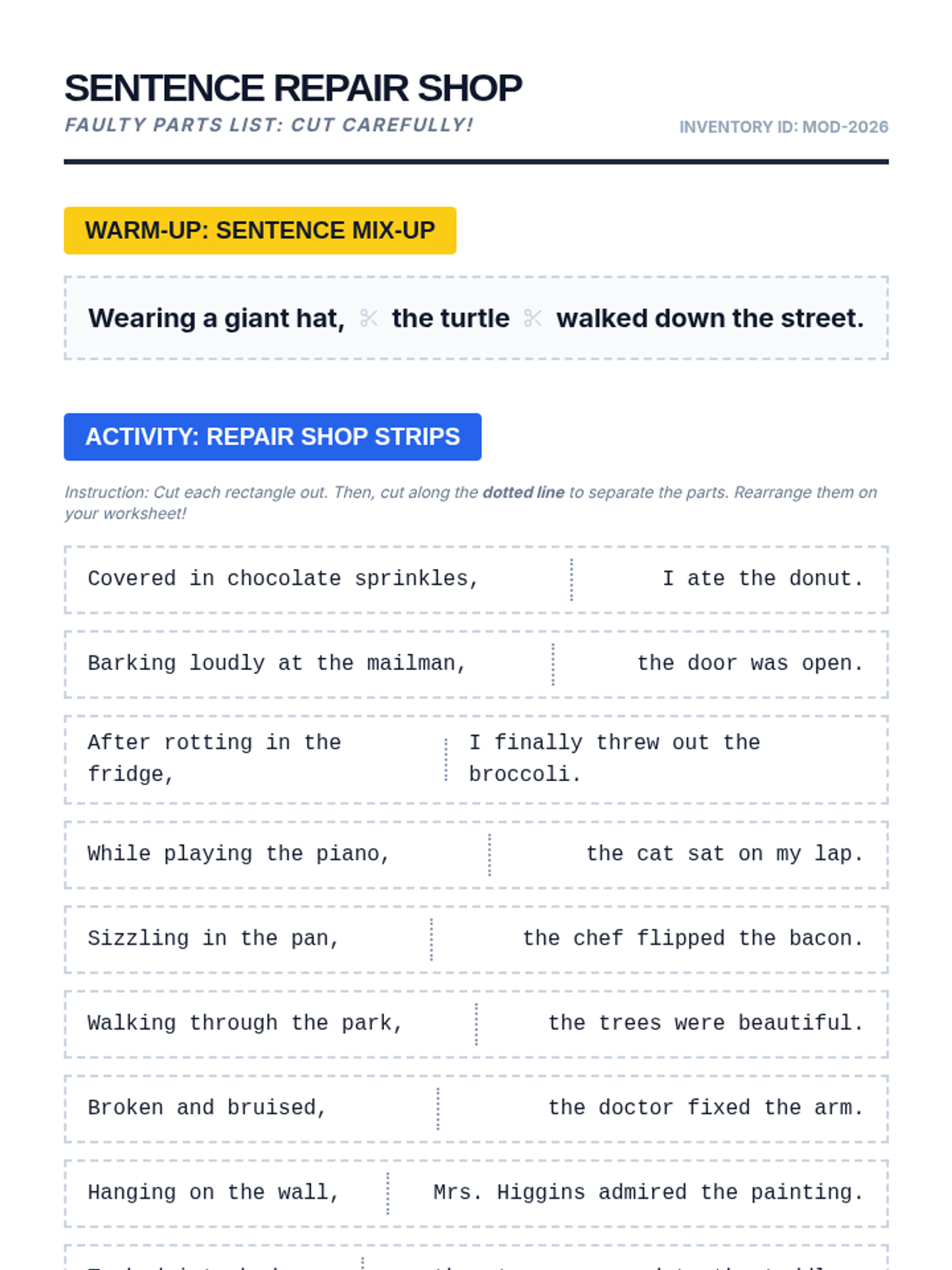 A hands-on grammar lesson where students diagnose and fix dangling modifiers using a 'repair shop' theme. Includes a warm-up, video analysis, and a tactile cut-and-paste activity.