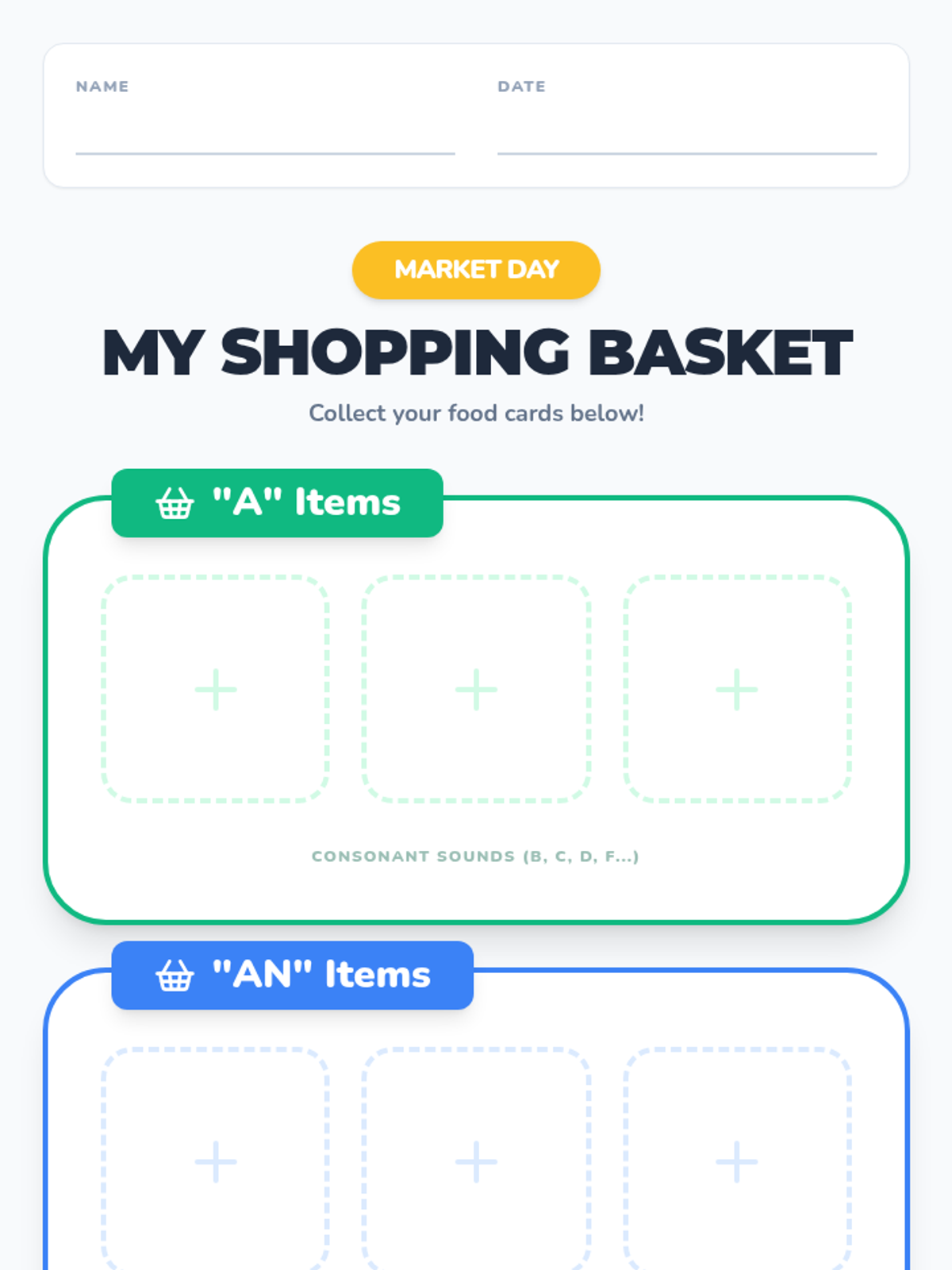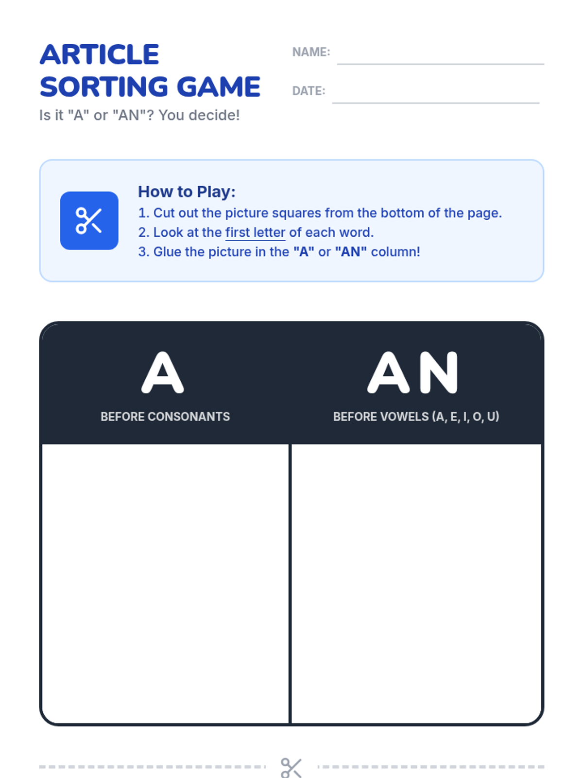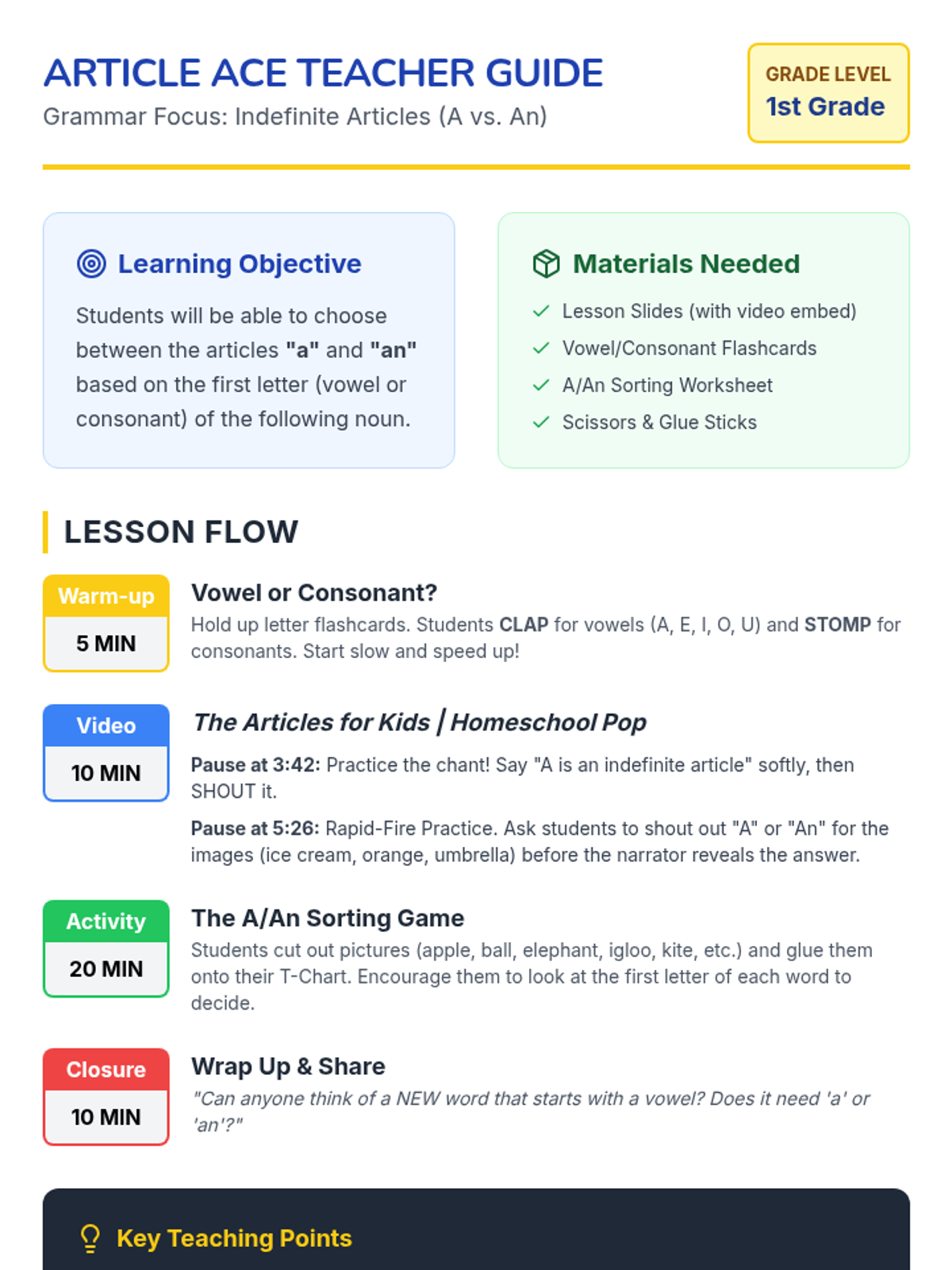 A high-energy 1st-grade lesson on using the indefinite articles 'a' and 'an' featuring a movement-based warm-up, an interactive video, and a tactile sorting activity.