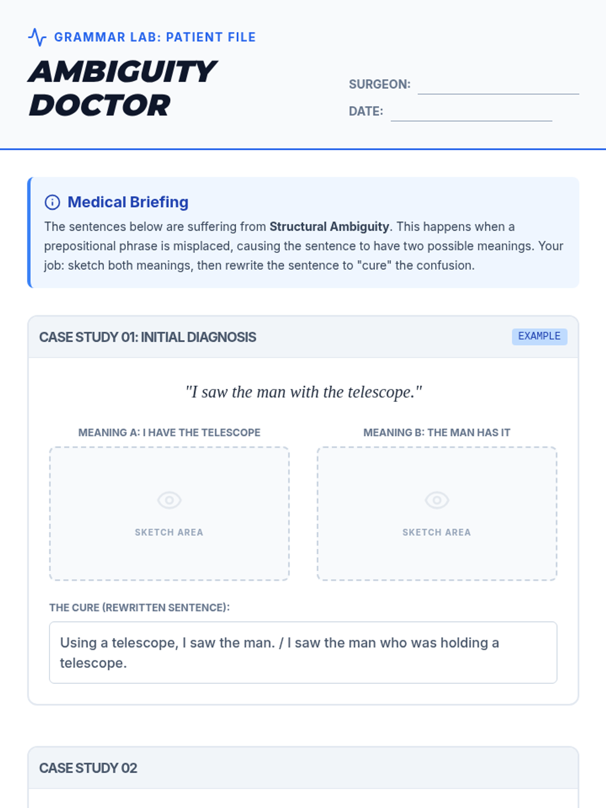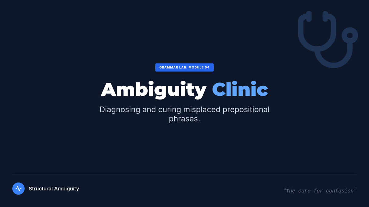 A 7th-grade grammar lesson focused on identifying and correcting structural ambiguity caused by misplaced prepositional phrases, featuring a 'Sentence Surgery' theme.