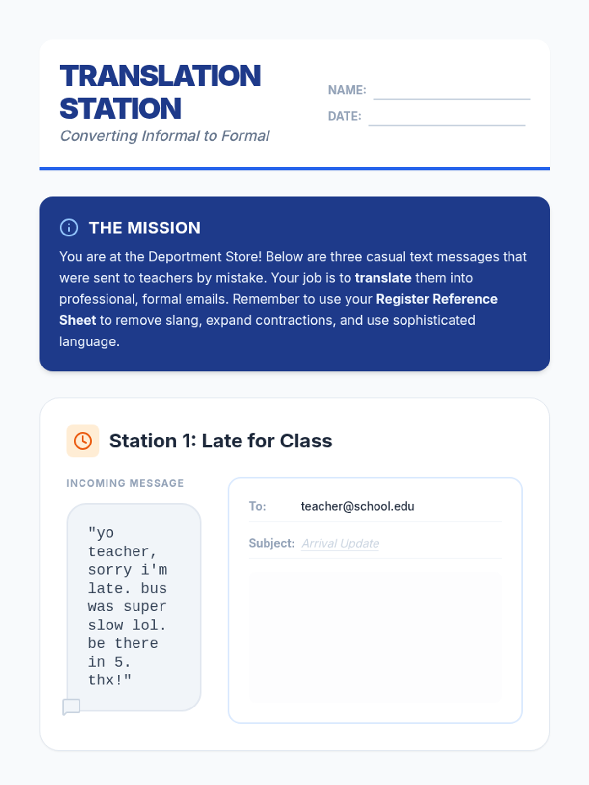 Students will learn the difference between formal and informal registers by analyzing text messages and emails. They will practice 'translating' slang-heavy, casual messages into professional, formal emails suitable for a school setting.
