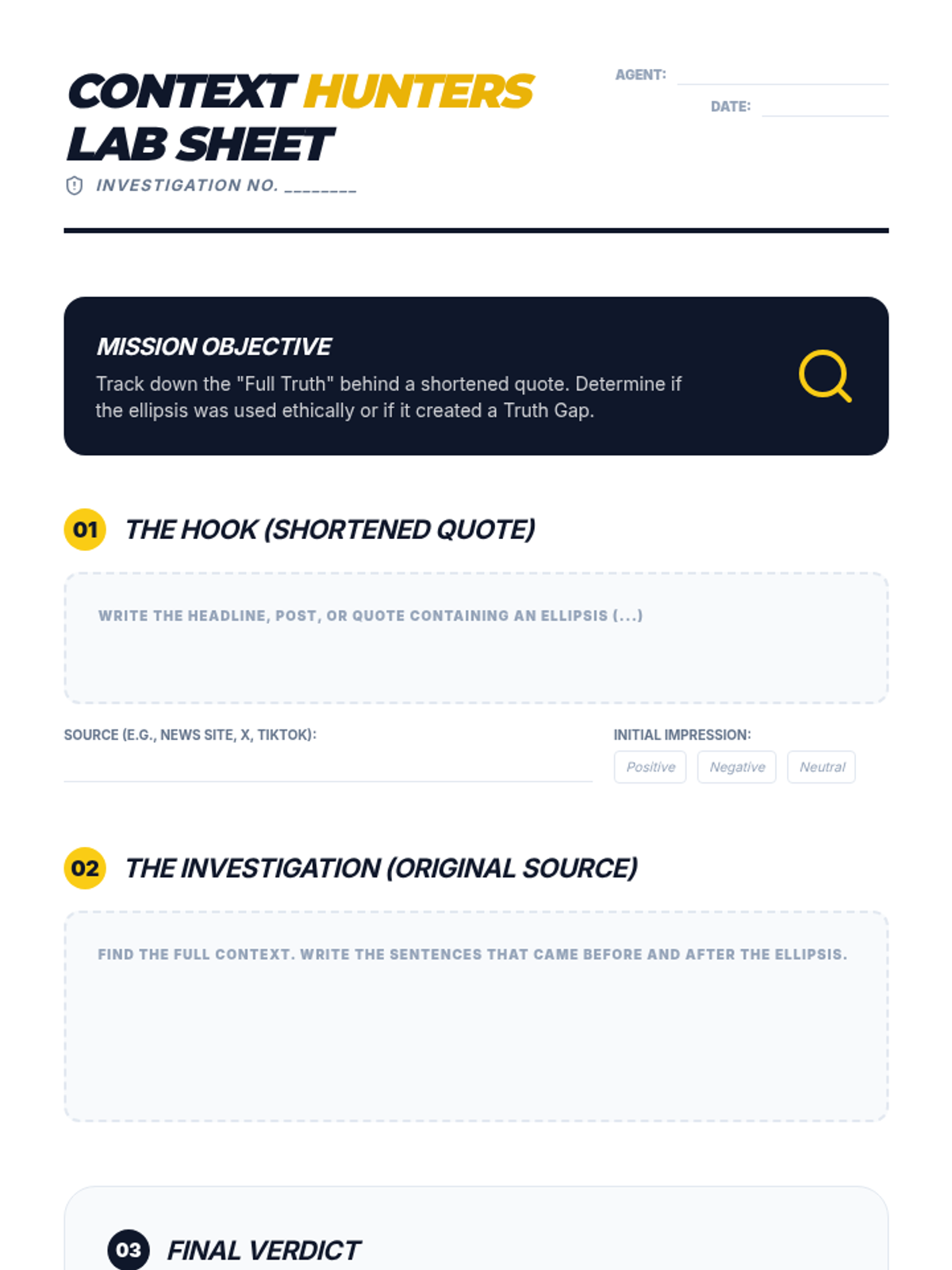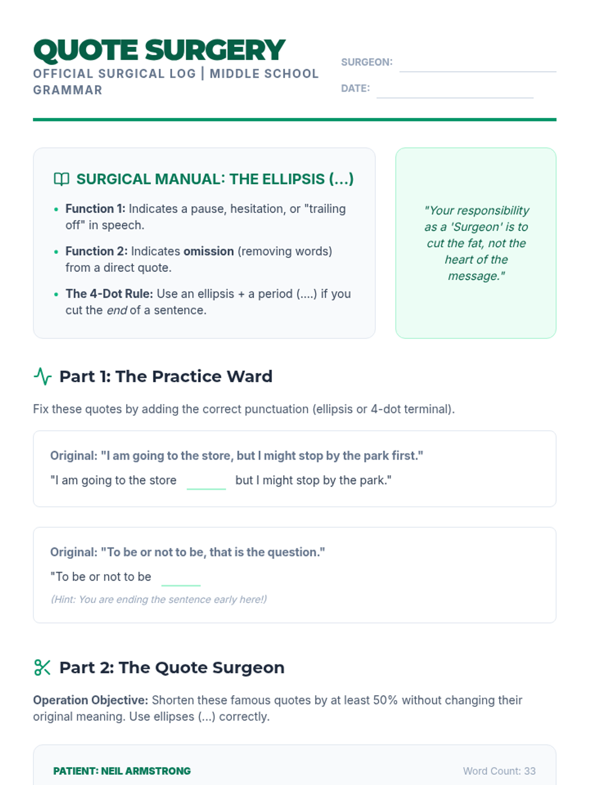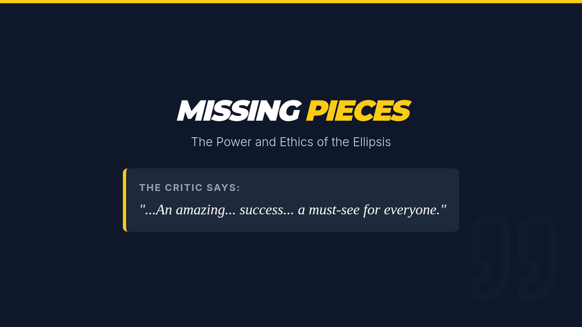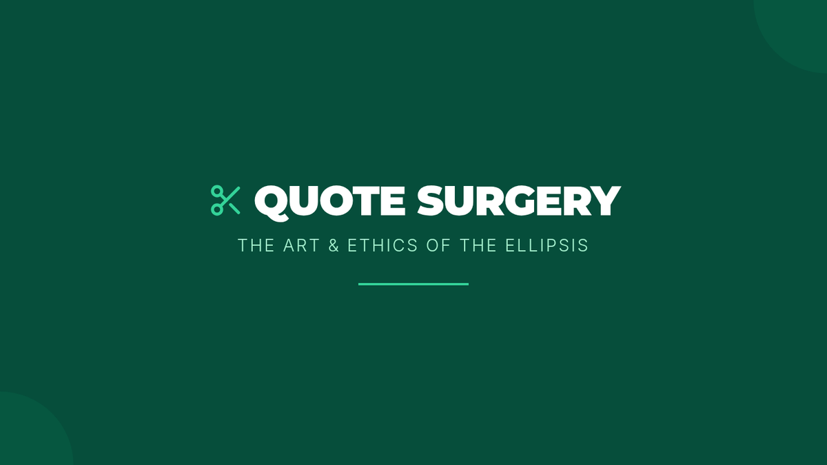 This lesson teaches students the mechanics and ethics of using ellipses. Students will learn to use the 'surgical' tool of the ellipsis to shorten quotes for brevity while maintaining the speaker's original intent, and explore the dangers of 'misrepresentation' through a creative unethical editing activity.