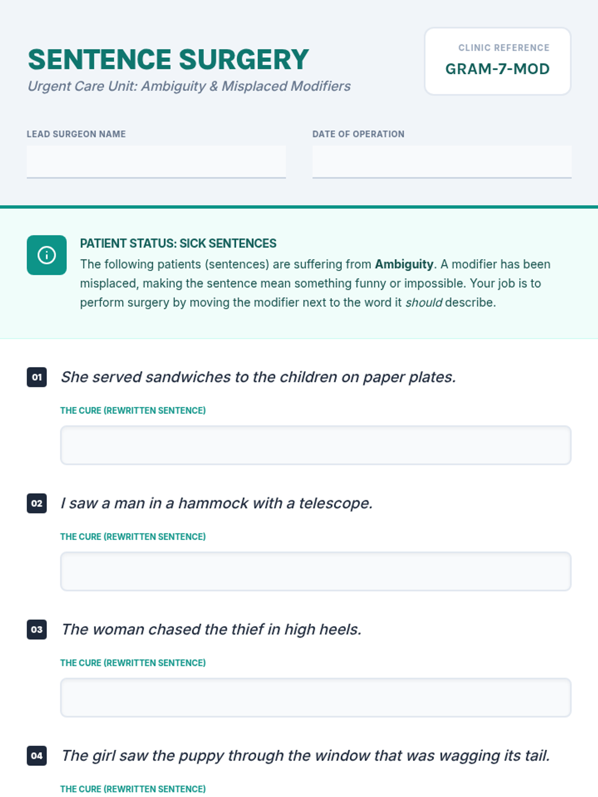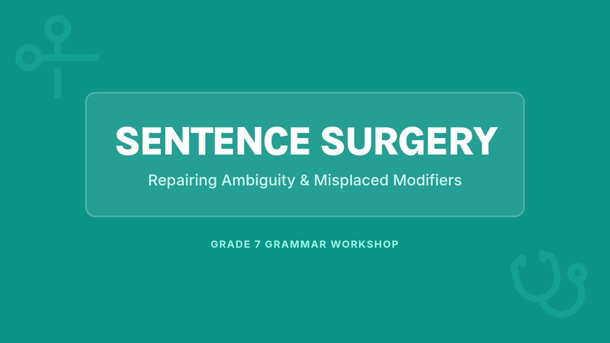 A 7th-grade grammar lesson focused on identifying and correcting misplaced modifiers to resolve ambiguity, featuring a 'Sentence Surgery' workshop and a creative illustration activity.