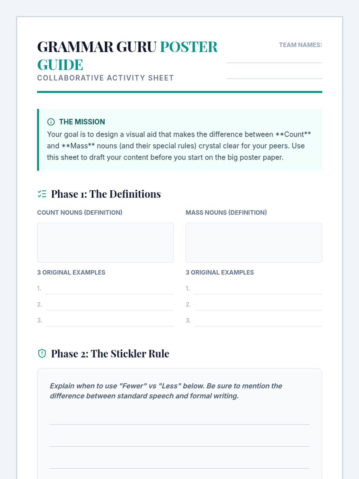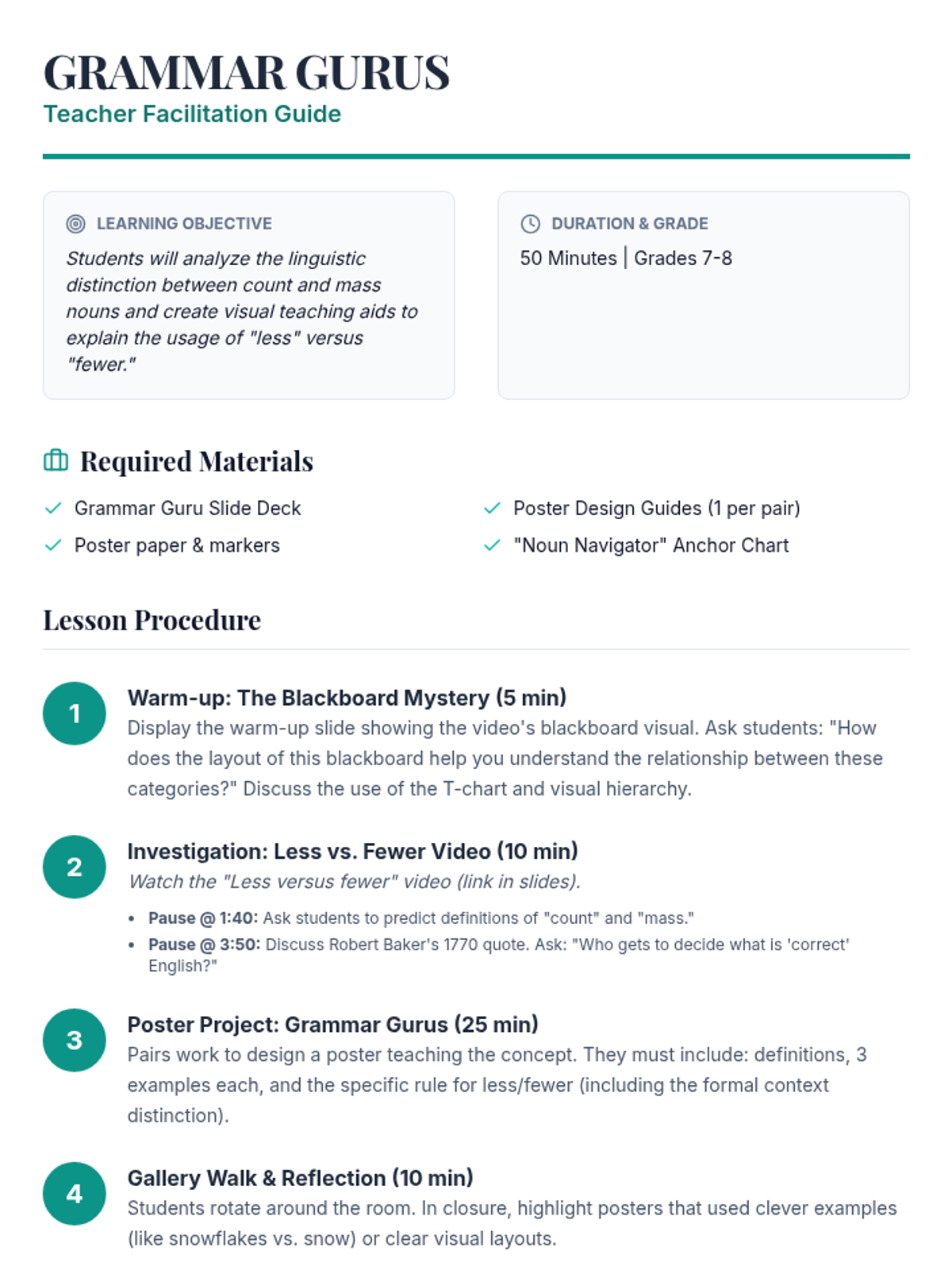 A grammar lesson for middle schoolers where they watch a linguistic debate and create instructional posters about Count vs. Mass nouns and the 'Less' vs. 'Fewer' rule.